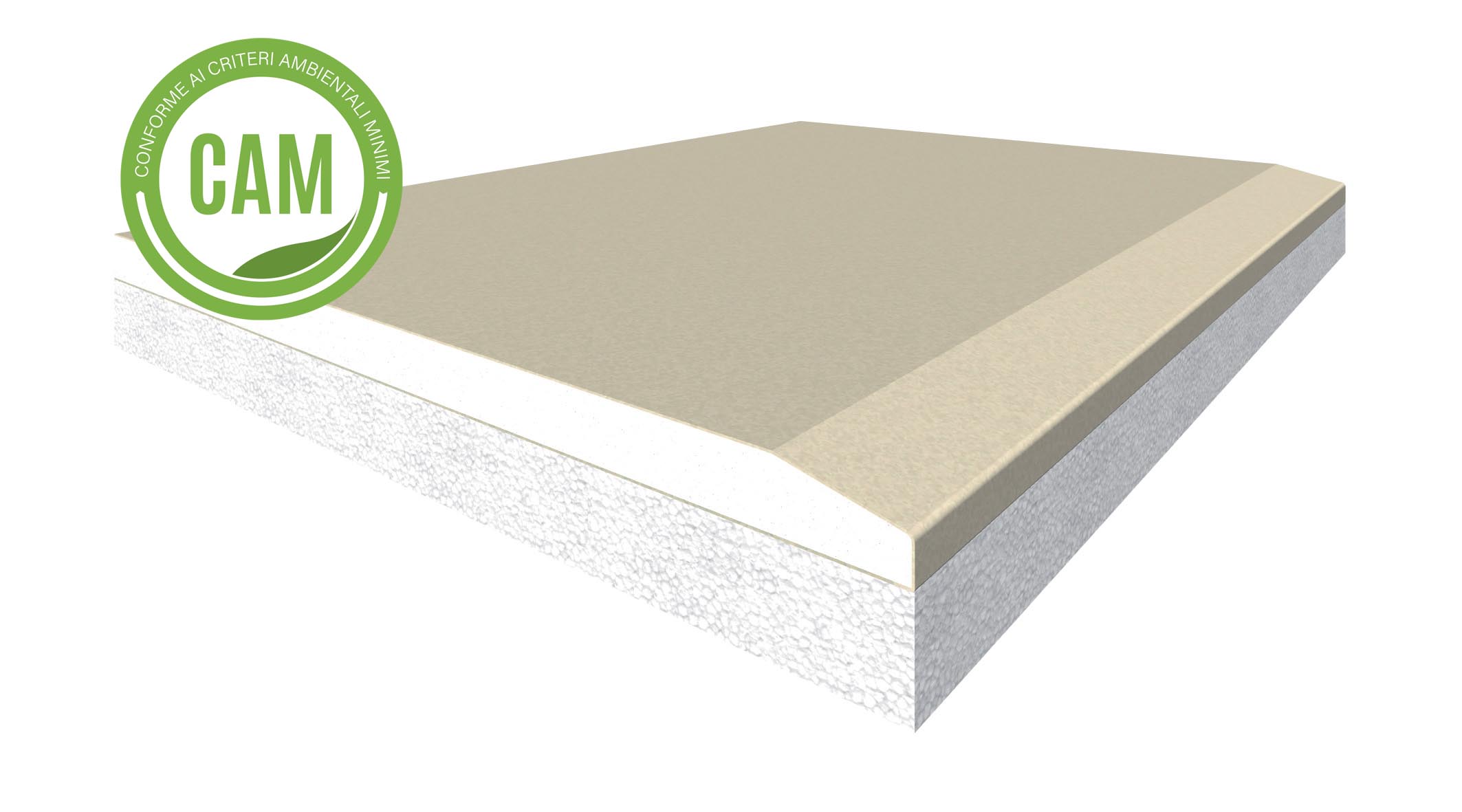 Platten auf deren Rückseite eine Dämmplatte aus expandiertem Polystyrol geklebt wurde (entsprechend der Norm EN 13163), mit einer Volumenmasse gleich 15 kg/m³ ± 8% und einer Wärmeleitfähigkeit Lambda gleich 0,036 W/mK: Platte wie Dämmplatte können jeweils unterschiedliche Schichtstärken aufweisen, und zwar je nach den systembedingten erforderlichen Eigenschaften.