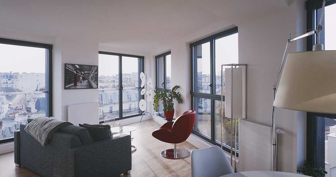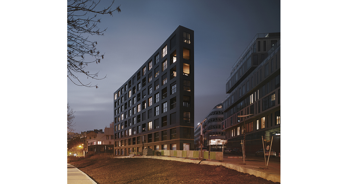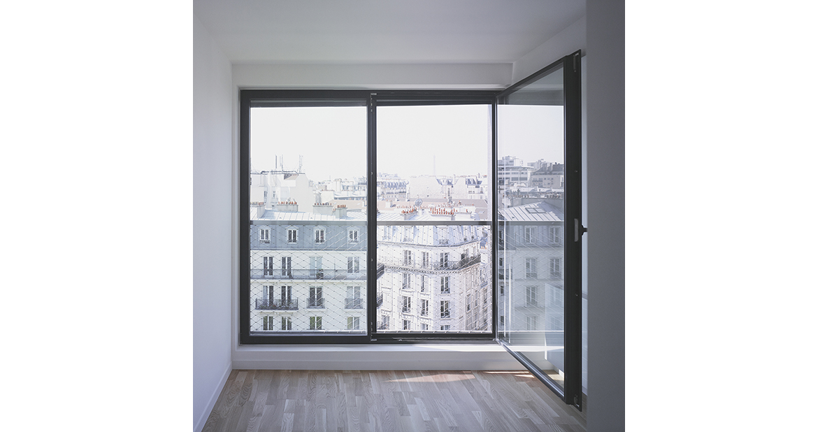 The building is the perfect extrusion for the triangular parcel, and its compactness limits the exchanging surfaces. The materiality, the choice of frames, and the thermal bridges all contribute to the building’s energy performance. The frame’s heat transfer coefficient is 1.4W/m².K, while that for the building is 0.831W/m².K. The project is Habitat & Environnement BBC Effinergie 2011 certified (CEP ≤ 65kWh/m²/year) and satisfies the requirements of the Paris Climate Plan (CEP ≤ 50kWh/m²/year).