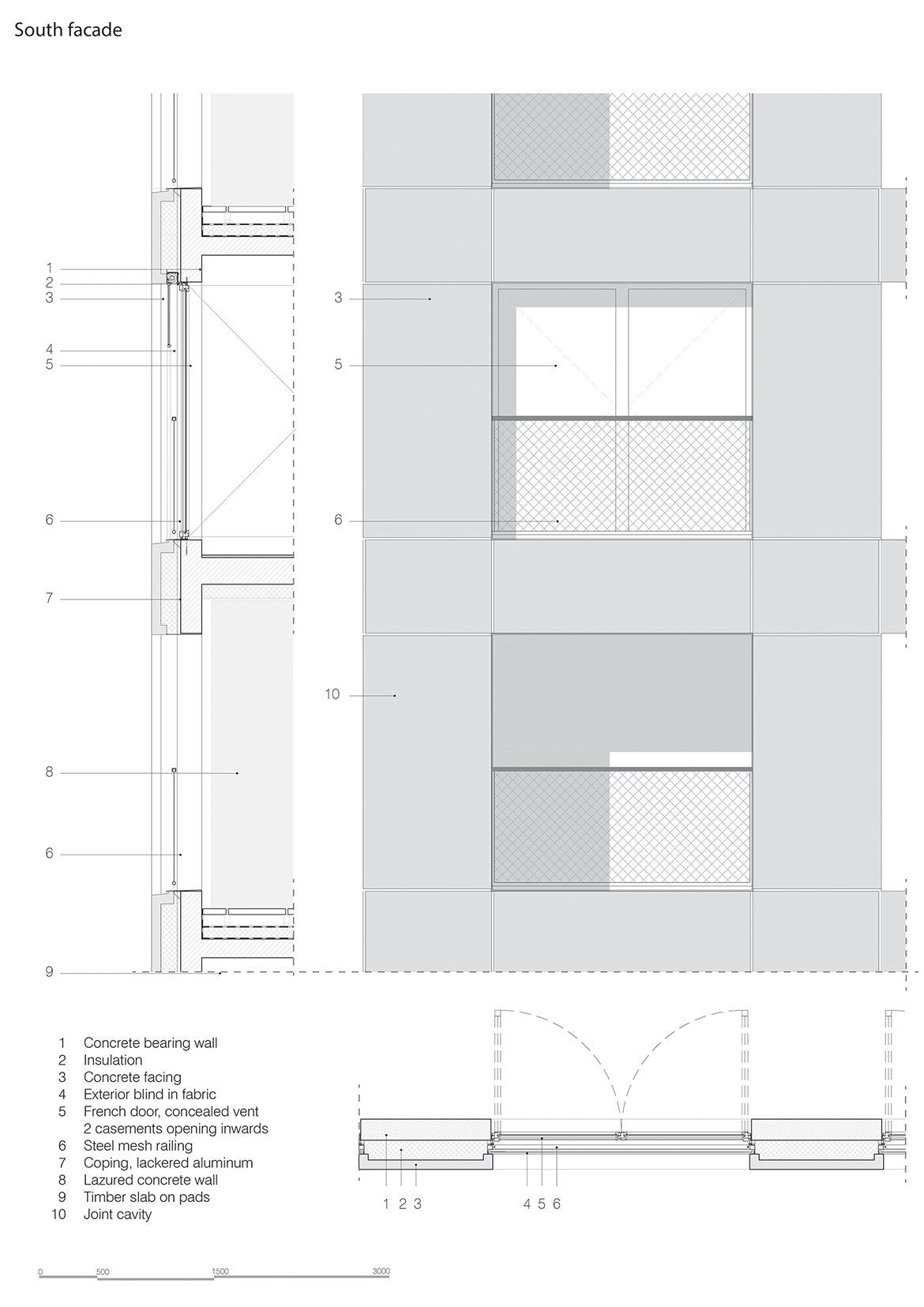 The mostly glass facades (with an exposure index of > 15%) increase the quality of use in terms of natural light and views, while the architectural distinction between the northern and southern facades compensates for the differences in needs for privacy and natural ventilation. The interplay of variations expresses itself in the windows’ positioning across the facade, which creates a projected shadow within, in the positioning of the stores, as well as in the materiality of the railing. The solar gain on the residential windows is less than 0.45 to the north and 0.25 elsewhere. Most of the apartments have a dual orientation, and are organized around a large loggia, which improves ventilation by allowing air to penetrate the building’s interior uniformly. The dual flow air handler also creates energy savings by using a high performance exchanger to recover heat from the air vented from the kitchens and bathrooms.