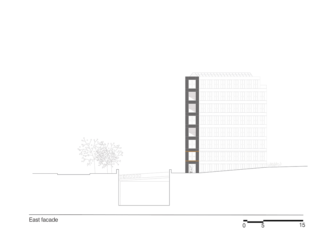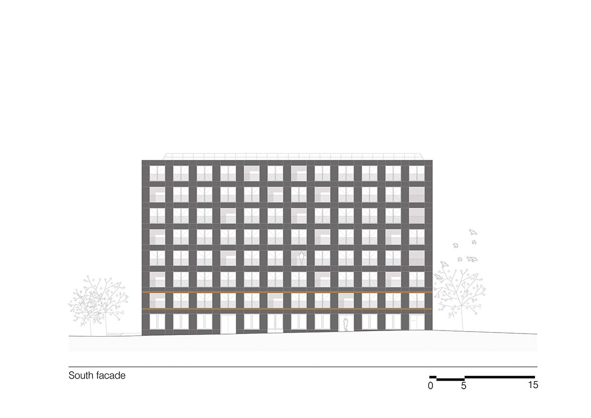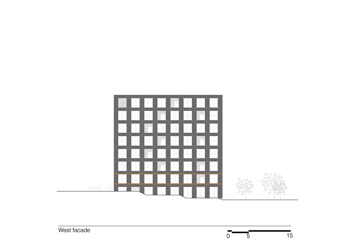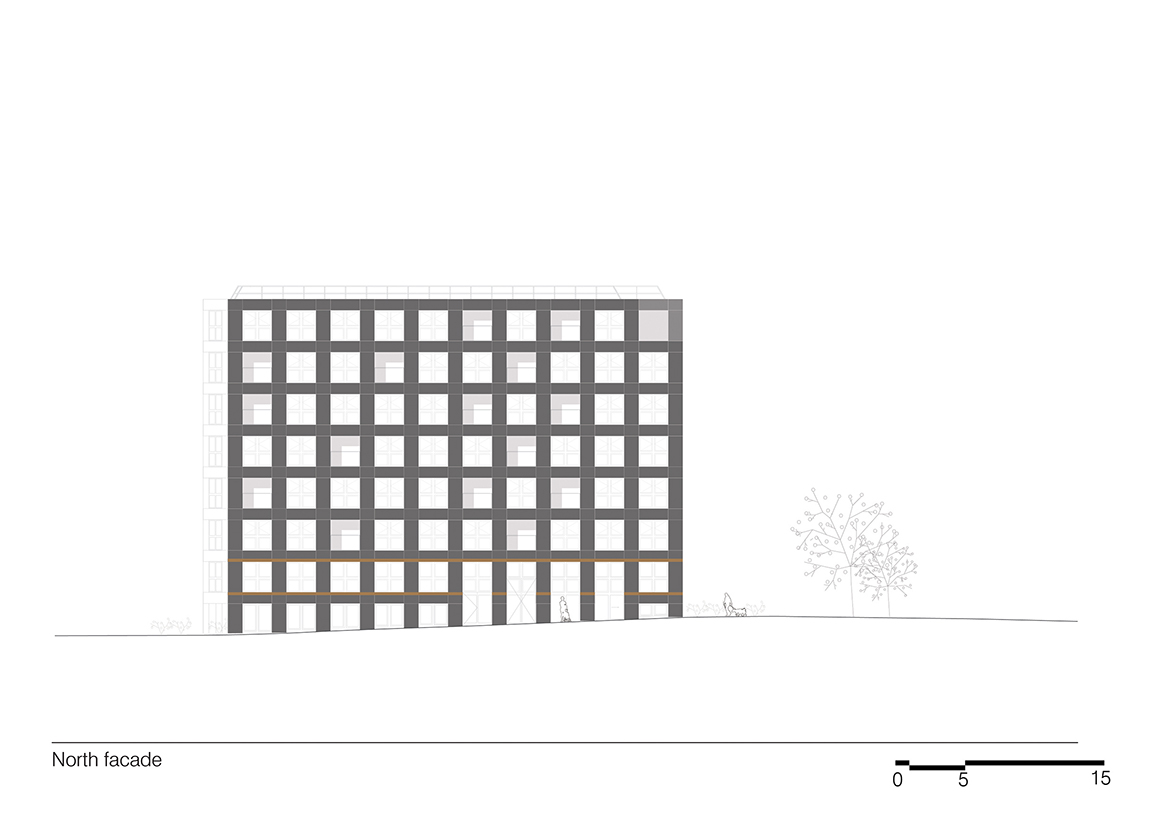Emptiness becomes an abstraction in this project. While its volume fully exploits all the site’s possibilities, the project’s flexibility introduces the idea that emptying architecture of its program allows the building to generate potential, which will accompany the city’s evolution and more readily respond to changes in usage. The project aims to exceed the original commission by providing a ready reversibility between residential and office spaces. Not only does the configuration of the load-bearing structure facilitate the modification of the interior layouts, but the dimensions and regularity of the façade openings create an overall image of the building that does not over-determine its allocation.