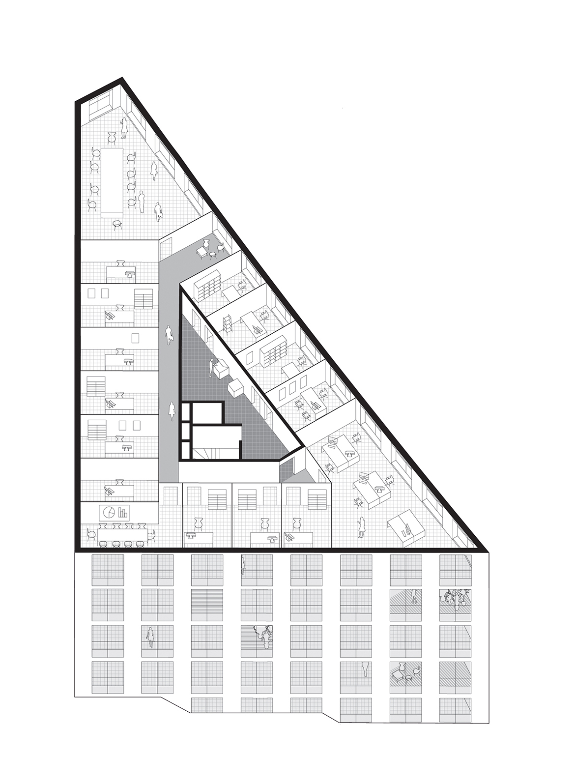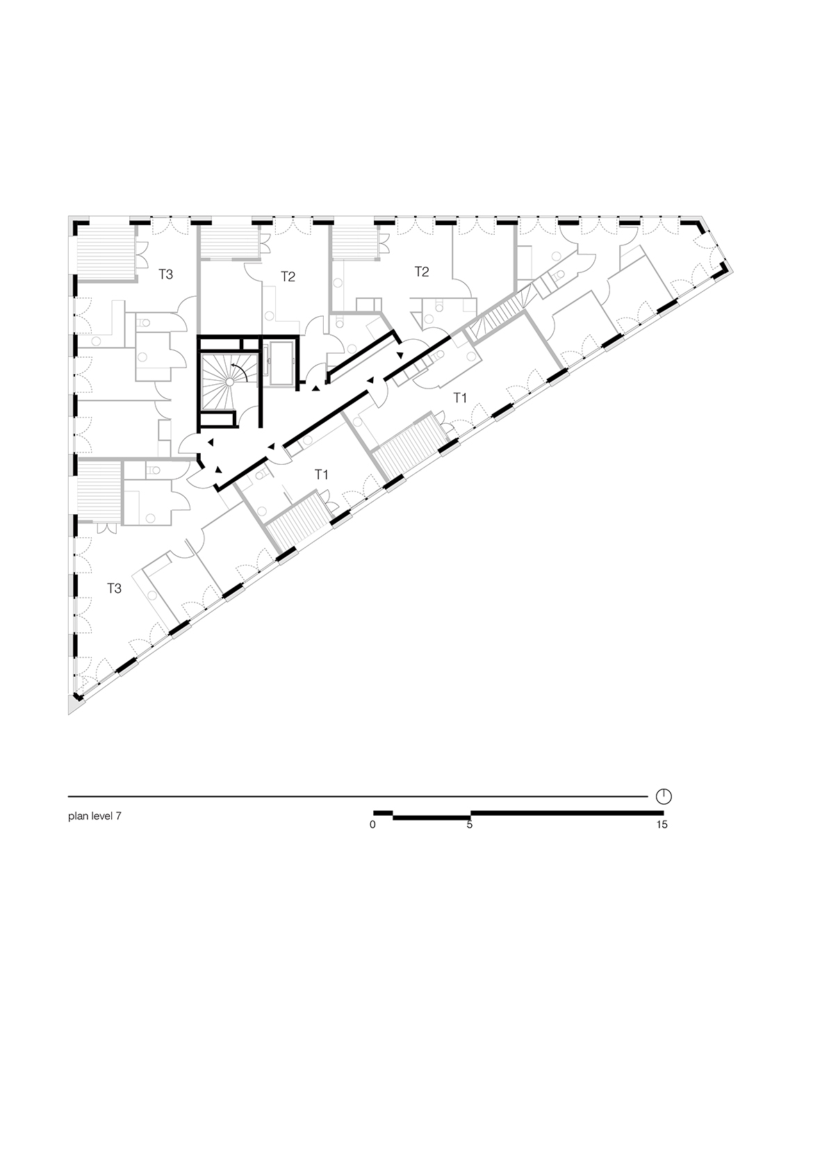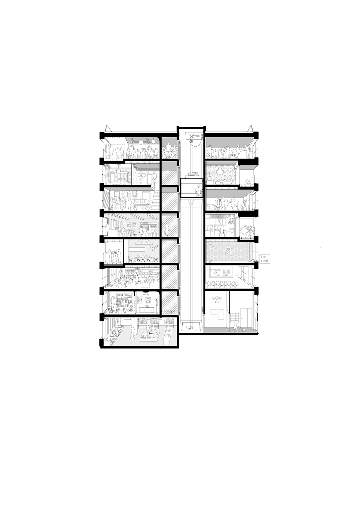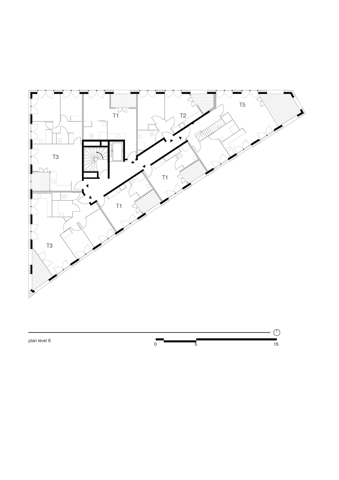 Emptiness becomes an abstraction in this project. While its volume fully exploits all the site’s possibilities, the project’s flexibility introduces the idea that emptying architecture of its program allows the building to generate potential, which will accompany the city’s evolution and more readily respond to changes in usage. The project aims to exceed the original commission by providing a ready reversibility between residential and office spaces. Not only does the configuration of the load-bearing structure facilitate the modification of the interior layouts, but the dimensions and regularity of the façade openings create an overall image of the building that does not over-determine its allocation.