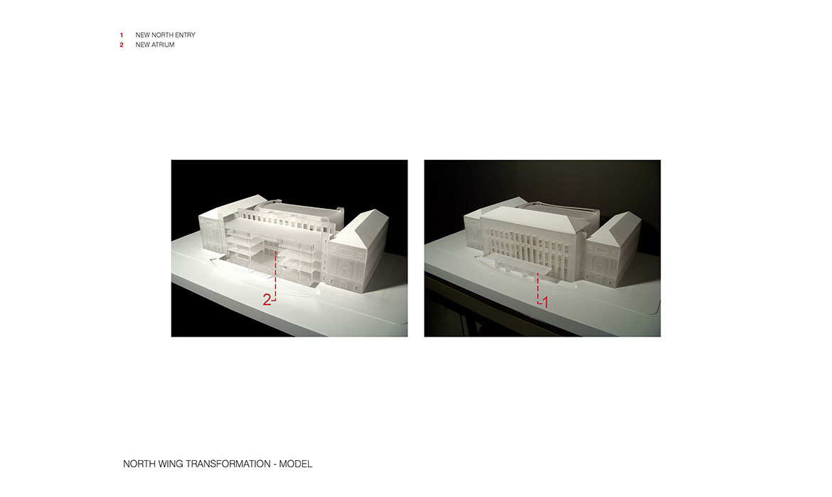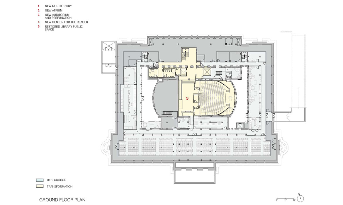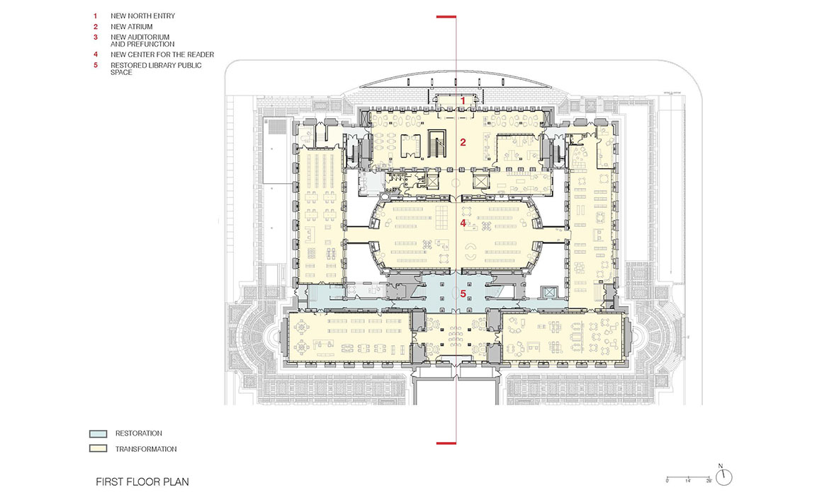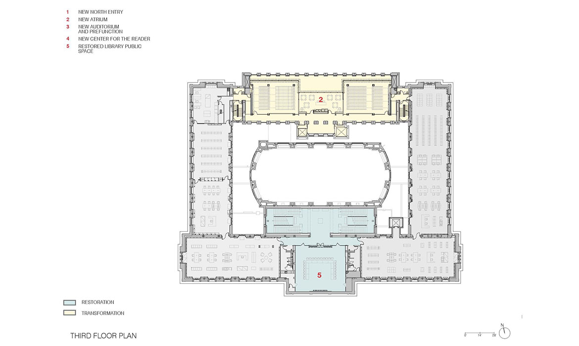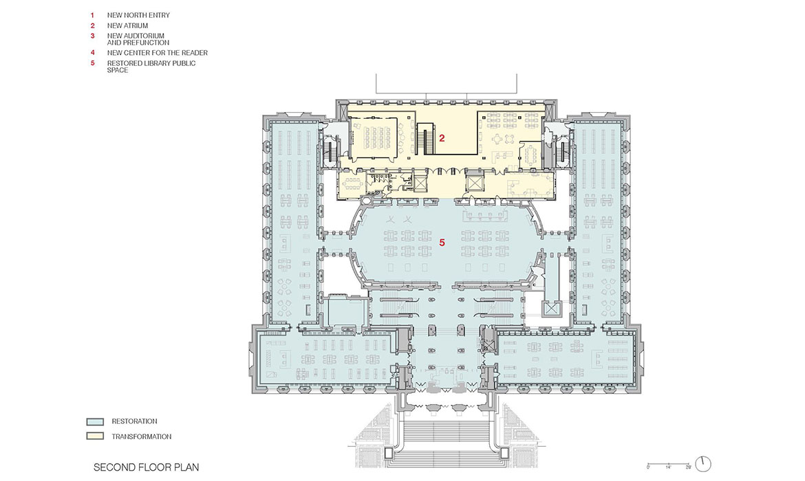 La trasformazione è avvenuta nell’Ala Nord. Le cataste di libri sono state spostate e un nuovo “edificio all’interno dell’edificio” è stato inserito, questa volta un atrio pubblico a piu’ piani. Per far fede all’intento originario di Gilbert, le “piattaforme galleggianti” che circondano il nuovo atrio non toccano i muri interiori dell’ala nord. I livelli inferiori dell’atrio sono aperti al pubblico mentre quelli superiori ospitano le raccolte di libri consultabili solo dallo staff. Questi libri, che ricordano le collezioni antiche cui ora il pubblico può accedere, sono diventati un elemento importante del complesso. Un tetto a volta e sistemi d’acqua caratterizzano il nuovo ingresso pubblico dell’Ala Nord. Come atto di rispetto verso Cass Gilbert, la nuova struttura è stata costruita in modo da non toccare l’edificio.