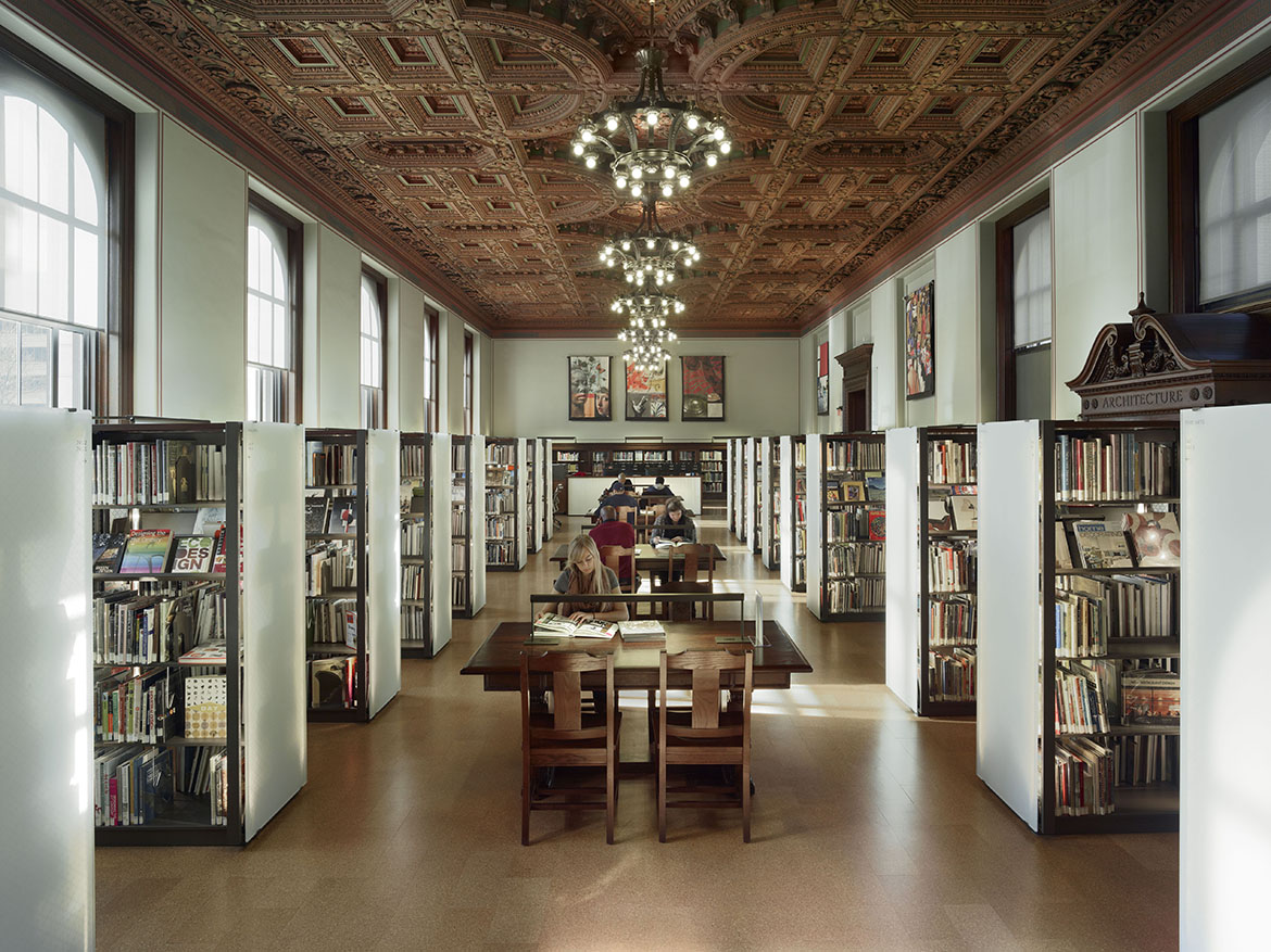 Il design dell’edificio, che si eleva su tre piani, si rifa’ allo stile rinascimentale. Una scalinata cerimoniale, affacciantesi su Olive Street, conduce alla reception da cui i frequentatori accedono al Grande Androne Centrale. L’androne è circondato da quattro ali, di cui tre ospitano le stanze per la lettura pubblica mentre la quarta, l’Ala Nord, è sede di uno spazio per la raccolta di libri a più piani e chiuso al pubblico. La facciata dell’ala nord, discostandosi dallo stile rinascimentale, è adornata da una serie di alte finestre. Un’intelaiatura d’acciaio, strutturalmente indipendente, è stata inserita da Cass Gilbert tra le mura dell’ala nord. Questo “edificio all’interno dell’edificio”, nel quale sono raccolti i libri, è stato sostituito. Inoltre, un deposito di carbone e una stanza per la caldaia nel livello inferiore hanno offerto lo spazio per un auditorium di 250 poltrone e una nuova stanza per la lettura.