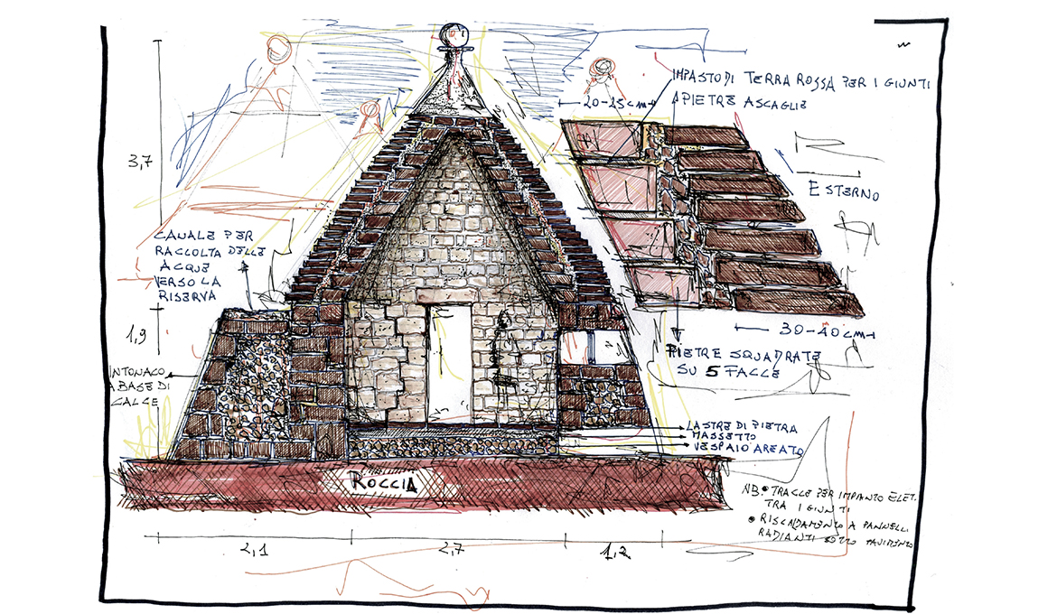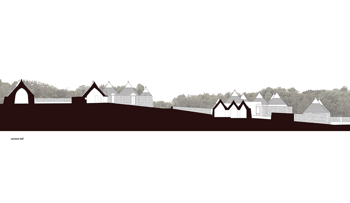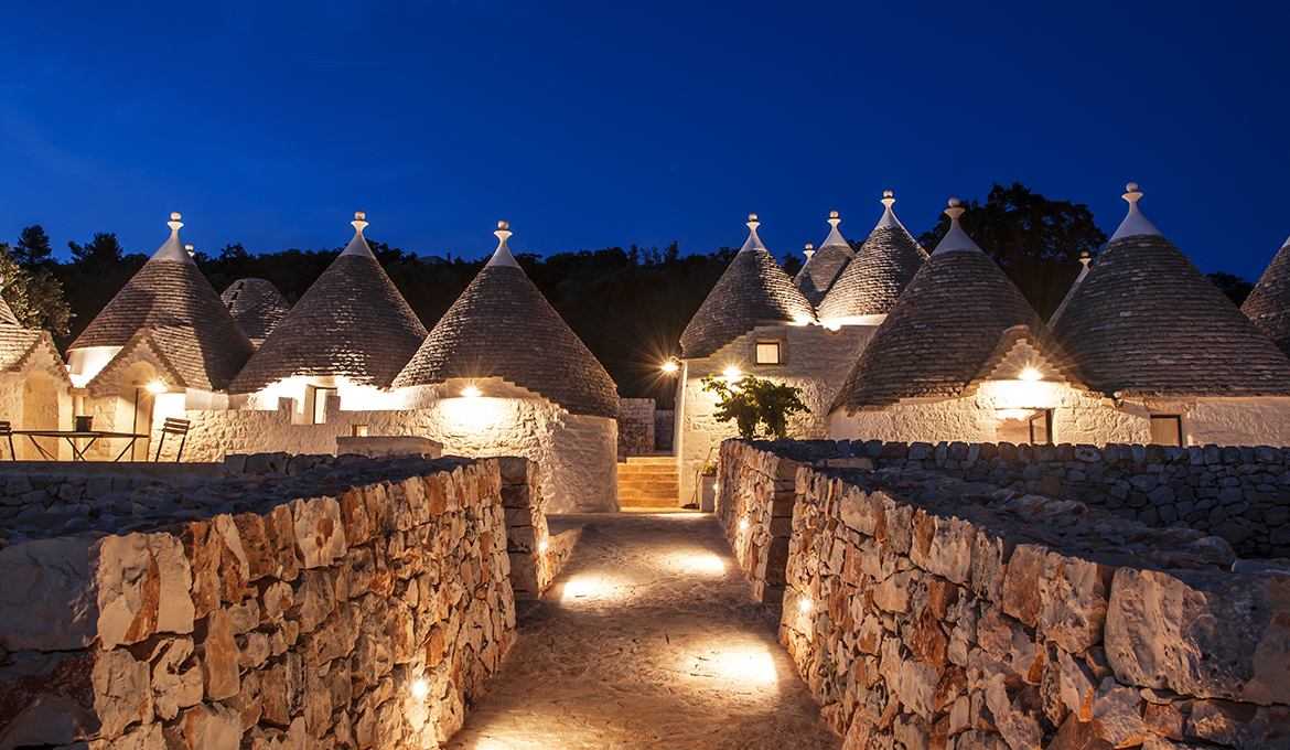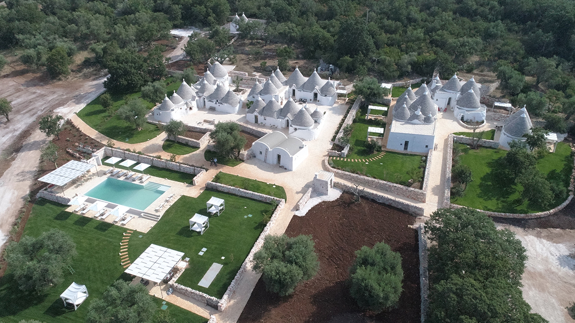 I materiali scelti sono semplici e ricalcano la storia che ha profondamente caratterizzato il territorio della Valle d’Itria, rendendolo unico al mondo e appartengono alla tradizione architettonica pugliese, quali la pietra, la calce, il ferro ed il legno, trattati seguendo l’identità storica del borgo. Il ferro, con la sua durezza e le linee essenziali, contrasta con il bianco candido dei trulli, conferendo al borgo quell’atmosfera tipica del territorio.