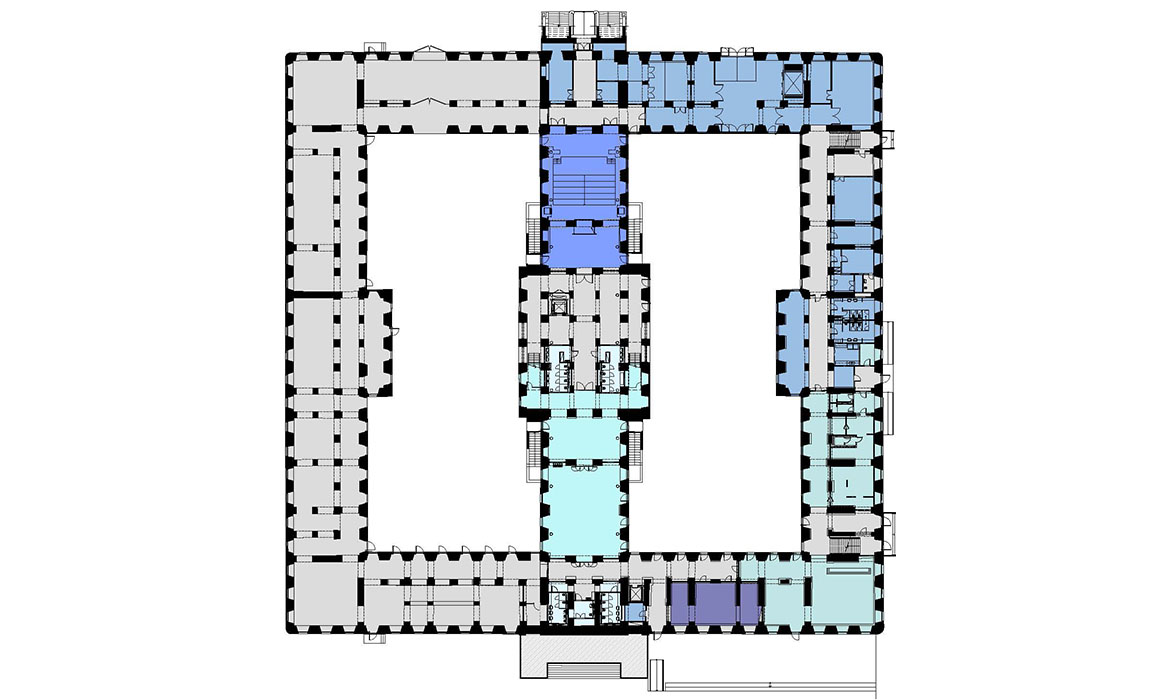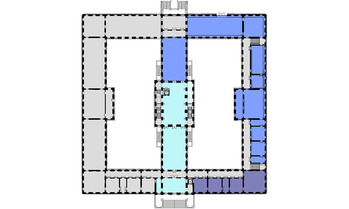 Il complesso architettonico che occupa un’area costruita di circa 12.000m² , ha una pianta quadrata composta da due ali che sviluppano attorno a due cortili rettangolari, favorendo l’illuminazione e la ventilazione delle spazi interne. Una successione lineare di stanze unite da corridoi – “enfilade” – definisce la pianta interna dell’edificio.