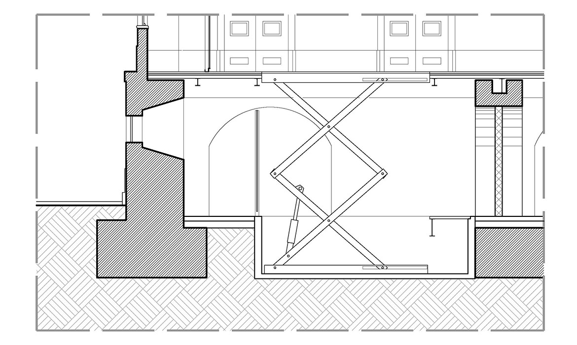 Per l’accesso delle opere d’arte è stata installata una piattaforma nella hall di servizio e, per le opere più grandi viene mantenuta un’apertura nella facciata sud, che consente il passaggio diretto al primo piano, senza limitazione di altezza del pianterreno.