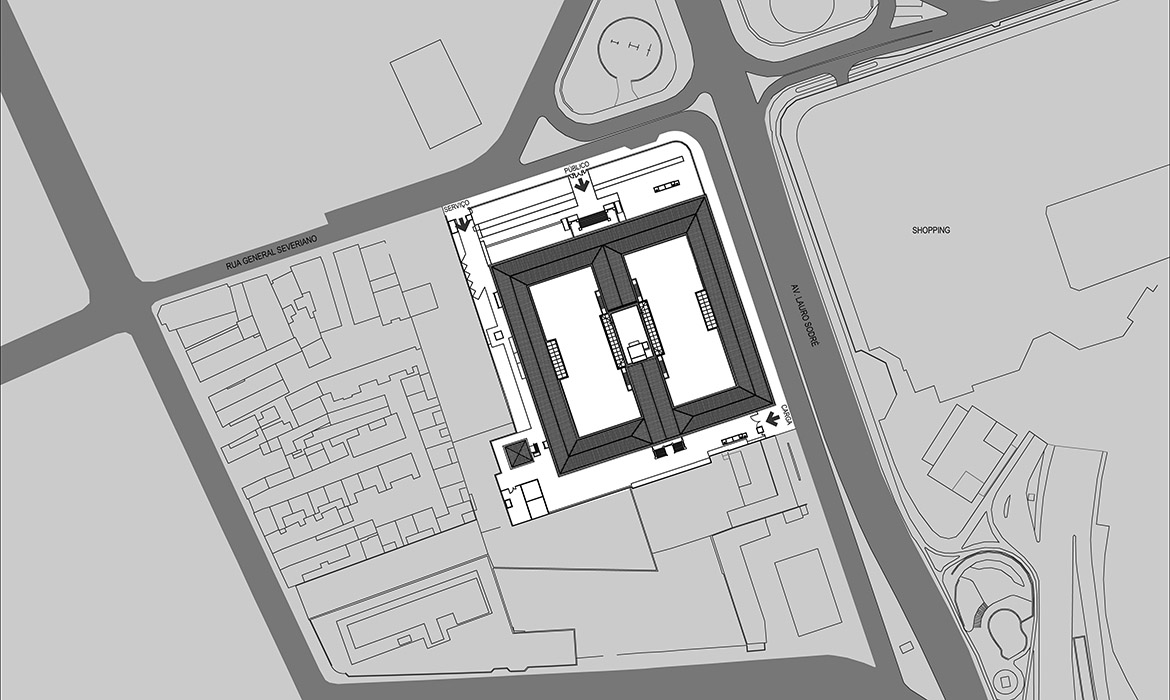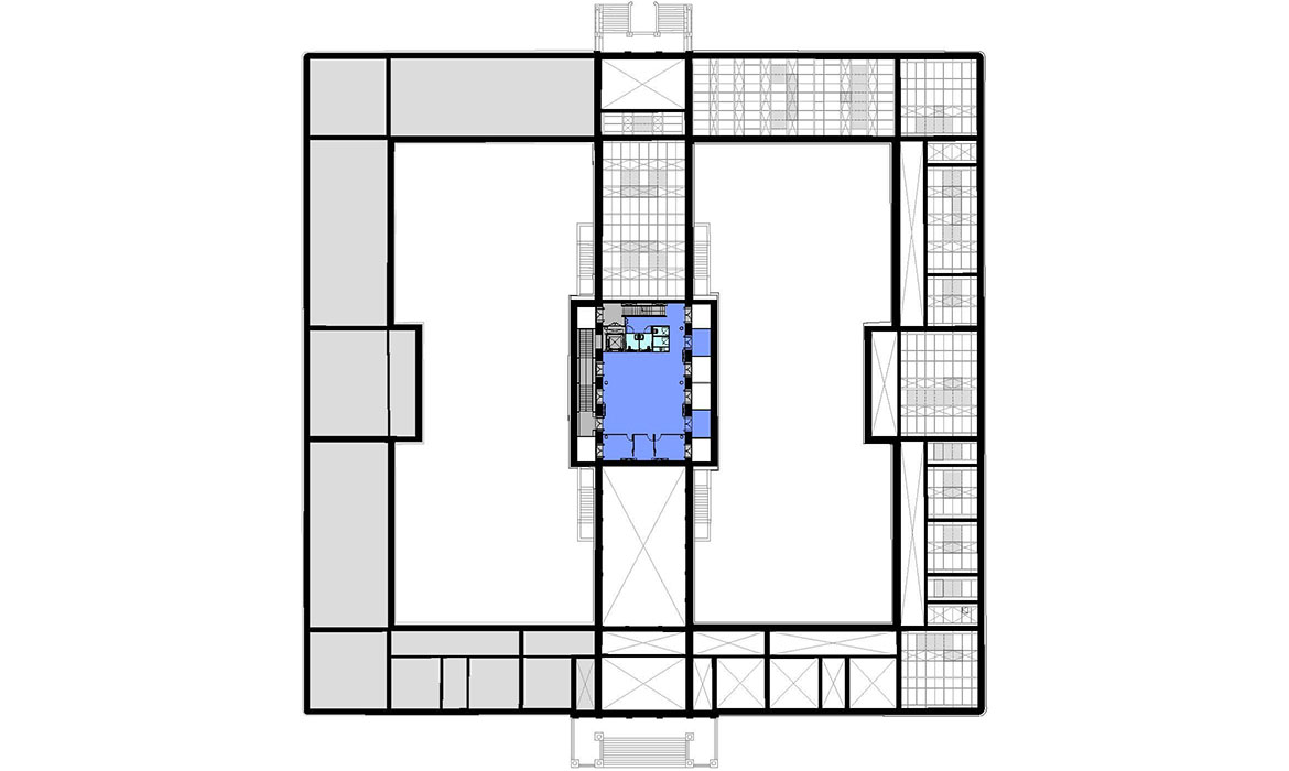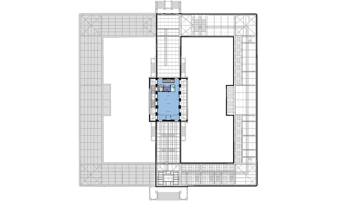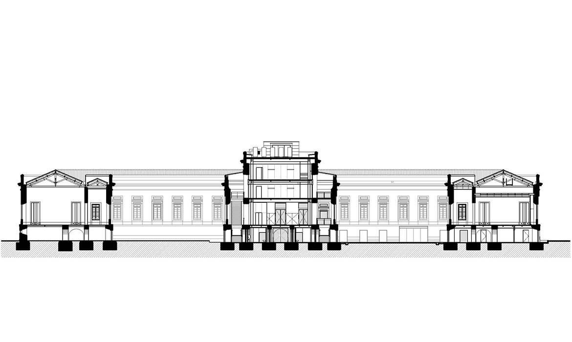 Nel corpo centrale dell’edificio è stata introdotta una struttura metallica indipendente per sostenere le lastre del nuovo pavimento, viene incluso un livello in più, sfruttando l’altezza generosa del soffitto. Un ascensore che dà accesso ad altri piani e shafts per la distribuzione verticale di tutta l’infrastruttura, è stato installato lì. Sul tetto si trovano la sottostazione elettrica, gli impianti di condizionamento e serbatoi di acqua potabile. I due livelli di sotto ospitano la biblioteca e il settore amministrativo. La nuova struttura apparente, su tutti i piani, rende chiaro l’intervento di modernizzazione eseguita. Nelle due ali laterali, adiacente al corpo centrale, sono state istallate nuove scale in struttura di metallo e pavimenti in legno, illuminate da lucernari in vetro.