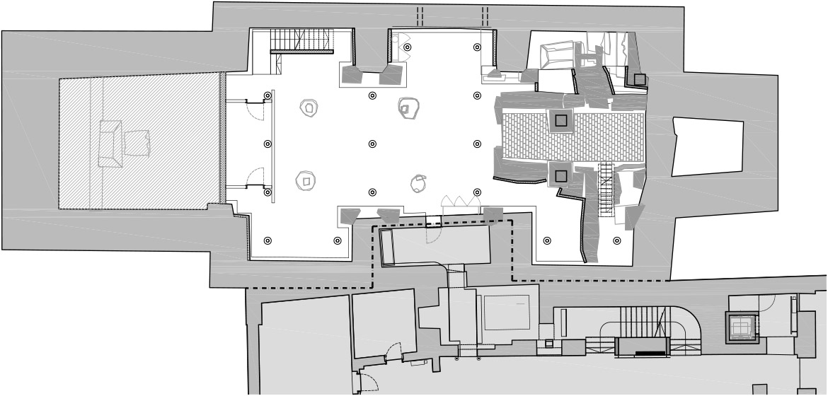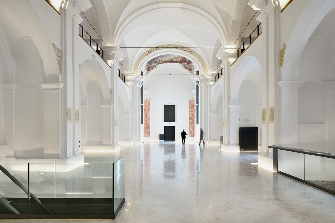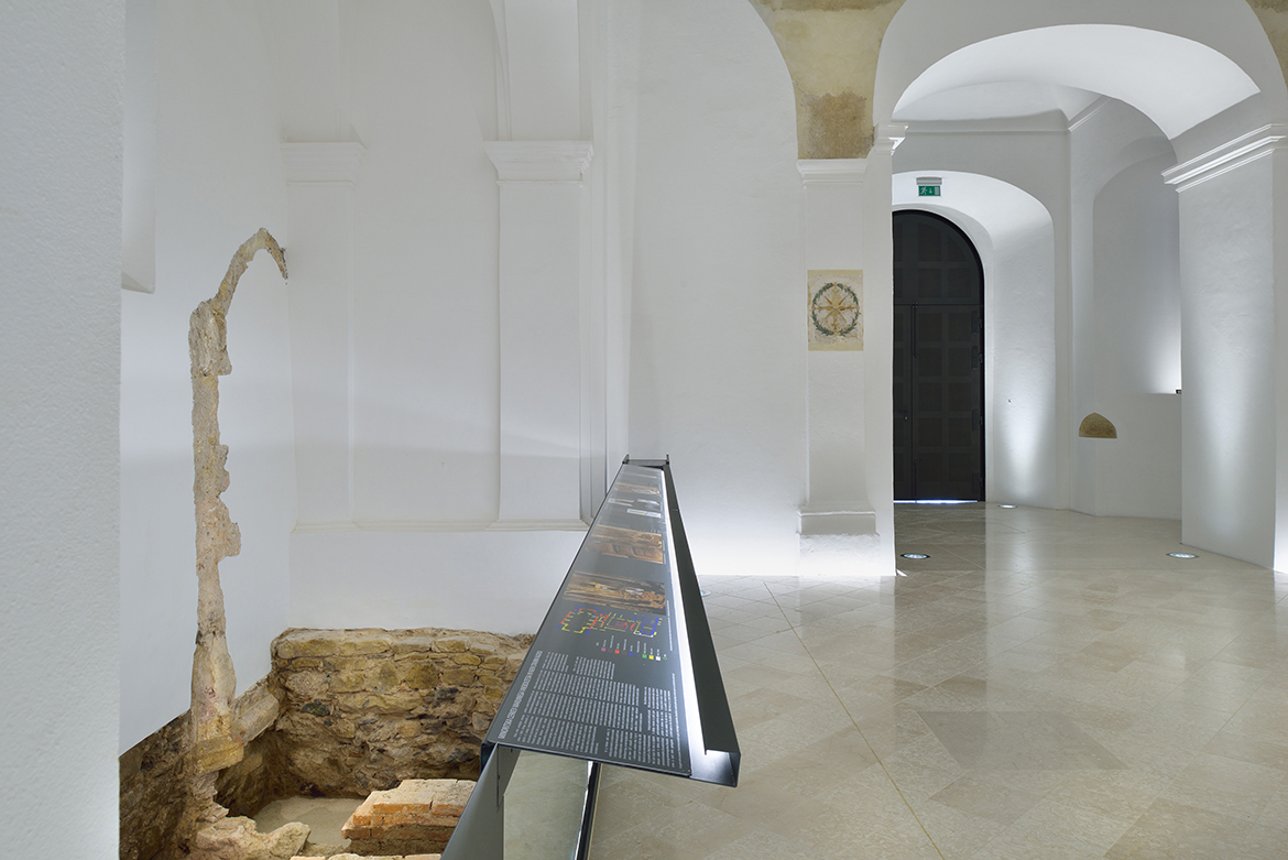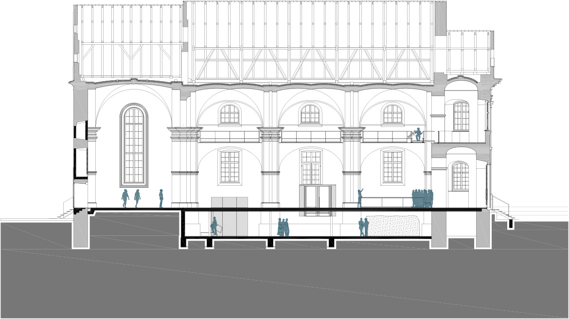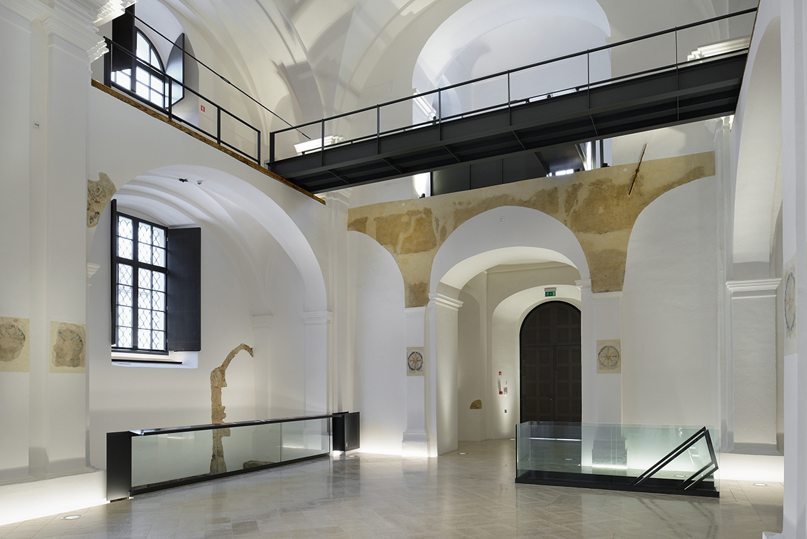 The restoration process of Minorite church and its Baroque origins brought several surprises. These resulted in much bigger and richer available new spaces than it was originally planned. The restoration works unveiled foundations of Romanesque pillars under the church floor, on the level of the crypt. This brought about changes in the project which made almost the entire ground level with its exceptional historical importance accessible to the public, offering a venue for more intimate, private events. The new church floor is a plate which separates the two levels without touching the walls. All the necessary installations, including heating, airing, lighting and sound systems, are embedded into the sides of the plate.
