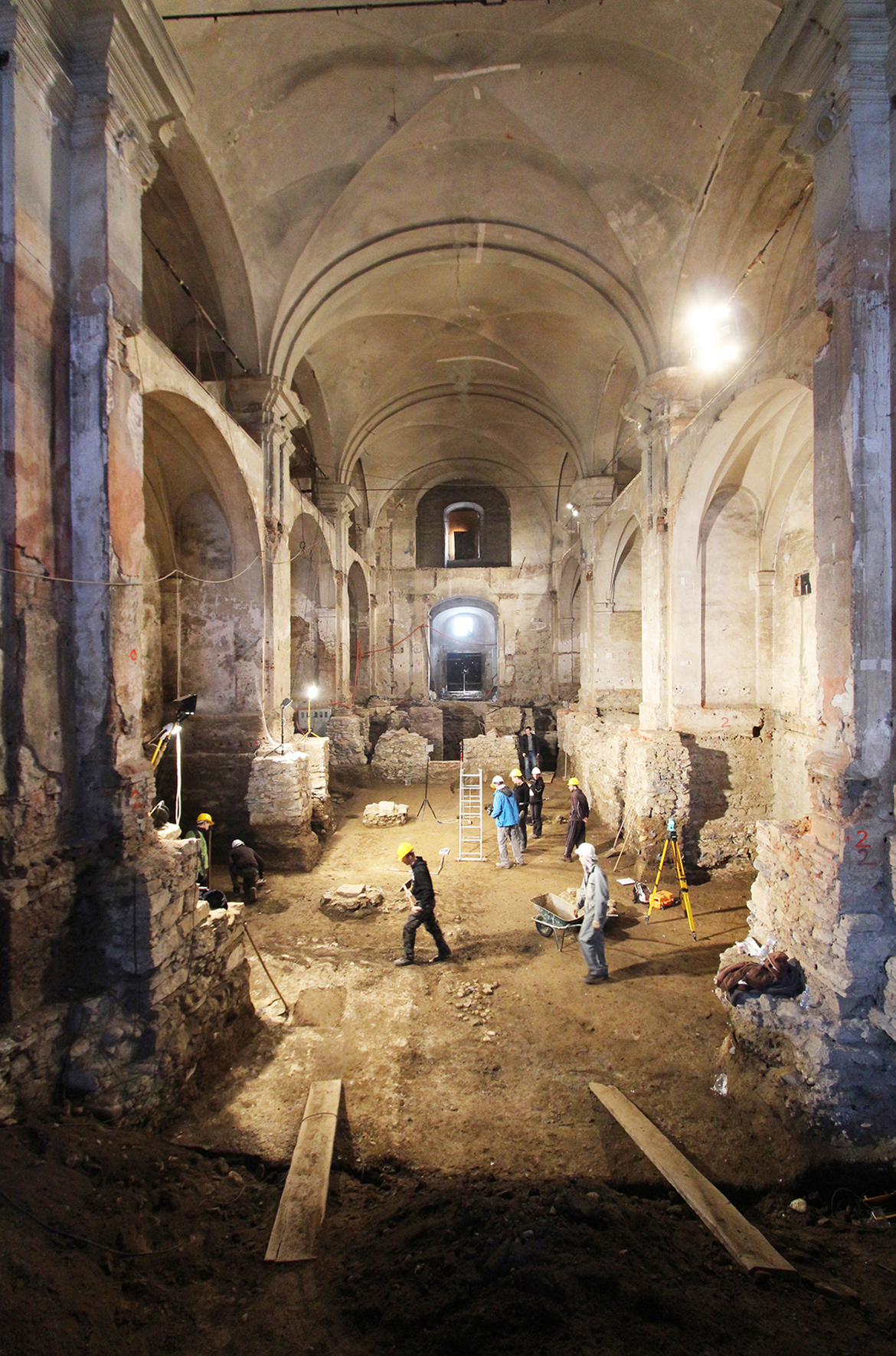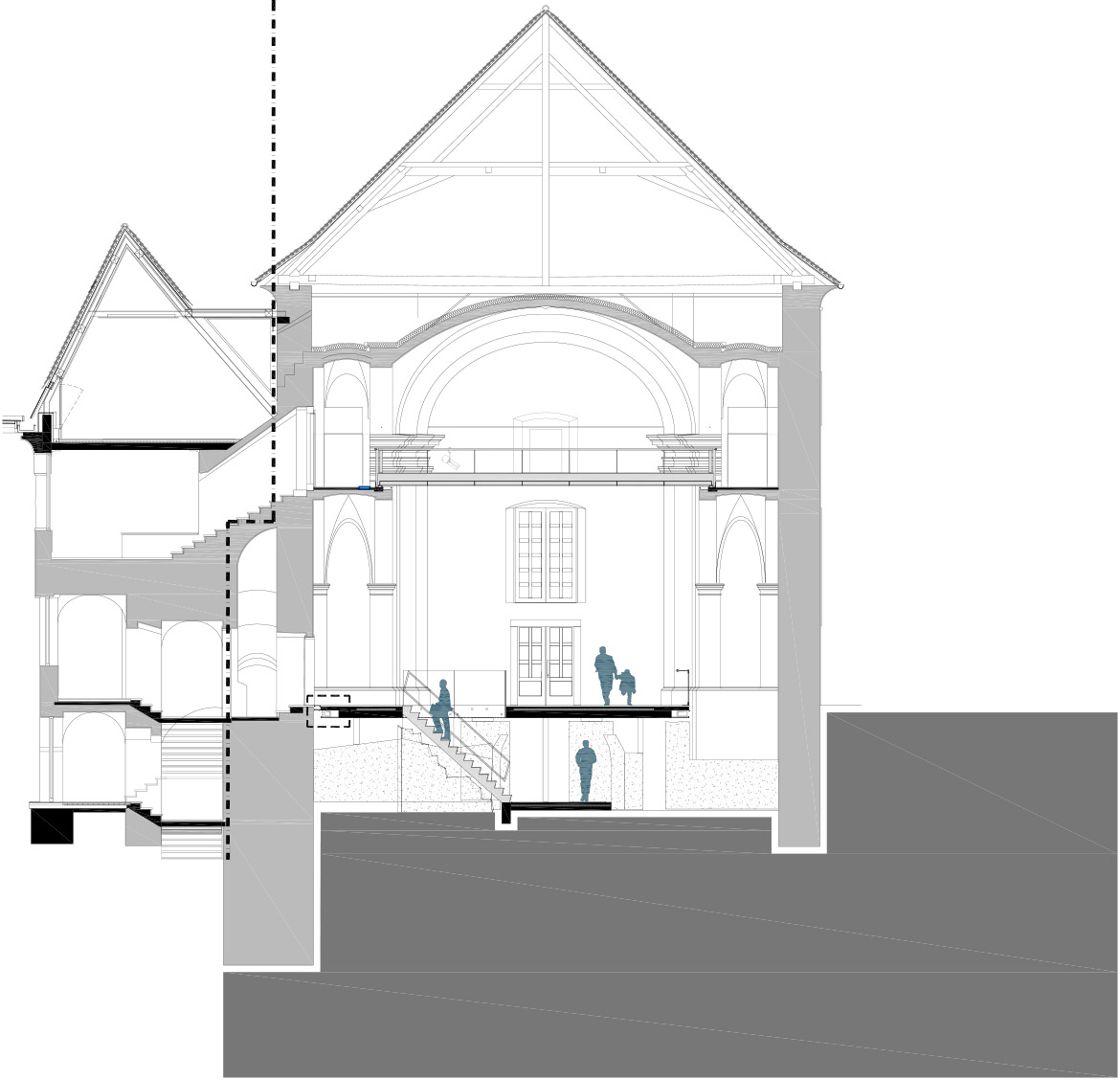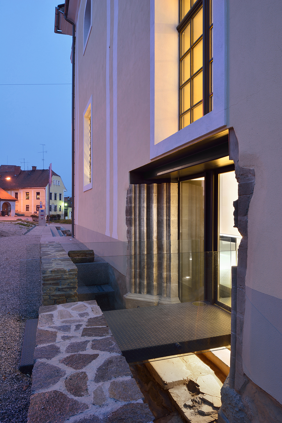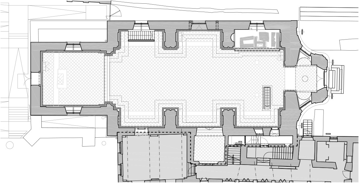 The restoration process of Minorite church and its Baroque origins brought several surprises. These resulted in much bigger and richer available new spaces than it was originally planned. The restoration works unveiled foundations of Romanesque pillars under the church floor, on the level of the crypt. This brought about changes in the project which made almost the entire ground level with its exceptional historical importance accessible to the public, offering a venue for more intimate, private events. The new church floor is a plate which separates the two levels without touching the walls. All the necessary installations, including heating, airing, lighting and sound systems, are embedded into the sides of the plate.