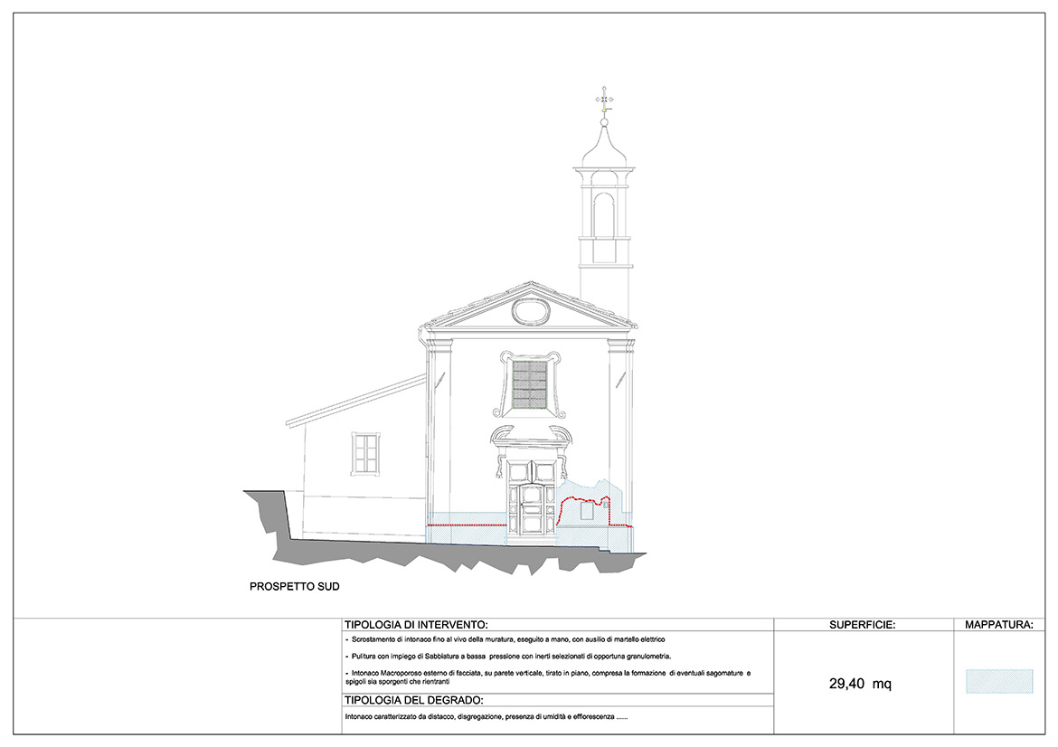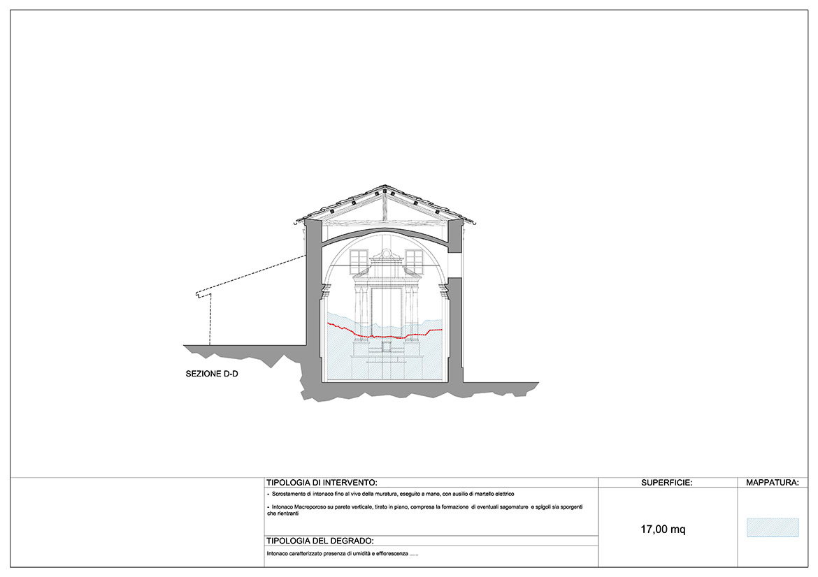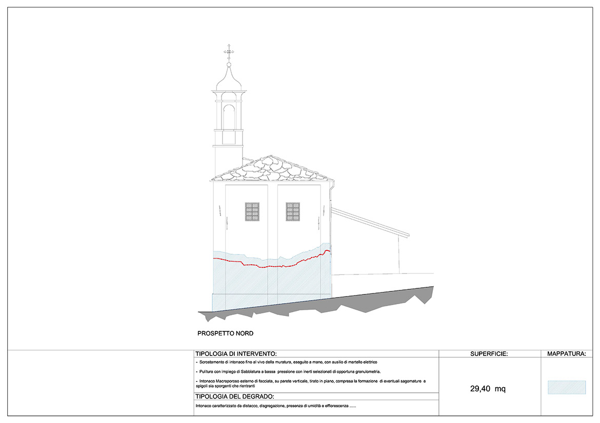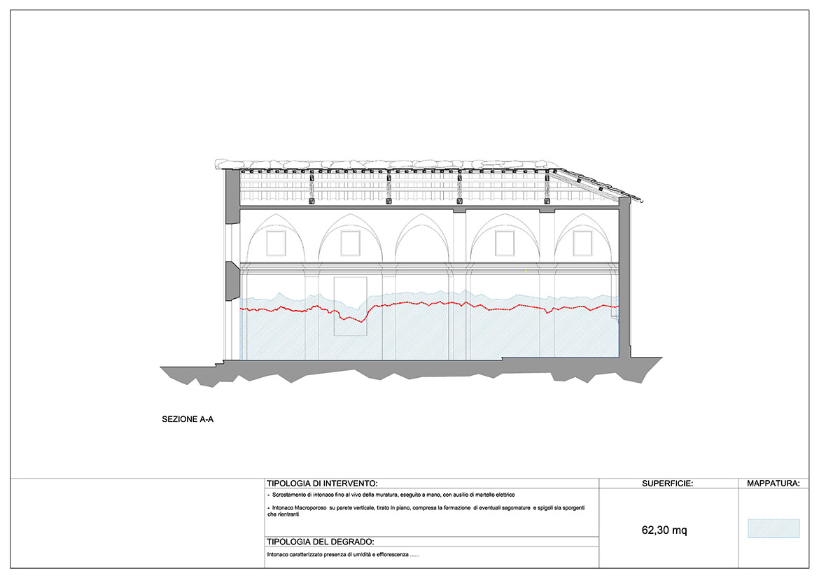 Gli intonaci sono stati asportati fino a circa 80 cm al di sopra delle zone dove è riconoscibile il confine tra l’intonaco danneggiato e l’intonaco ancora in buono stato e ripristinati con intonaci macroporosi a base di calce idraulica a normativa WTA 2-2-91 e DIN 18 557, che risultano meno soggetti ai danni provocati dalla cristallizzazione dei sali eventualmente presenti nelle murature, conferendo maggiori doti di durabilità al paramento murario.