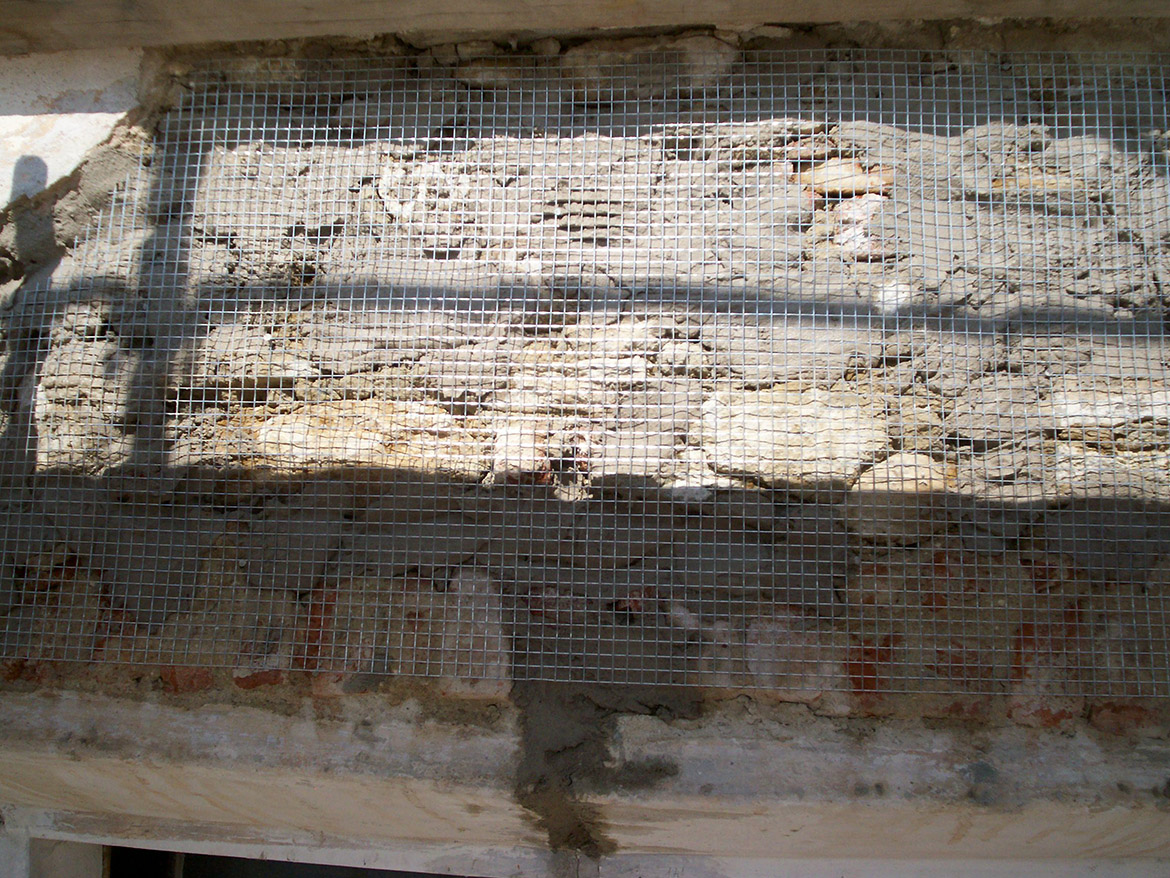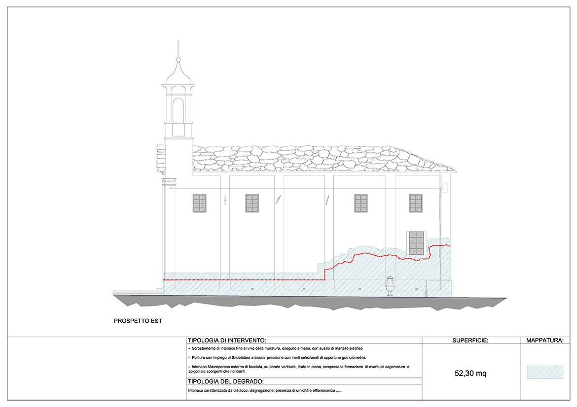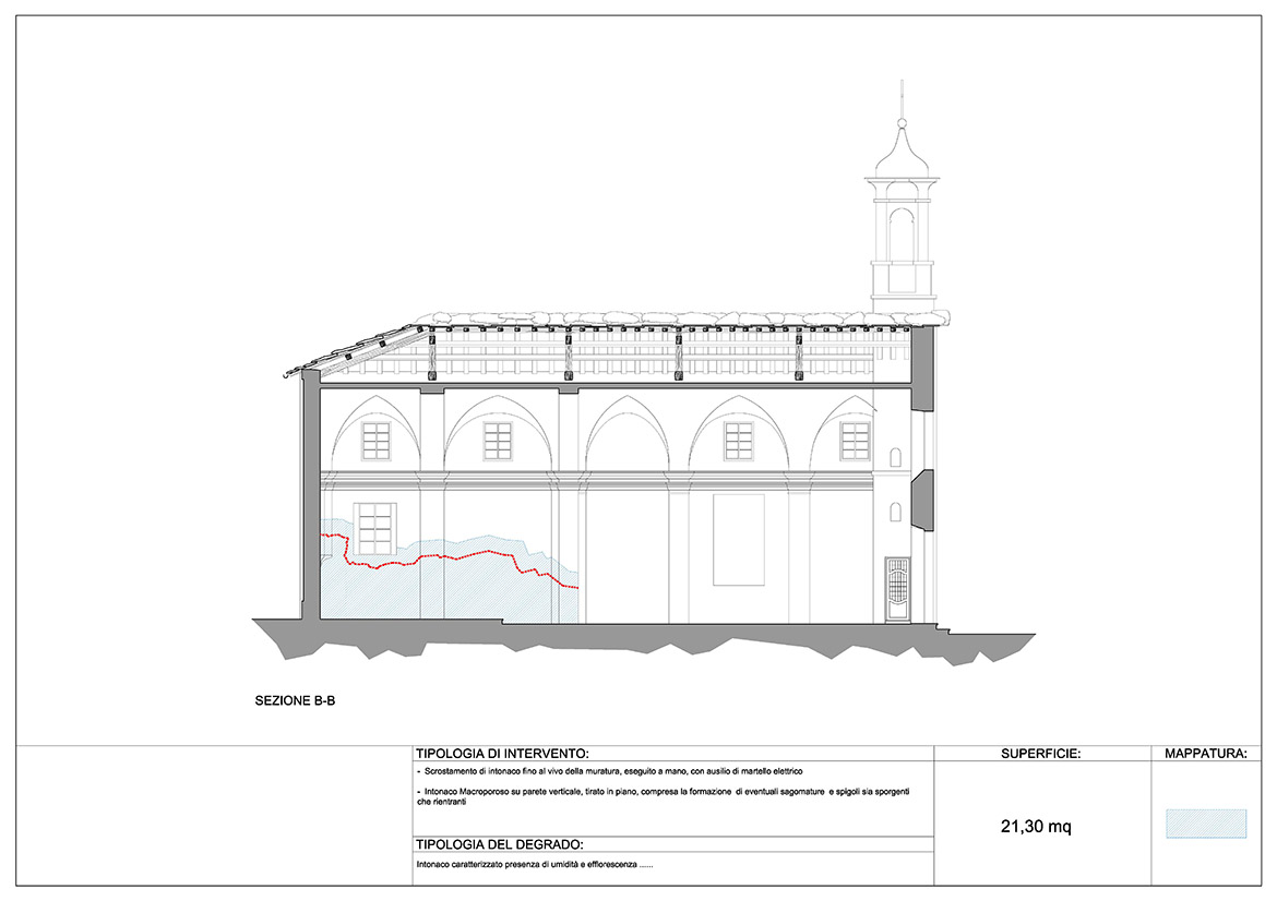 Gli intonaci sono stati asportati fino a circa 80 cm al di sopra delle zone dove è riconoscibile il confine tra l’intonaco danneggiato e l’intonaco ancora in buono stato e ripristinati con intonaci macroporosi a base di calce idraulica a normativa WTA 2-2-91 e DIN 18 557, che risultano meno soggetti ai danni provocati dalla cristallizzazione dei sali eventualmente presenti nelle murature, conferendo maggiori doti di durabilità al paramento murario.