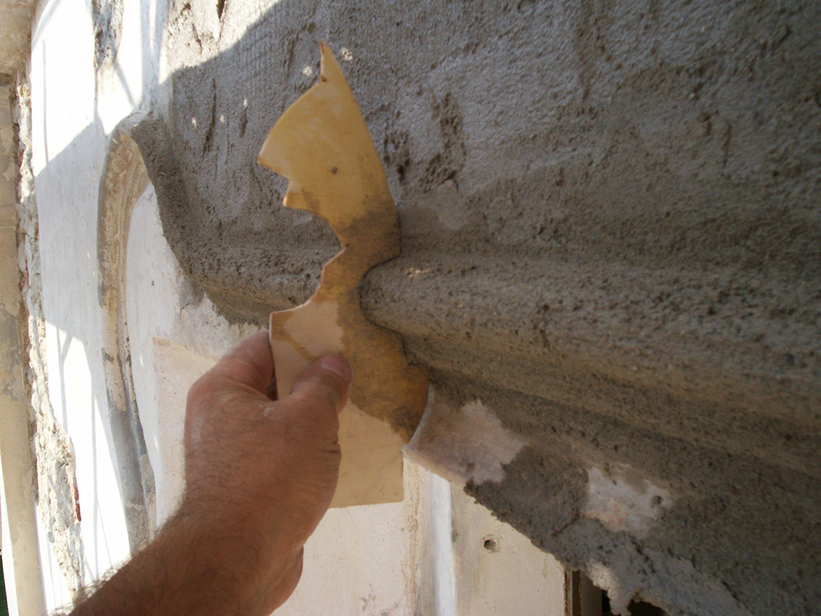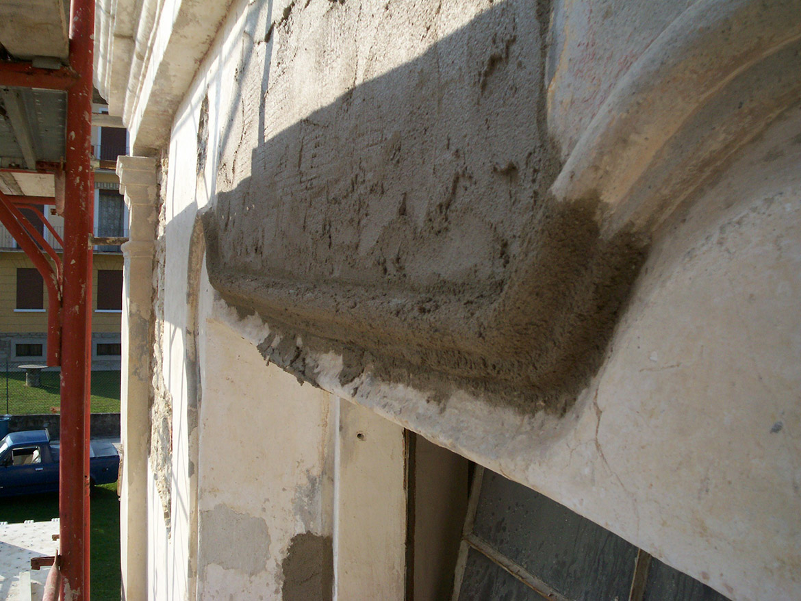 Inoltre il pesante stato di degrado di talune zone ha reso necessaria la ricostruzione di porzioni di cornici mediante “dime” in legno realizzate ad hoc.