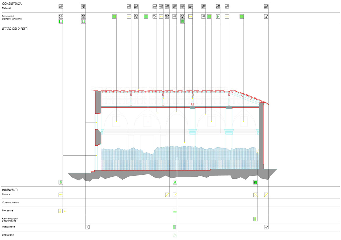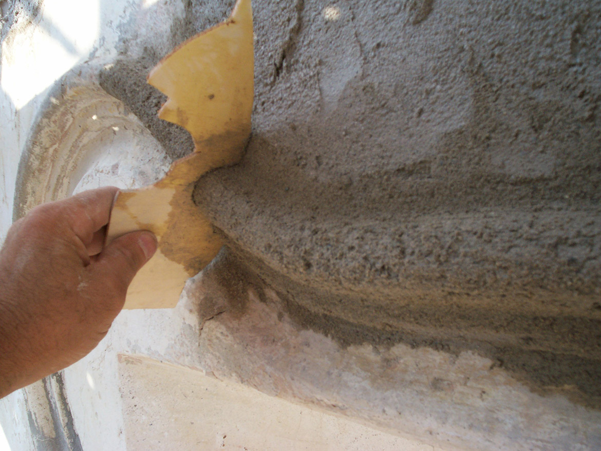 Poiché vaste porzioni degli intonaci presentavano fenomeni di disgregazione e distacchi dalla sottostante superficie muraria con formazione di efflorescenze, ovvero formazioni di sali, prodotte da fenomeni di migrazione ed evaporazione dell’acqua per risalita capillare o dilavamento diretto delle murature, l’intervento di restauro è consistito nella preventiva asportazione graduale e selettiva degli strati decorativi ammalorati a mezzo di sistemi di idrosabbiatura a bassa pressione (precedentemente descritti) mediante l’utilizzo di inerti (calcarei) di idonea granulometria e il successivo eventuale scrostamento degli intonaci caratterizzati da evidenti distacchi fino al vivo delle murature a mezzo di scalpellatura eseguita a mano (tale operazione è stata effettuata solo ove le superfici hanno evidenziato una composizione a cemento Portland).