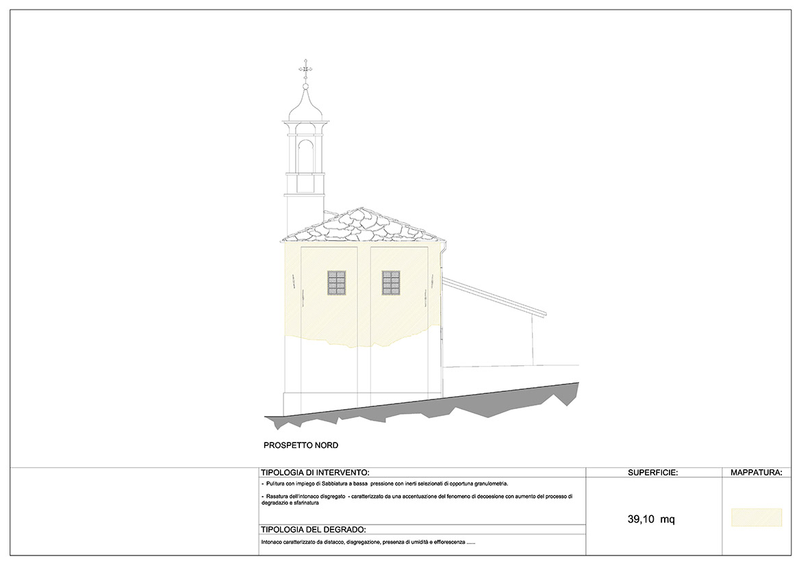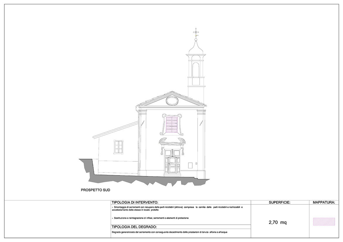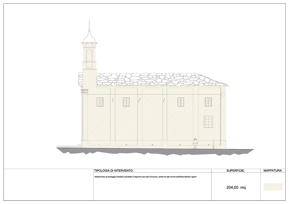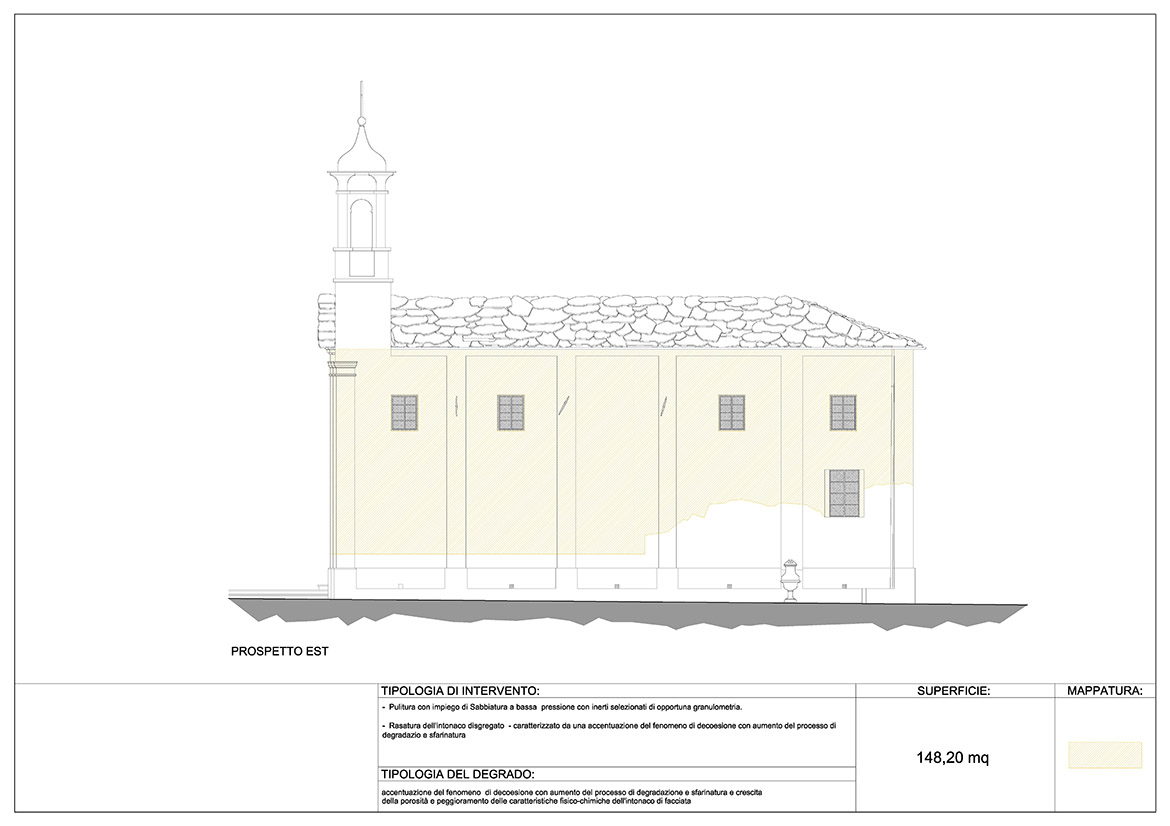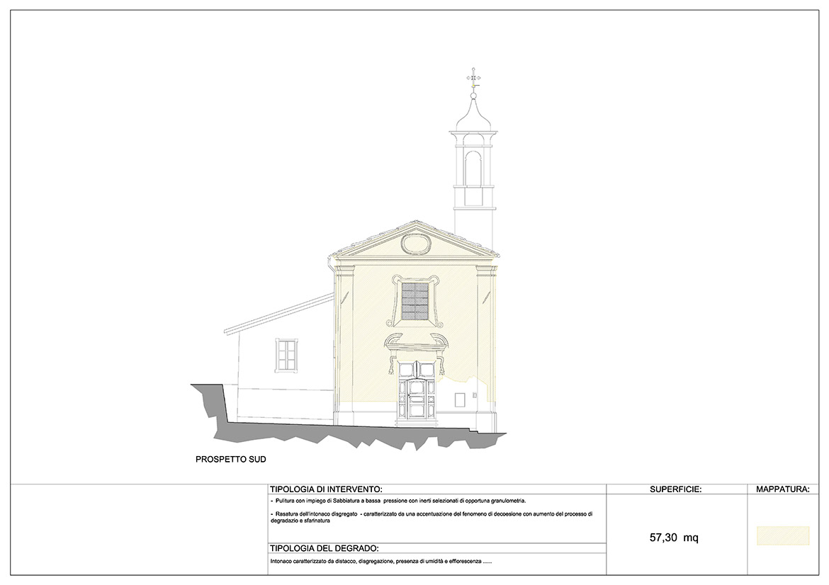 Si sottolinea inoltre che durante le operazioni di rifacimento degli intonaci si sono rivelate tracce di tamponamenti effettuati in epoche passate a chiusura di due nicchie, poste simmetricamente rispetto al portale di ingresso, che si è ritenuto di riportare in luce in quanto facenti parte dell’impianto originario della chiesa. Si è provveduto inoltre alla eliminazione di superfetazioni consistenti in travi, chiodature e grappe metalliche incongruenti, al restauro del portale di ingresso e al risanamento di tutti i serramenti.