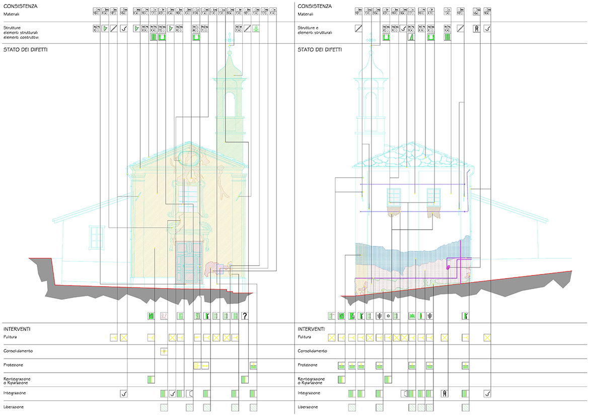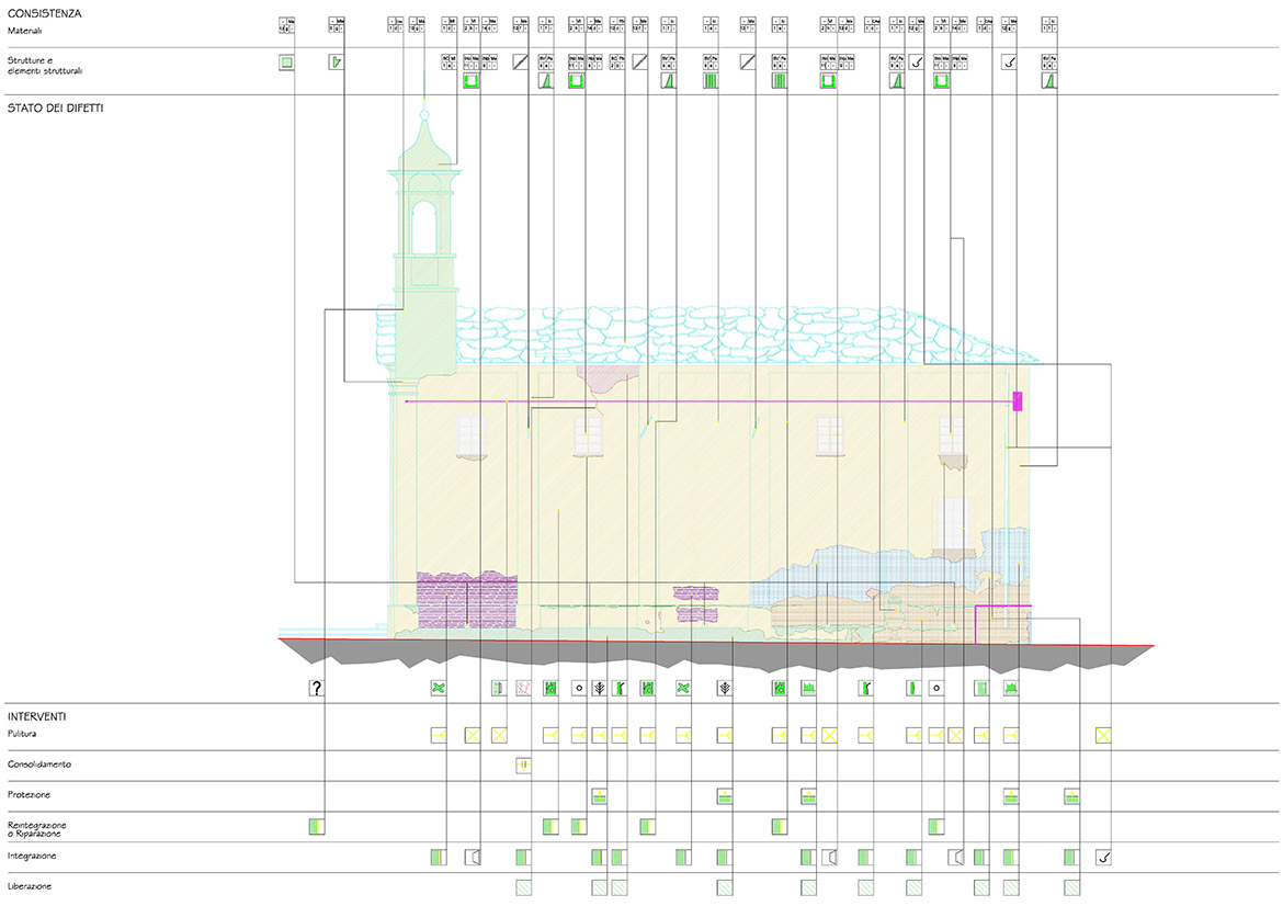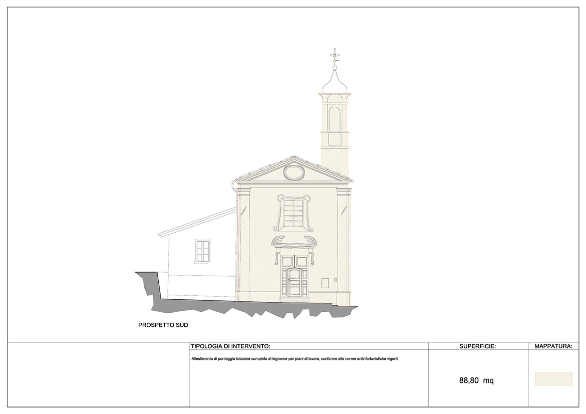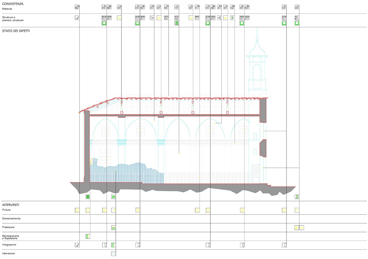 Si sottolinea inoltre che durante le operazioni di rifacimento degli intonaci si sono rivelate tracce di tamponamenti effettuati in epoche passate a chiusura di due nicchie, poste simmetricamente rispetto al portale di ingresso, che si è ritenuto di riportare in luce in quanto facenti parte dell’impianto originario della chiesa. Si è provveduto inoltre alla eliminazione di superfetazioni consistenti in travi, chiodature e grappe metalliche incongruenti, al restauro del portale di ingresso e al risanamento di tutti i serramenti.
