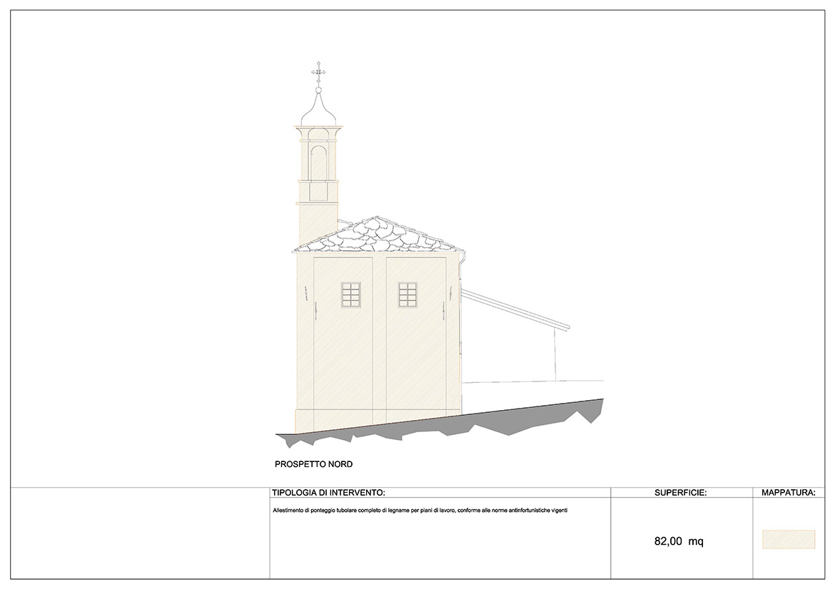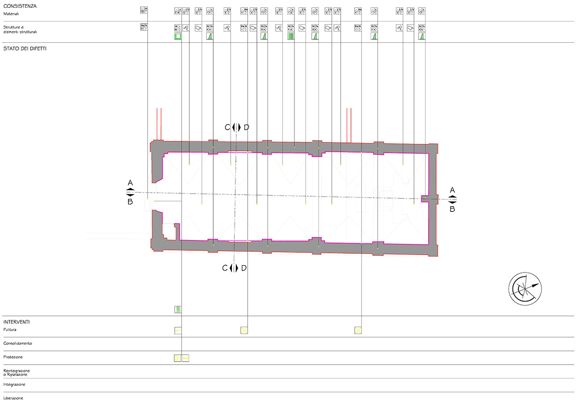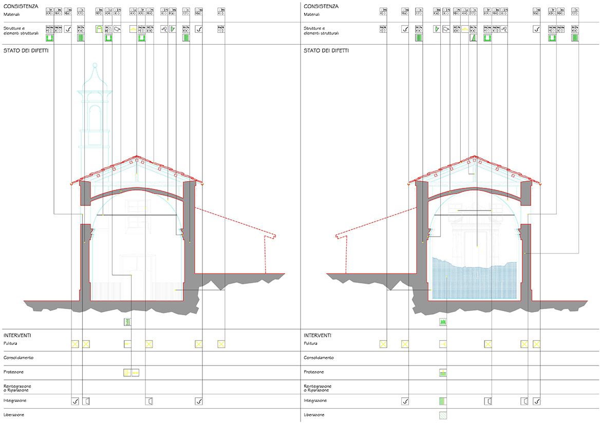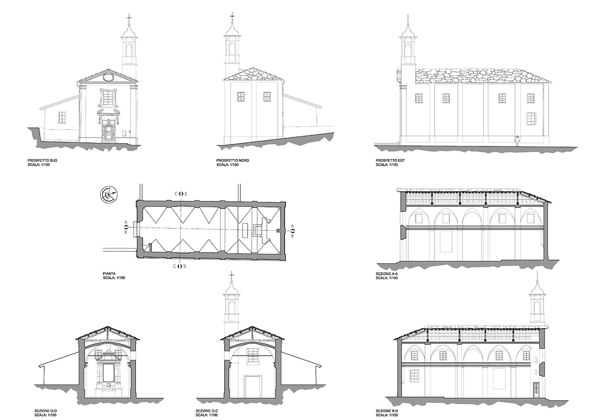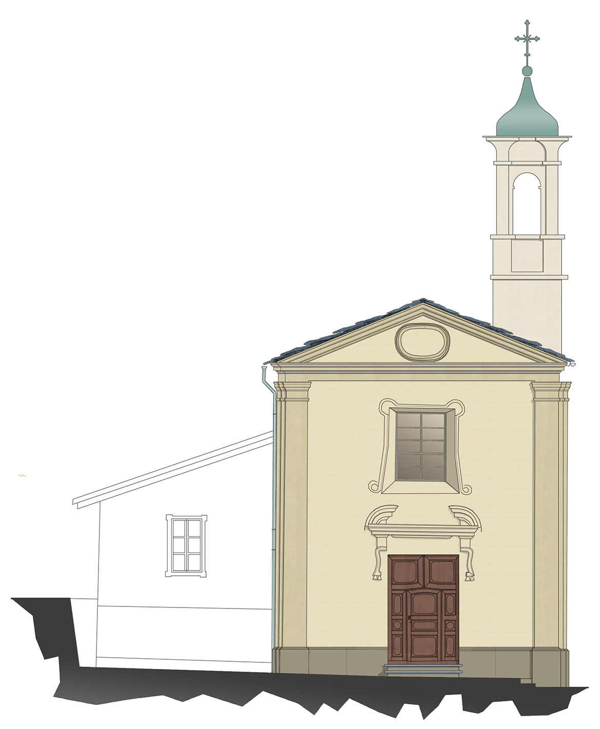 Si sottolinea inoltre che durante le operazioni di rifacimento degli intonaci si sono rivelate tracce di tamponamenti effettuati in epoche passate a chiusura di due nicchie, poste simmetricamente rispetto al portale di ingresso, che si è ritenuto di riportare in luce in quanto facenti parte dell’impianto originario della chiesa. Si è provveduto inoltre alla eliminazione di superfetazioni consistenti in travi, chiodature e grappe metalliche incongruenti, al restauro del portale di ingresso e al risanamento di tutti i serramenti.