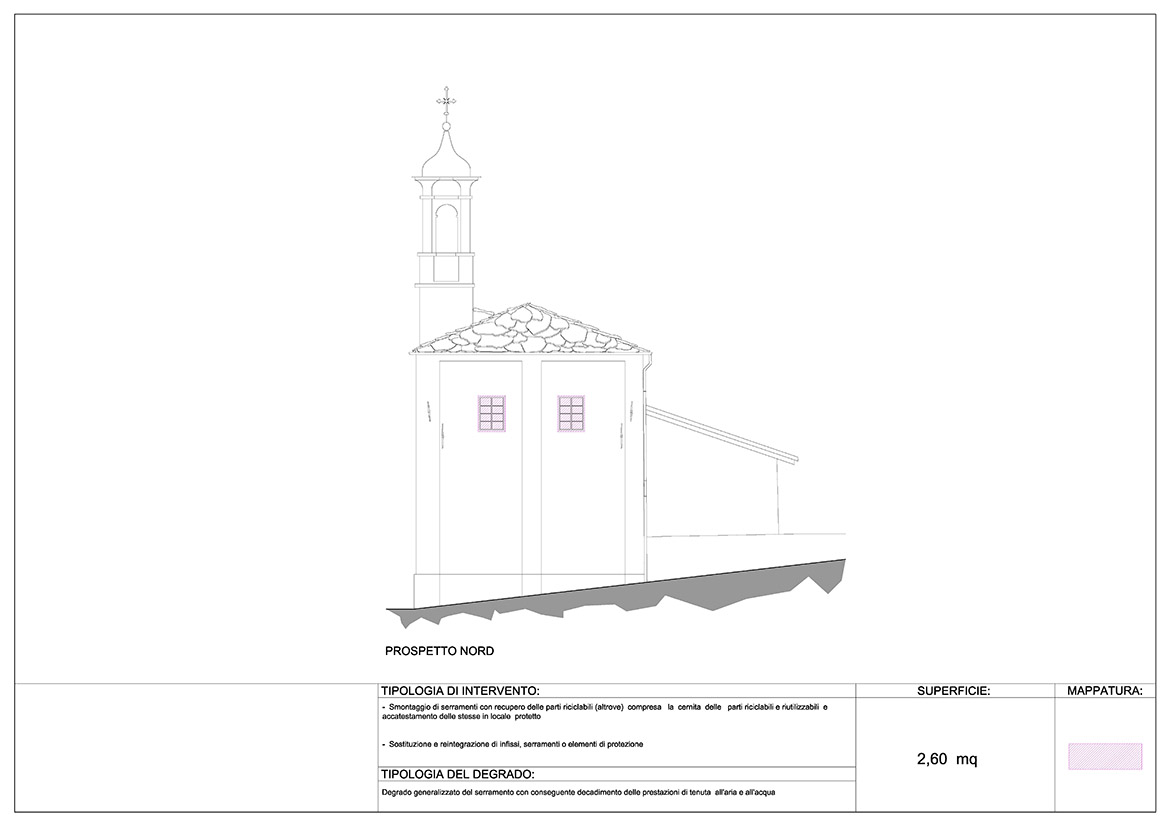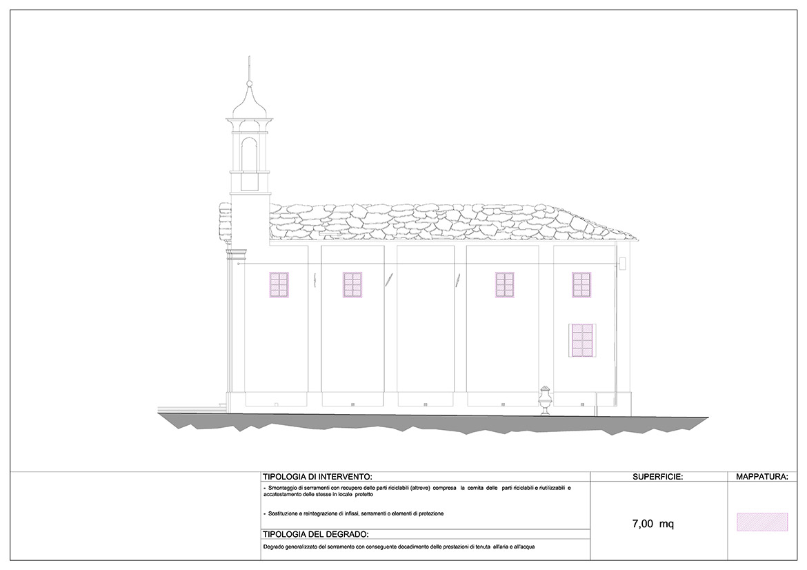 Altrettanto si è provveduto al restauro del portale di ingresso in legno che presentava fessurazioni, alterazioni cromatiche del colore con perdita di lucentezza e opacizzazione particolarmente dello zoccolo dovute a dilavamento. L’azione manutentiva sull’infisso è consistita nella totale sverniciatura, levigatura con carta a vetro a grana fine, stuccatura e verniciatura protettiva e nella verifica e parziale sostituzione della ferramenta. Per quanto attiene gli altri infissi sono stati opportunamente recuperati in tutte le parti ammalorate e riverniciati completamente.