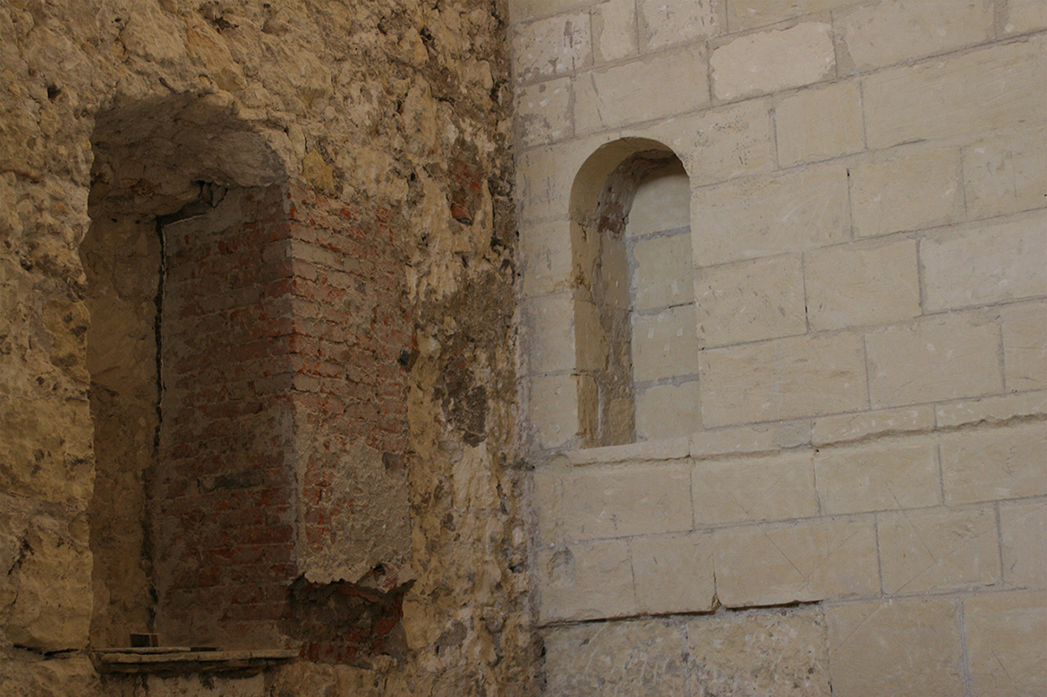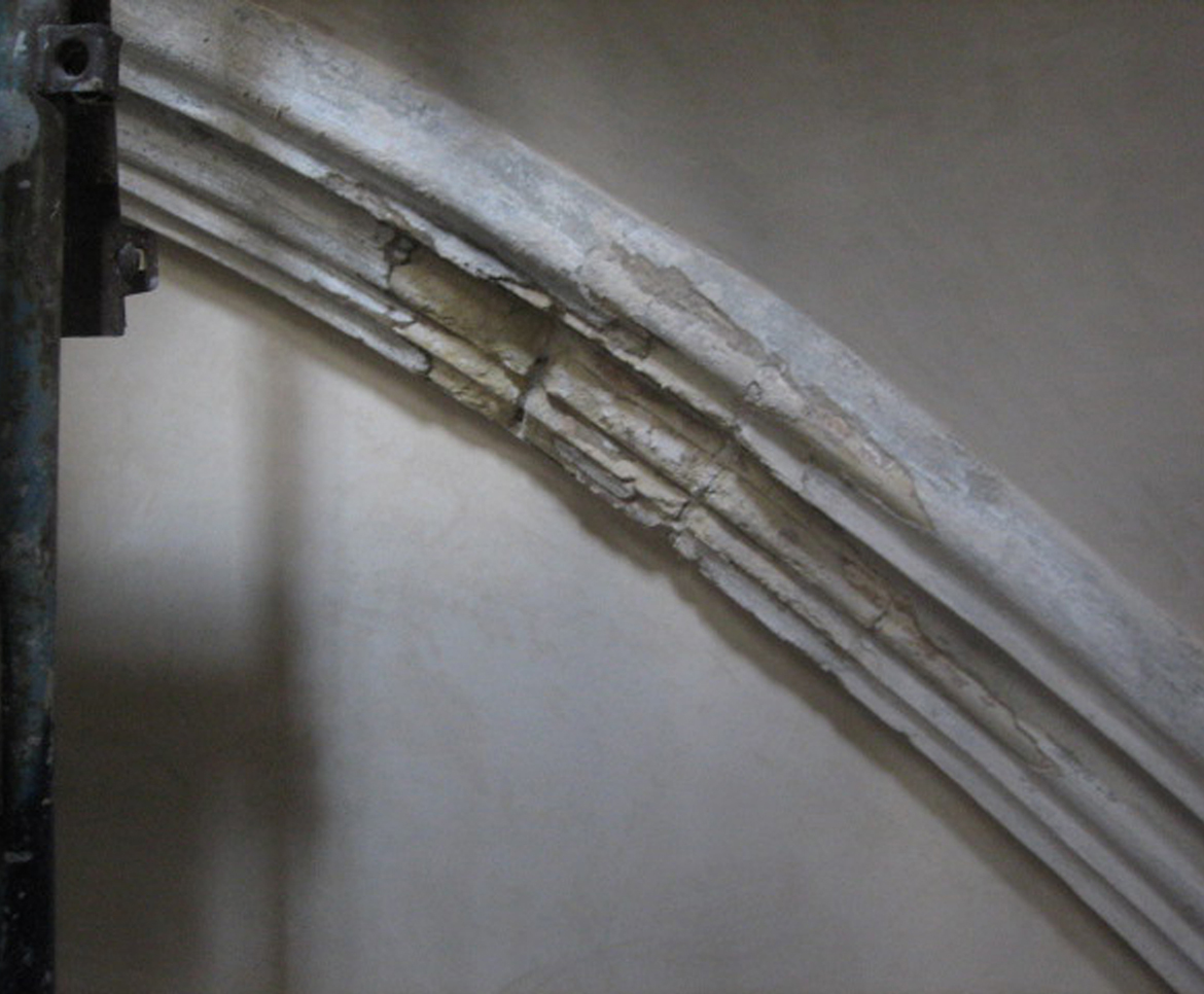 On the two sides of the central extent, three chapels with barrel vault, connecting each others, are arrange in line, defined on the entrance by a round arch, with an ornamental volute on the archstone; on the surface area of the wall of the left side appeared phenomenons of rising damp, and the ceiling of the first chapel presented a clear widespread infiltration falling from covering; also on the right side, the original masonries, hidden by brick walls added in a second moment, high as the springer line of the arches, presented the same problems.