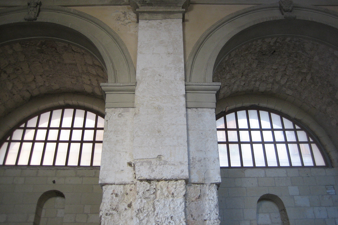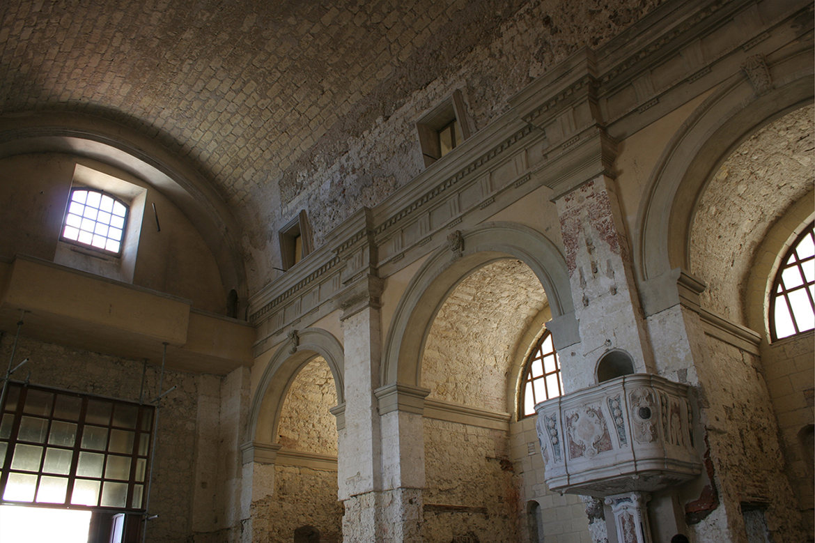 The barrel vault places on trabeations supported by piers with Doric pilaster, in classical style, realized with “Pietra cantone” ( type of calcarenite stone), as the wall structure of the entire perimeter; the trabeations were concealed by clay interlinings, covered by cement render: the ashlars denounced a progressive decomposition, noticeable for the pulverization of surfaces caused by salient damp .