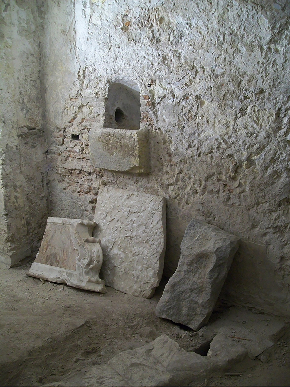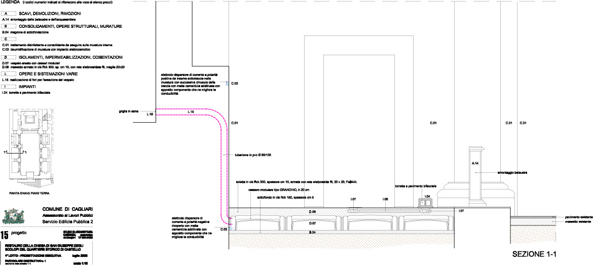 The works has proceeded with a treatment of wall surfaces with anti-salt and stabilizing disinfectant products, which guarantee a best cohesion between calcarenite ashlars, in some zones particularly deteriorated, and with dehumidification by means of the introduction of an electroosmotic system, to eliminate widespread rising damp.