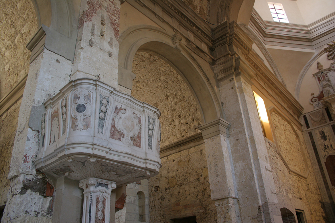 In the upper side of the church, between the two moulding, there are the pendentives, in support of the octagonal tambour, where there are gaps with wooden frames; on the cupola’s surface there are widespread damages and traces of descending damp, the cupola end with an octagonal base lantern, illuminated by four little windows, and closed with temporary frames.