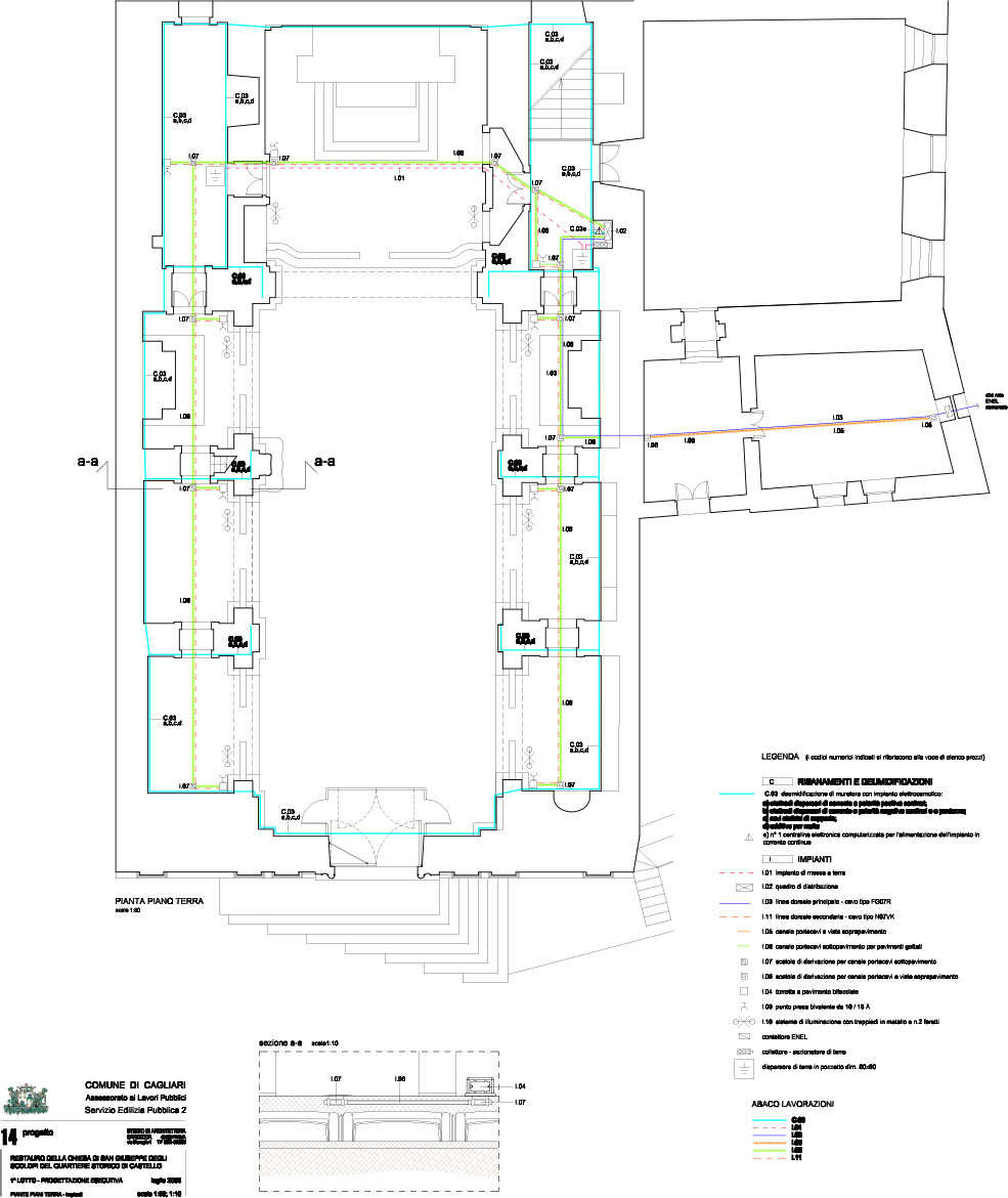 In the matter of electrical system, it has been expected a configuration just for the ground floor, inserting a provisional switchboard distribution, connected with actual Enel meter, placed in the room, adjacent to the sacristy, inserting also some cable holder ducts, and their junction boxes, supply lines, turret branches, sockets for lighting apparatus from the ground and convector heater or movable and not permanent fans.