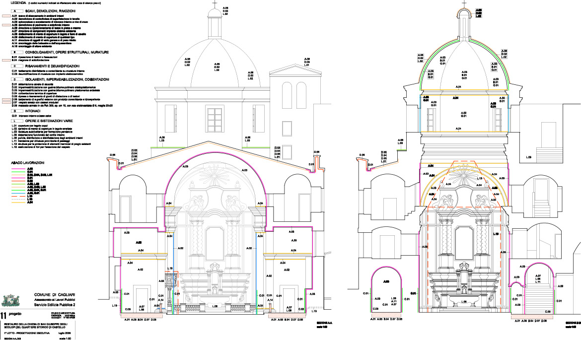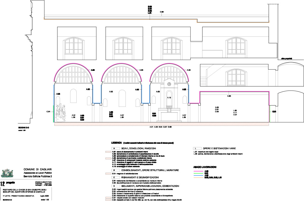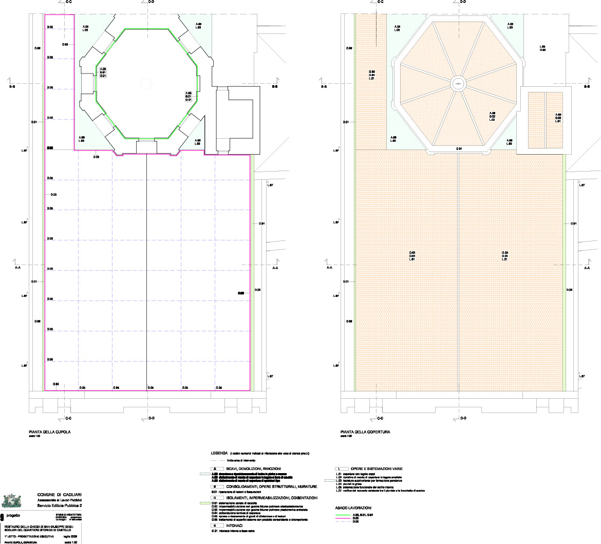 In the matter of covering, for the nave’s ones it has been considered the displacement of the existent expansion joints, by this time crumbling and lacking of the necessary functionality, and its refacing, renovating the slot, where they will be positioned in, inserting PVC and sealant strip; over it, upon application of an adequate primer, a hot application of a waterproof slated sheet and the placement of Sardinian roof tile, proposing again the original aspect of the roof covering.