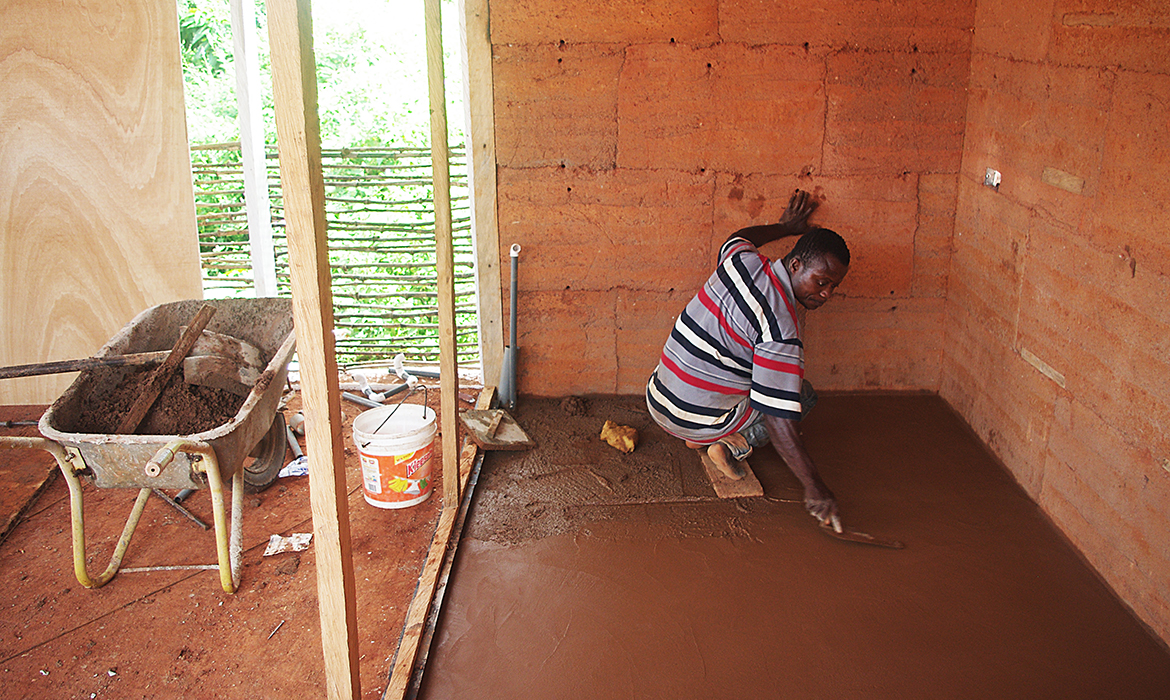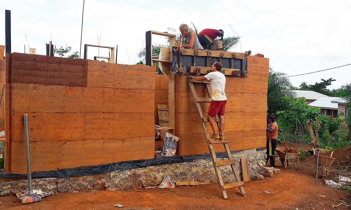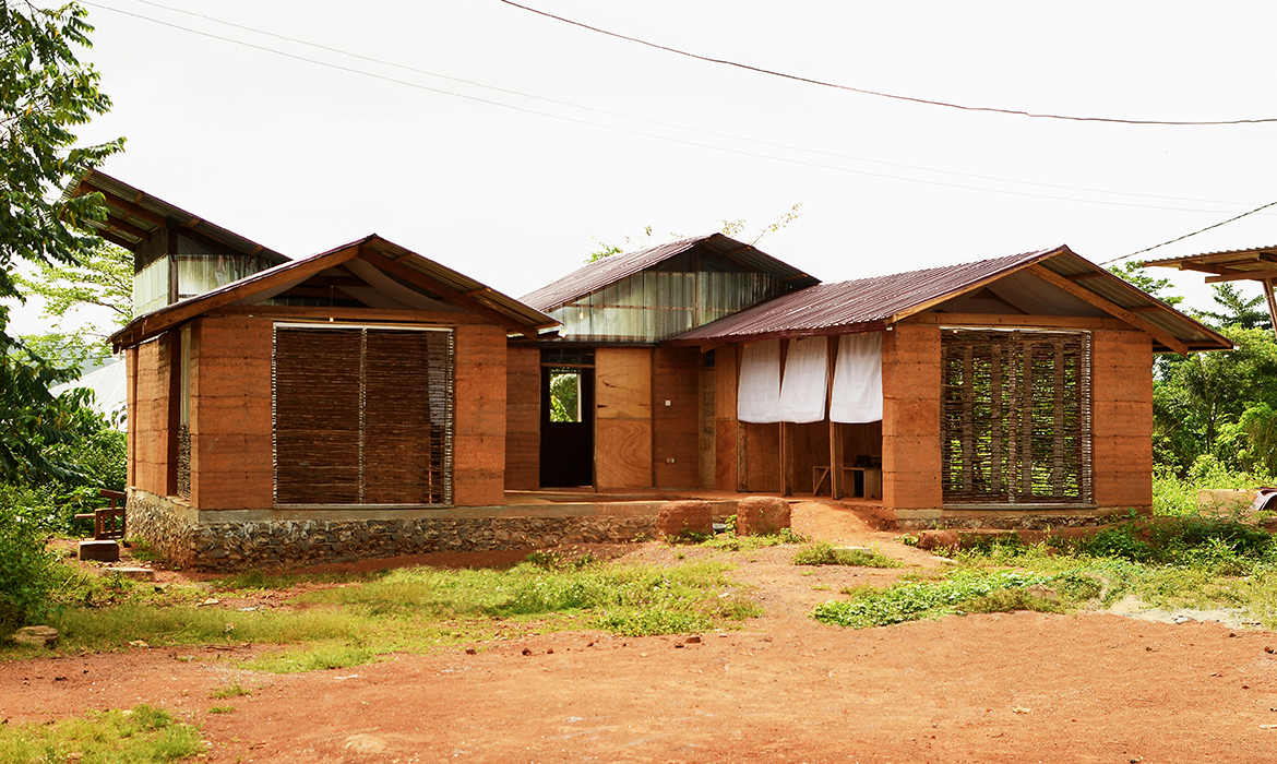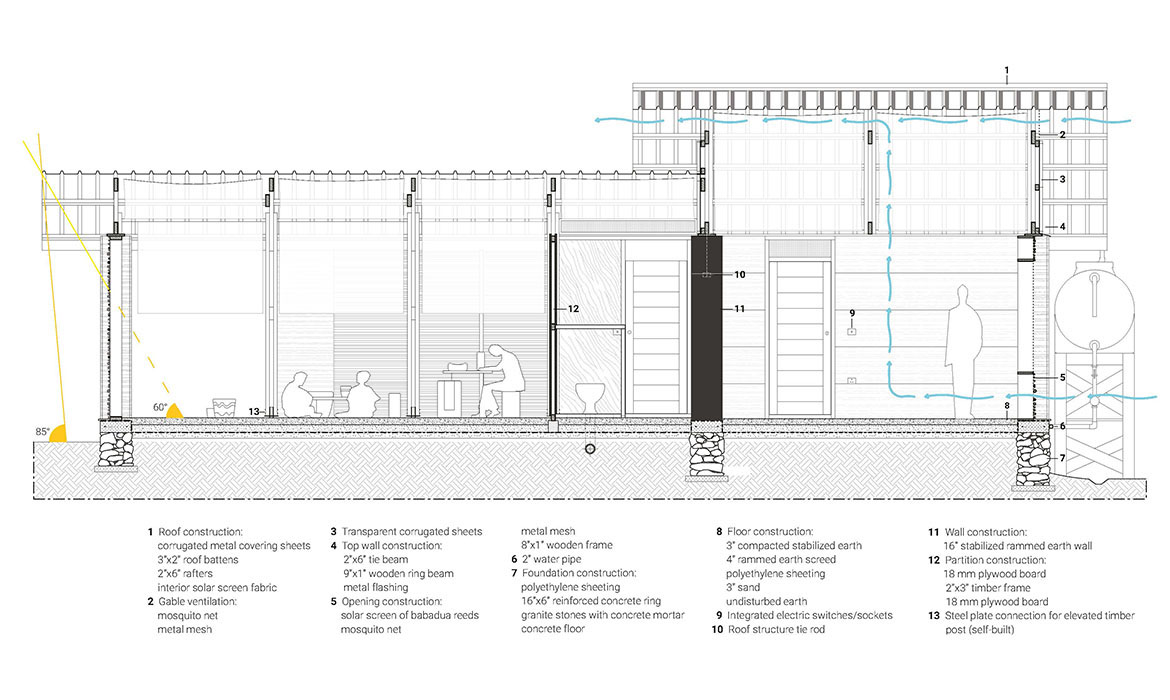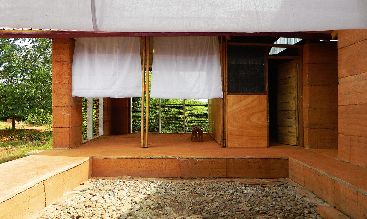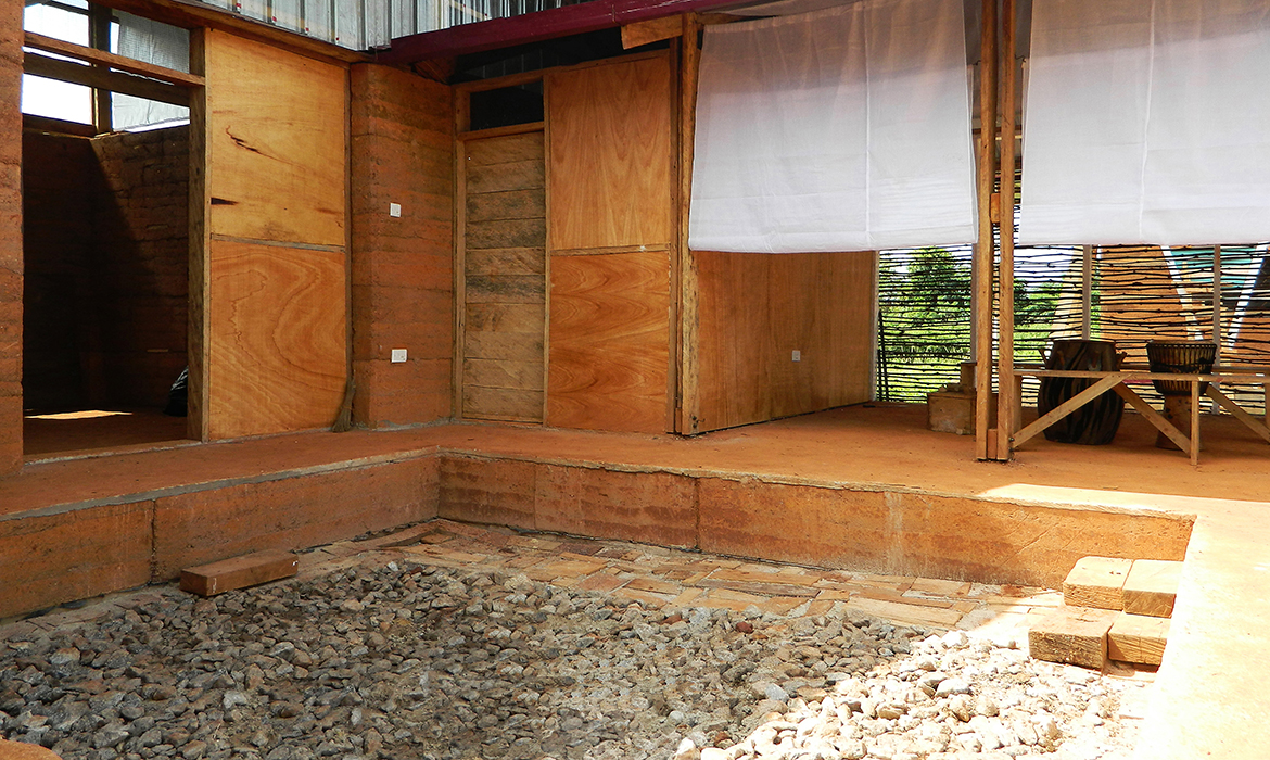 The project is also characterized by thick earthen walls, with high thermal mass and small openings on the south-side. The slight slope area offers natural rainwater drainage. Foundations are made by local granite stones and concrete mortar. A reinforced concrete ring beam was then poured to connect the foundations, to ensure even loads and to have a precise top section. The technique used for “eARThouse” provides rammed earth load-bearing walls. Stabilization is given by adding a small percentage of cement  (8%) to the dry mix of sand (10%) and soil (82%), reached through onsite samples. To achieve the widest spread of rammed earth, it must become able to compete with other cheap techniques such as cement blocks, mainly in term of costs, since the main aspects of structural strength and thermal comfort are qualities already recognized by the community. To reduce the construction cost the team designed metal formworks as a community tool, easily and quickly reusable by anyone several times, compared to the common wooden ones. Furthermore, the formworks were tested within a second project, which was totally funded by a local farmer with little money and time.Regarding the electric system, the switches and sockets are integrated inside the rammed walls, to address better quality of internal finishings and proving the equal potentials of this technique compared to others.The project provides a rainwater harvesting system in which the water is filtered and then stored within the water tank which can provide sanitary water to the kitchen and bathroom. Rubber stripes were fixed directly under the covering sheets, using half garden hose, to reduce rainwater noise. The aim was to find out cheap solutions to be reproduced by anyone from different social status, in order to improve living conditions through simple changes.To prevent from direct sunlight the main openings are covered with horizontal canes called Babadua, tied together to make a dense screen. Babadua is a traditional material, locally available and one of the most resistant type of wood against termites and weather, but fallen into disuse as a poor material nowadays. Constraints on resources in such contexts should bring to minimize the waste of material, in fact, rejected wooden boards were reused for frameworks and furniture.In this project sustainability means working with the lowest budget, in order to achieve a cost-effective building according to local dwellers affordability. Reducing the cost, while using natural materials combined with innovative solutions, anyone within the community will be able to enhance his dwelling condition, despite personal resources.