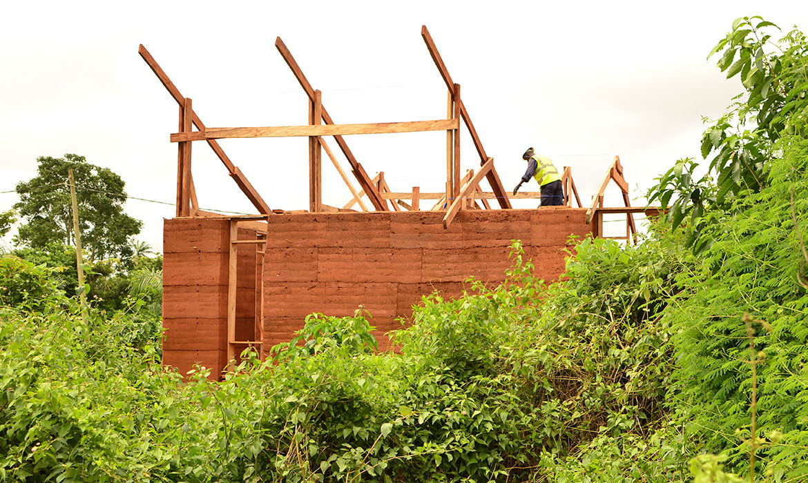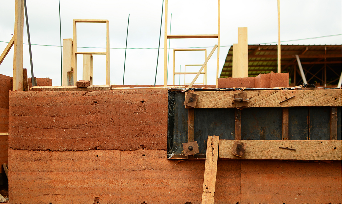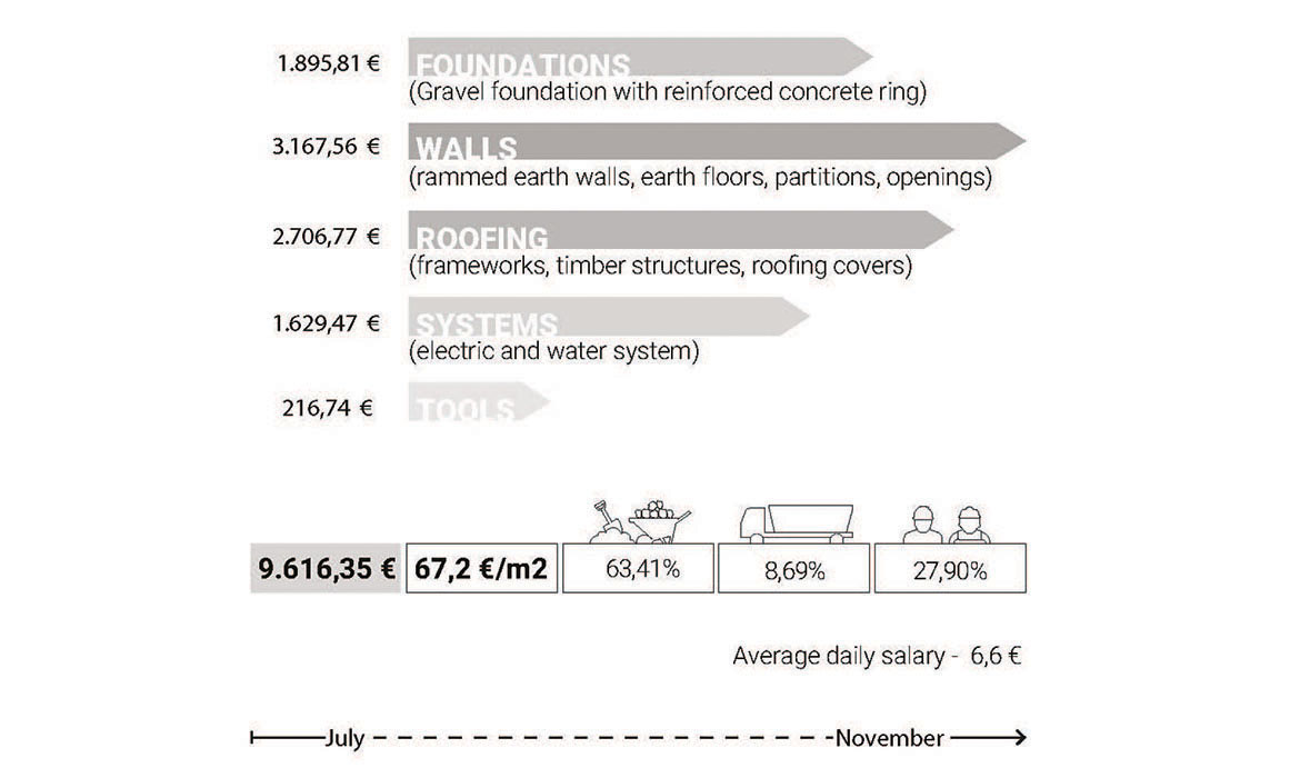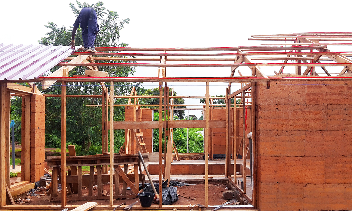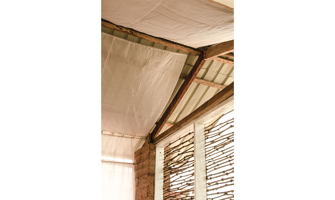 The project is also characterized by thick earthen walls, with high thermal mass and small openings on the south-side. The slight slope area offers natural rainwater drainage. Foundations are made by local granite stones and concrete mortar. A reinforced concrete ring beam was then poured to connect the foundations, to ensure even loads and to have a precise top section. The technique used for “eARThouse” provides rammed earth load-bearing walls. Stabilization is given by adding a small percentage of cement  (8%) to the dry mix of sand (10%) and soil (82%), reached through onsite samples. To achieve the widest spread of rammed earth, it must become able to compete with other cheap techniques such as cement blocks, mainly in term of costs, since the main aspects of structural strength and thermal comfort are qualities already recognized by the community. To reduce the construction cost the team designed metal formworks as a community tool, easily and quickly reusable by anyone several times, compared to the common wooden ones. Furthermore, the formworks were tested within a second project, which was totally funded by a local farmer with little money and time.Regarding the electric system, the switches and sockets are integrated inside the rammed walls, to address better quality of internal finishings and proving the equal potentials of this technique compared to others.The project provides a rainwater harvesting system in which the water is filtered and then stored within the water tank which can provide sanitary water to the kitchen and bathroom. Rubber stripes were fixed directly under the covering sheets, using half garden hose, to reduce rainwater noise. The aim was to find out cheap solutions to be reproduced by anyone from different social status, in order to improve living conditions through simple changes.To prevent from direct sunlight the main openings are covered with horizontal canes called Babadua, tied together to make a dense screen. Babadua is a traditional material, locally available and one of the most resistant type of wood against termites and weather, but fallen into disuse as a poor material nowadays. Constraints on resources in such contexts should bring to minimize the waste of material, in fact, rejected wooden boards were reused for frameworks and furniture.In this project sustainability means working with the lowest budget, in order to achieve a cost-effective building according to local dwellers affordability. Reducing the cost, while using natural materials combined with innovative solutions, anyone within the community will be able to enhance his dwelling condition, despite personal resources.