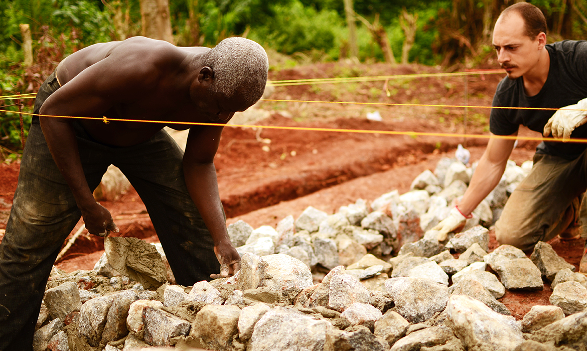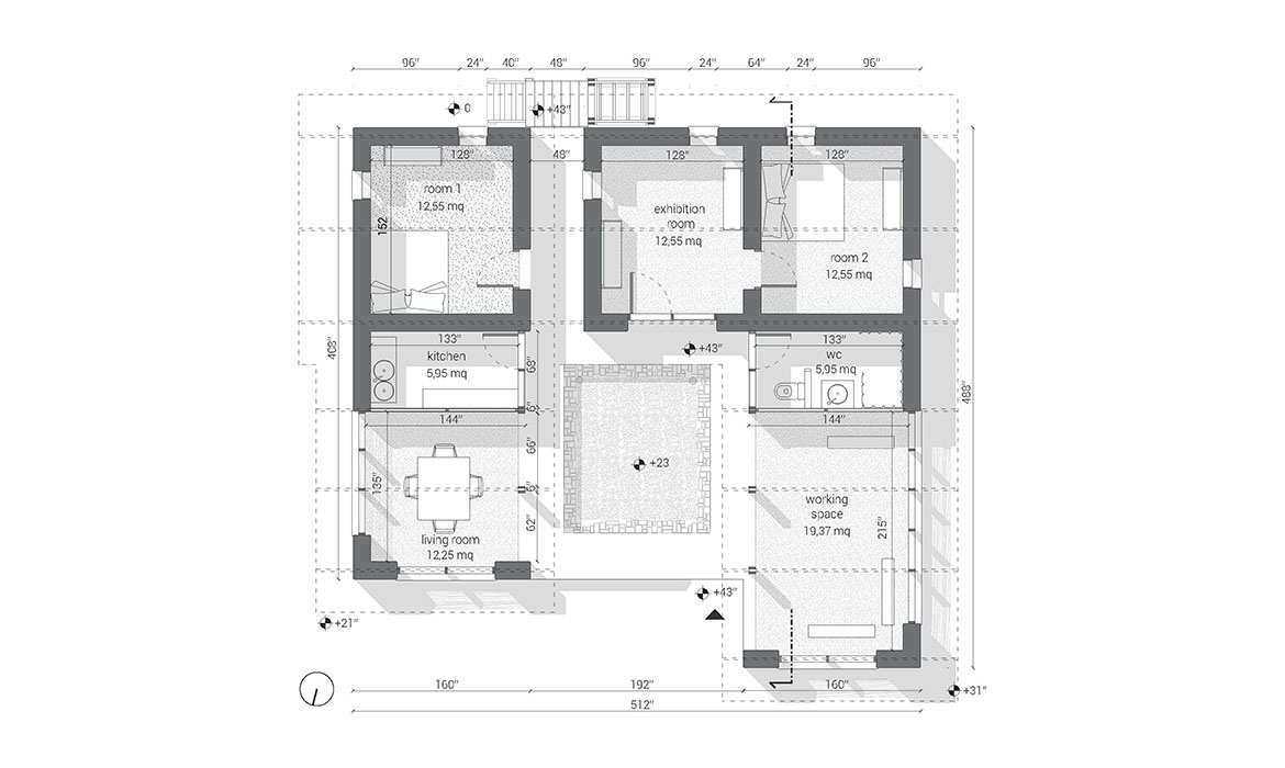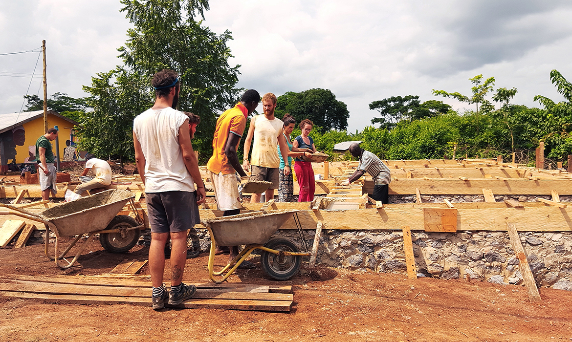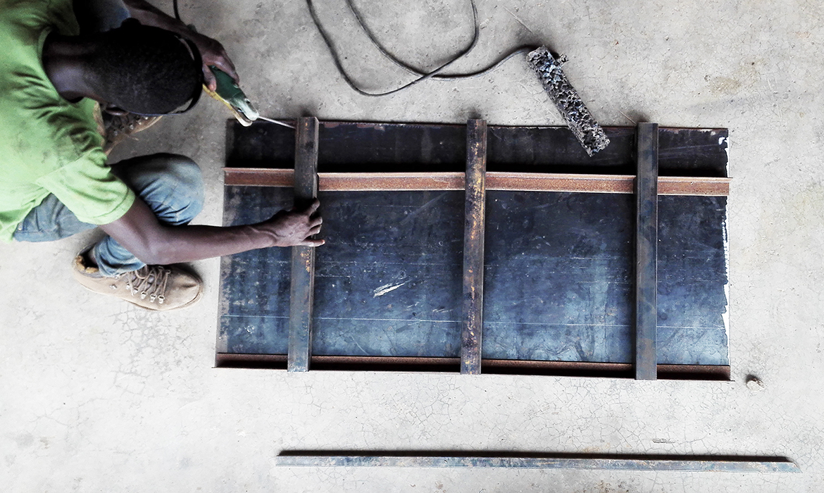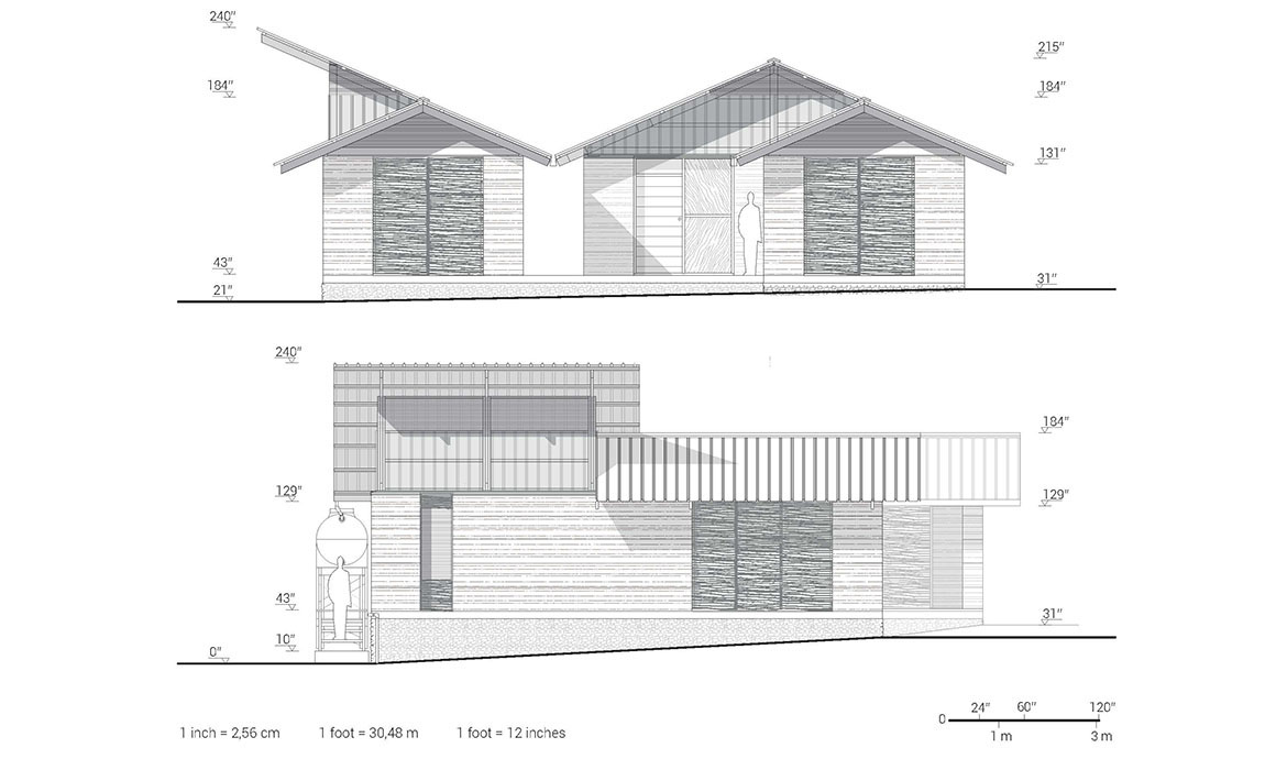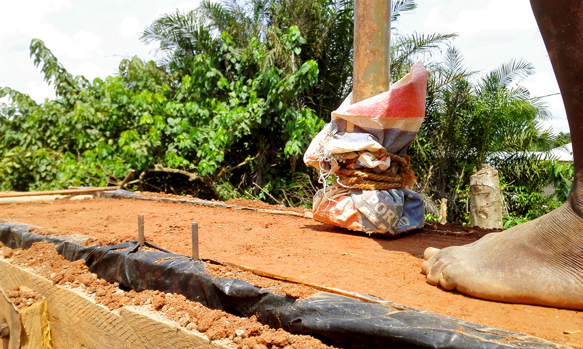The project is also characterized by thick earthen walls, with high thermal mass and small openings on the south-side. The slight slope area offers natural rainwater drainage. Foundations are made by local granite stones and concrete mortar. A reinforced concrete ring beam was then poured to connect the foundations, to ensure even loads and to have a precise top section. The technique used for “eARThouse” provides rammed earth load-bearing walls. Stabilization is given by adding a small percentage of cement  (8%) to the dry mix of sand (10%) and soil (82%), reached through onsite samples. To achieve the widest spread of rammed earth, it must become able to compete with other cheap techniques such as cement blocks, mainly in term of costs, since the main aspects of structural strength and thermal comfort are qualities already recognized by the community. To reduce the construction cost the team designed metal formworks as a community tool, easily and quickly reusable by anyone several times, compared to the common wooden ones. Furthermore, the formworks were tested within a second project, which was totally funded by a local farmer with little money and time.Regarding the electric system, the switches and sockets are integrated inside the rammed walls, to address better quality of internal finishings and proving the equal potentials of this technique compared to others.The project provides a rainwater harvesting system in which the water is filtered and then stored within the water tank which can provide sanitary water to the kitchen and bathroom. Rubber stripes were fixed directly under the covering sheets, using half garden hose, to reduce rainwater noise. The aim was to find out cheap solutions to be reproduced by anyone from different social status, in order to improve living conditions through simple changes.To prevent from direct sunlight the main openings are covered with horizontal canes called Babadua, tied together to make a dense screen. Babadua is a traditional material, locally available and one of the most resistant type of wood against termites and weather, but fallen into disuse as a poor material nowadays. Constraints on resources in such contexts should bring to minimize the waste of material, in fact, rejected wooden boards were reused for frameworks and furniture.In this project sustainability means working with the lowest budget, in order to achieve a cost-effective building according to local dwellers affordability. Reducing the cost, while using natural materials combined with innovative solutions, anyone within the community will be able to enhance his dwelling condition, despite personal resources.
