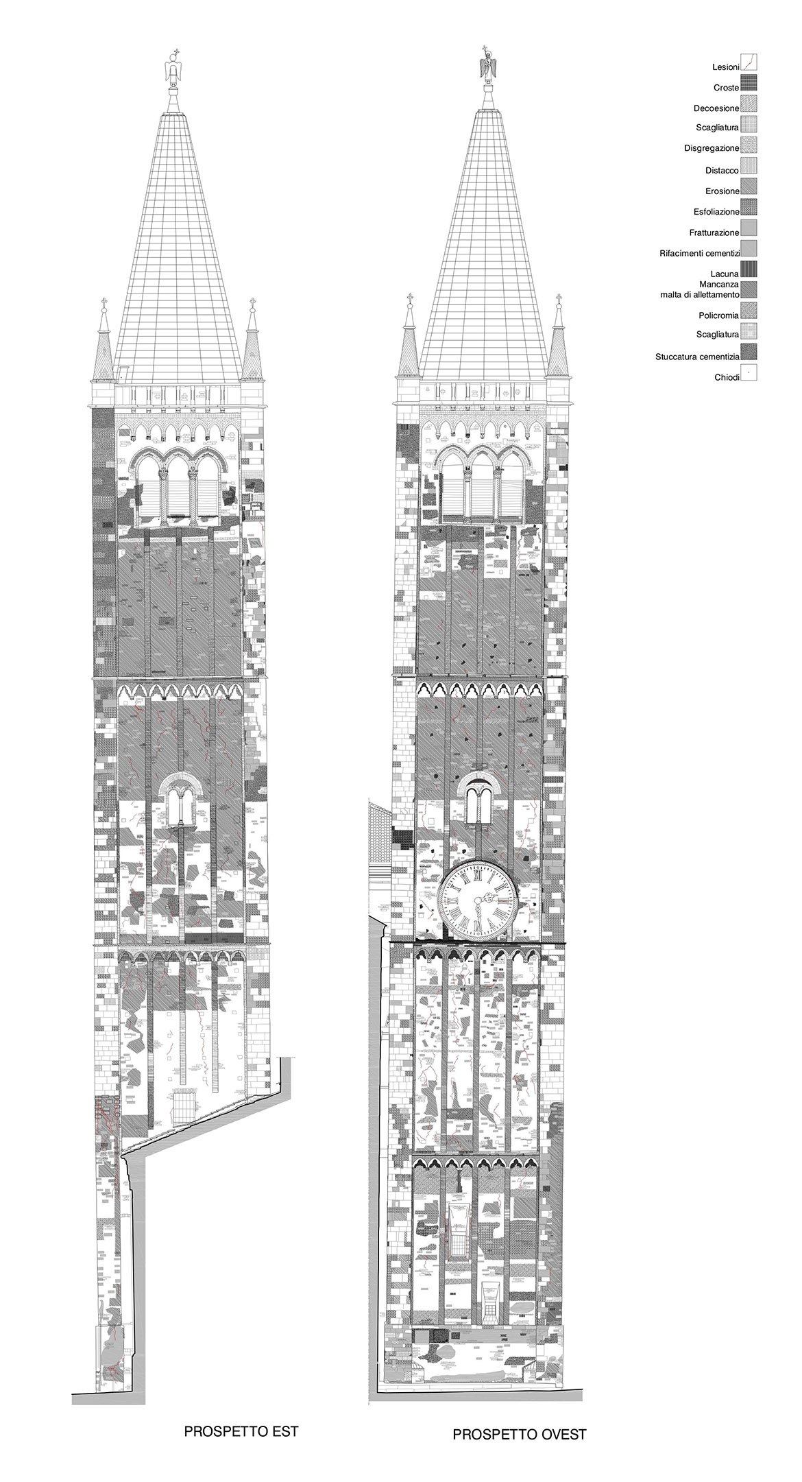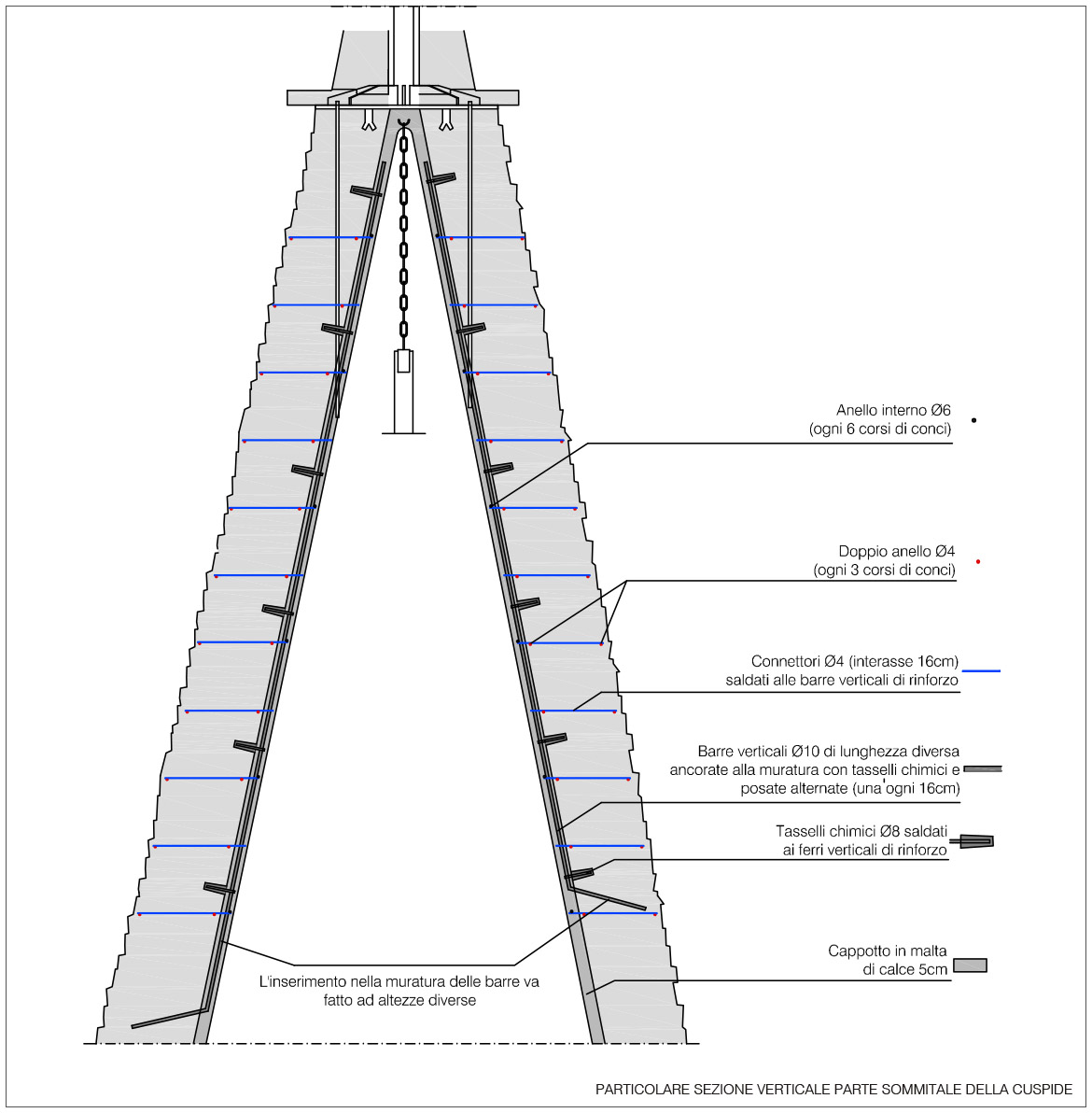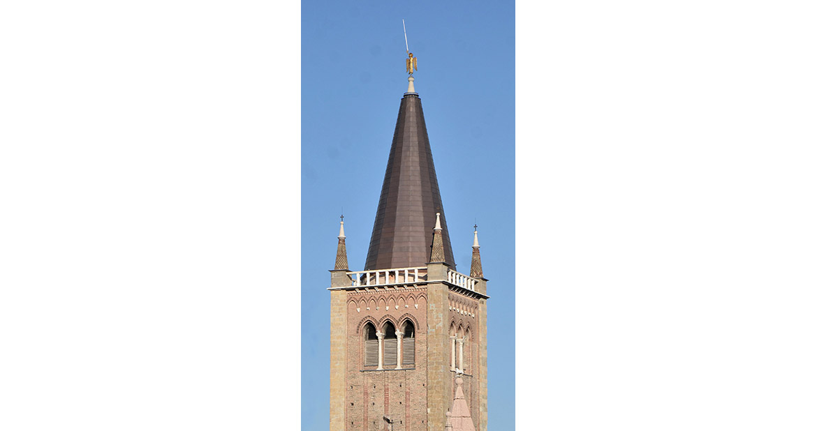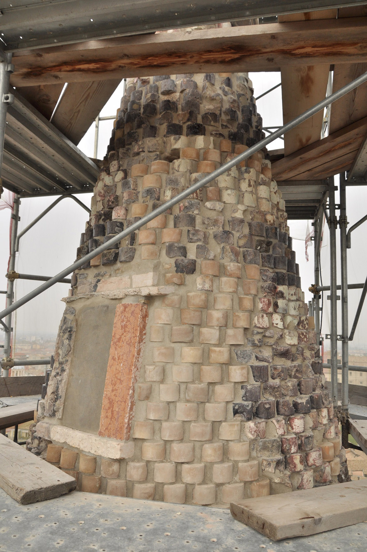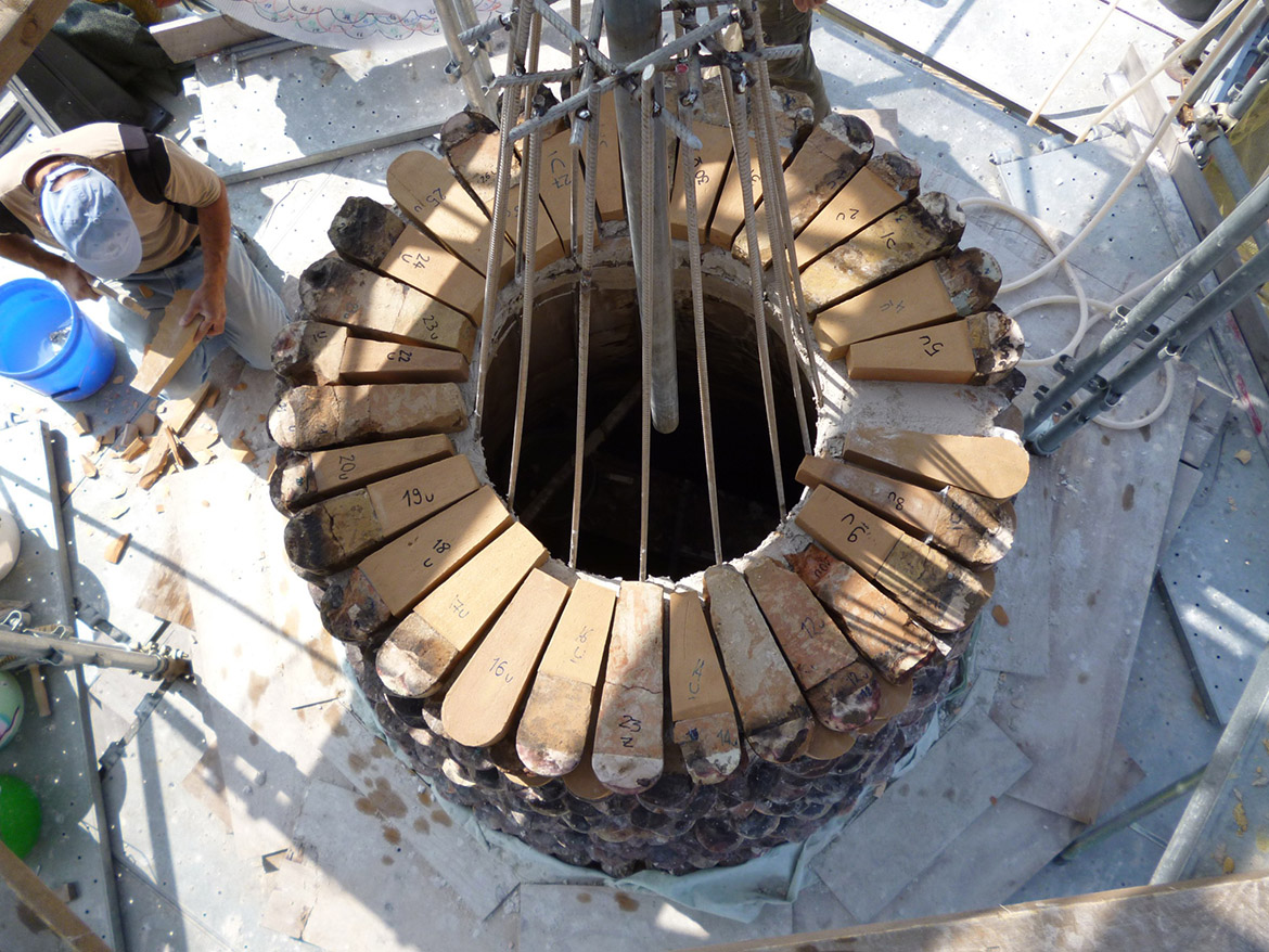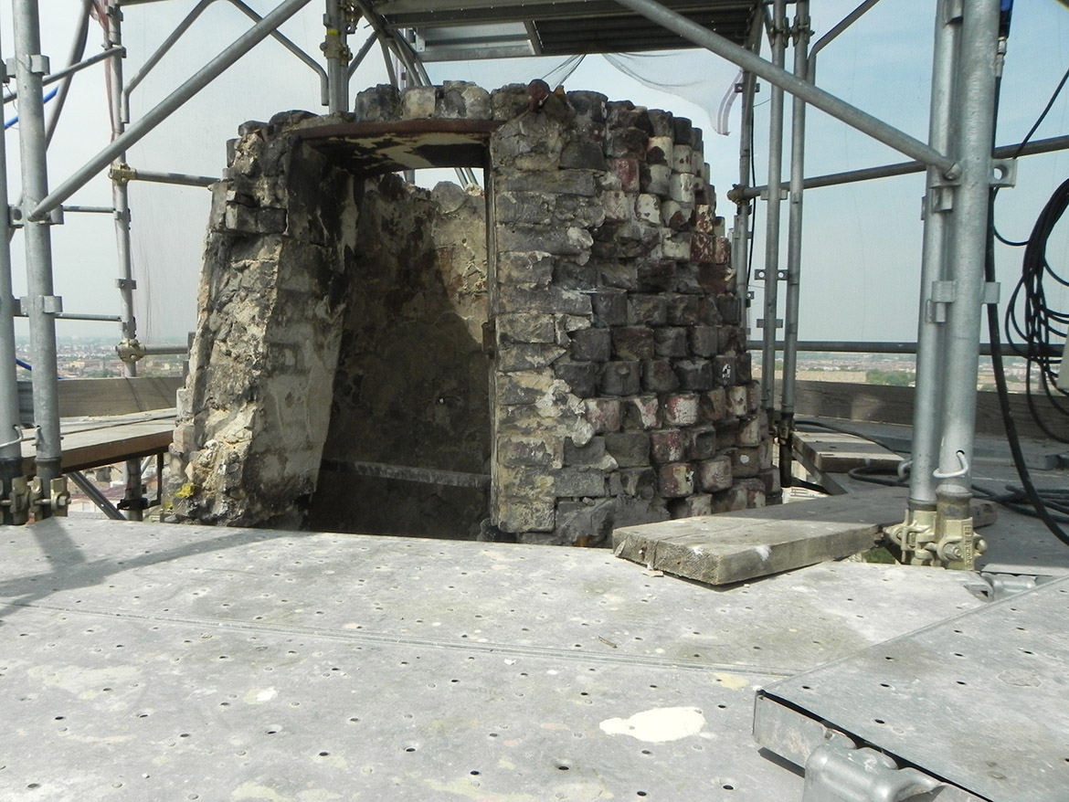 La cuspide si presenta come un grande cono formato da mattoni a forma di cuneo, stondati nella parte anteriore con una finitura a maiolica bianca e nera, a fasce alternate a corsi di quattro file. Nella parte terminale un pennacchio in pietra conclude la muratura conica facendo da base d’appoggio per l’angelo d’orato vero e proprio elemento conclusivo del campanile. La struttura muraria bicroma, svelata con l’incendio, si presentava con lesioni diffuse (soprattutto nella parte terminale) e con diversi elementi fratturati o addirittura mancanti. L’incendio inoltre aveva ricotto il paramento murario fino a provocare in alcuni punti delle deformazioni plastiche degli elementi costruttivi. Con l’avvio del cantiere le prime opere eseguite hanno riguardato la verifica minuta e puntuale di tutto il paramento, per verificarne la reale consistenza, rimuovendo, previa catalogazione, tutti i frammenti in distacco. Questo lavoro è proseguito con la ricerca dell’alloggiamento originario dei frammenti già caduti. L’incollaggio dei frammenti più piccoli è stato eseguito con resina epossidica, mentre quelli di maggiore dimensione sono stati imperniati con barre in vetroresina filettata. Per ridare continuità alla struttura muraria, nei punti dove mancavano gli elementi in cotto, si sono reinseriti nuovi mattoni di forma e dimensioni analoghi agli originali, ma privi della maiolicatura. Complementare al restauro del paramento murario esterno è stato eseguito anche il consolidamento della finitura intonacata all’interno della cuspide, caratterizzato per i primi 5 m da raffigurazioni a graffite e a carboncino, vero e proprio “libro delle presenze” delle maestranze che si sono avvicendate nel corso dei secoli sul campanile e sulla cuspide. Particolarmente complesso è apparso il consolidamento della parte terminale della cuspide, con gli elementi lapidei che sostenevano l’angelo anemografo completamente fratturati e scomposti in più parti. Le condizioni di totale debolezza strutturale e di disgregazione della muratura stessa, hanno imposto lo smontaggio dell’ultima parte della struttura e la sua ricostruzione in anastilosi riposizionando gli elementi smontati nella loro sede originaria, migliorandone le condizioni statiche con la realizzazione di un’armatura metallica interna (sotto intonaco). Completata la ricostruzione e il consolidamento della muratura si è
