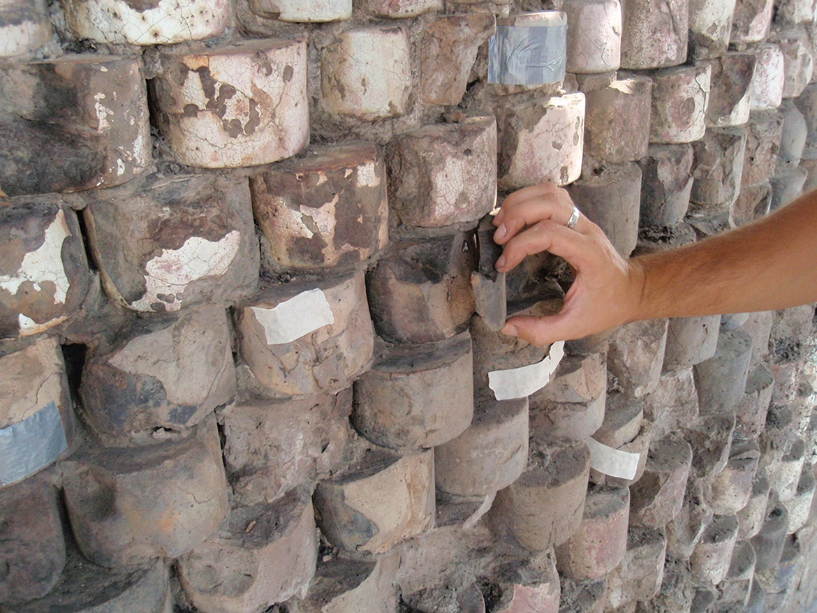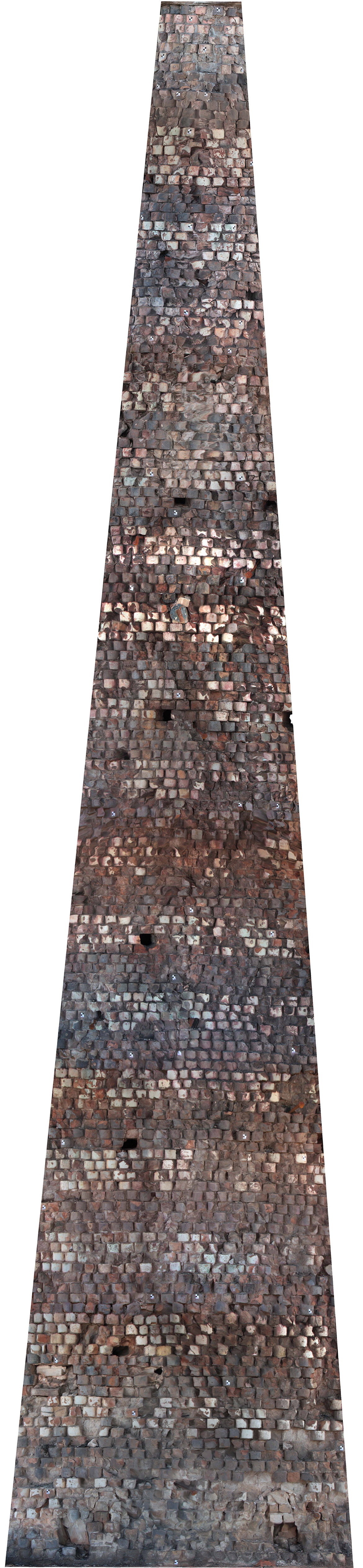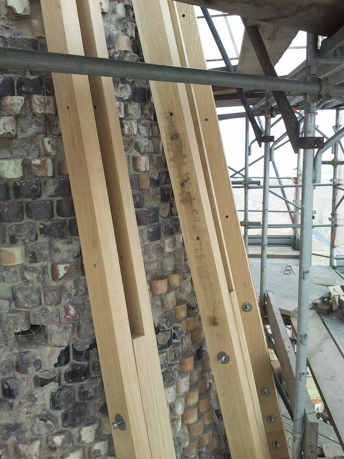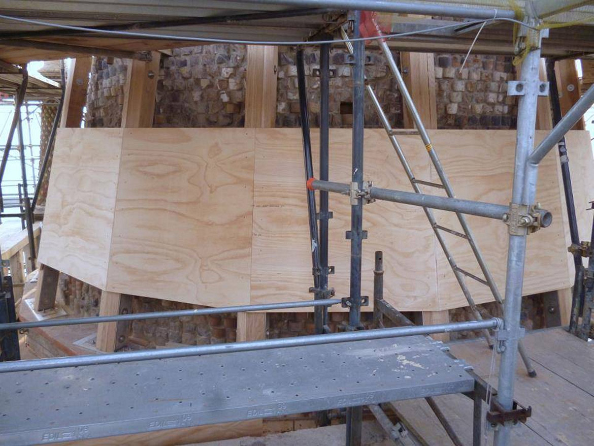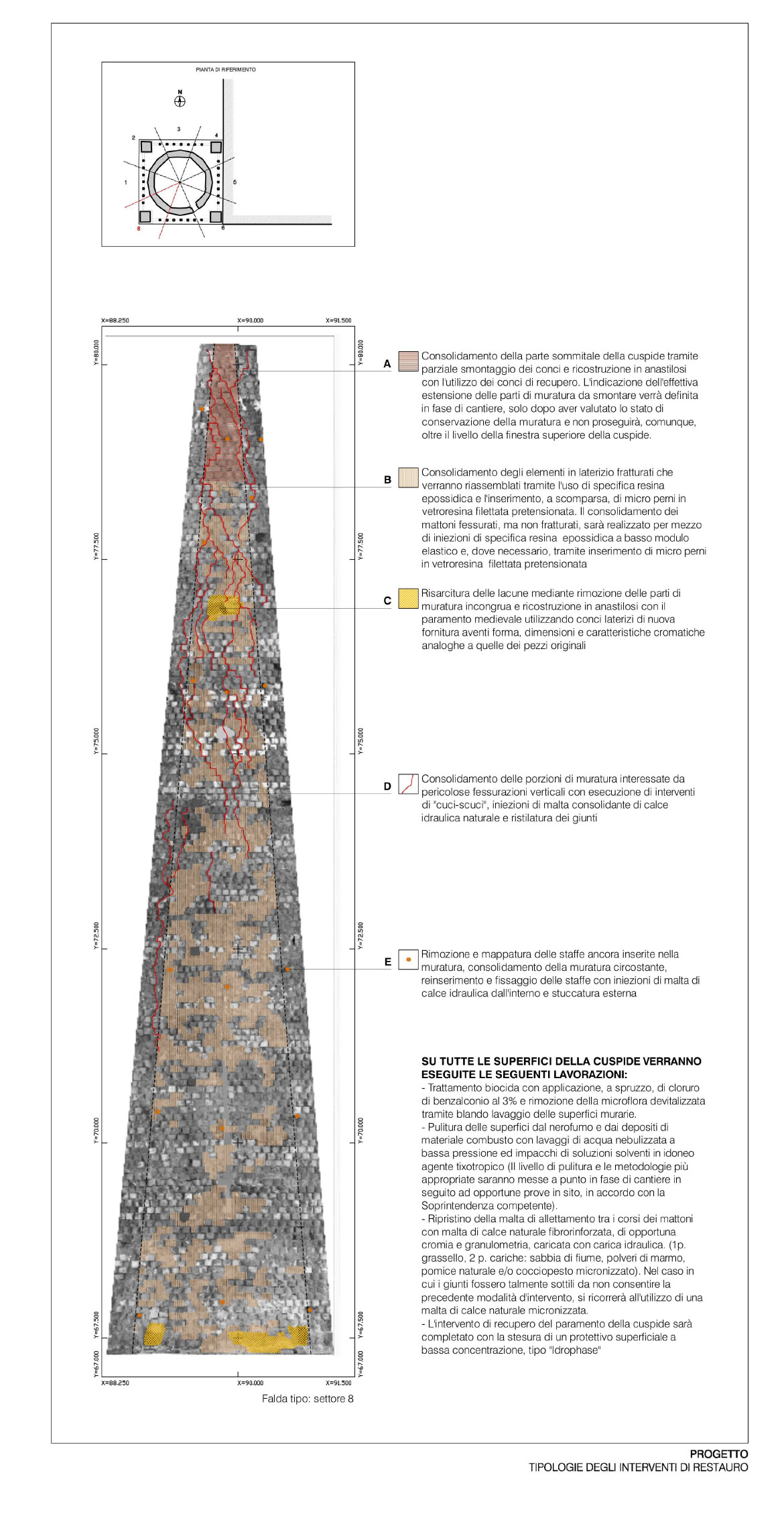 La cuspide si presenta come un grande cono formato da mattoni a forma di cuneo, stondati nella parte anteriore con una finitura a maiolica bianca e nera, a fasce alternate a corsi di quattro file. Nella parte terminale un pennacchio in pietra conclude la muratura conica facendo da base d’appoggio per l’angelo d’orato vero e proprio elemento conclusivo del campanile. La struttura muraria bicroma, svelata con l’incendio, si presentava con lesioni diffuse (soprattutto nella parte terminale) e con diversi elementi fratturati o addirittura mancanti. L’incendio inoltre aveva ricotto il paramento murario fino a provocare in alcuni punti delle deformazioni plastiche degli elementi costruttivi. Con l’avvio del cantiere le prime opere eseguite hanno riguardato la verifica minuta e puntuale di tutto il paramento, per verificarne la reale consistenza, rimuovendo, previa catalogazione, tutti i frammenti in distacco. Questo lavoro è proseguito con la ricerca dell’alloggiamento originario dei frammenti già caduti. L’incollaggio dei frammenti più piccoli è stato eseguito con resina epossidica, mentre quelli di maggiore dimensione sono stati imperniati con barre in vetroresina filettata. Per ridare continuità alla struttura muraria, nei punti dove mancavano gli elementi in cotto, si sono reinseriti nuovi mattoni di forma e dimensioni analoghi agli originali, ma privi della maiolicatura. Complementare al restauro del paramento murario esterno è stato eseguito anche il consolidamento della finitura intonacata all’interno della cuspide, caratterizzato per i primi 5 m da raffigurazioni a graffite e a carboncino, vero e proprio “libro delle presenze” delle maestranze che si sono avvicendate nel corso dei secoli sul campanile e sulla cuspide. Particolarmente complesso è apparso il consolidamento della parte terminale della cuspide, con gli elementi lapidei che sostenevano l’angelo anemografo completamente fratturati e scomposti in più parti. Le condizioni di totale debolezza strutturale e di disgregazione della muratura stessa, hanno imposto lo smontaggio dell’ultima parte della struttura e la sua ricostruzione in anastilosi riposizionando gli elementi smontati nella loro sede originaria, migliorandone le condizioni statiche con la realizzazione di un’armatura metallica interna (sotto intonaco). Completata la ricostruzione e il consolidamento della muratura si è