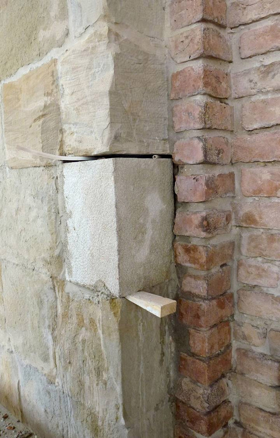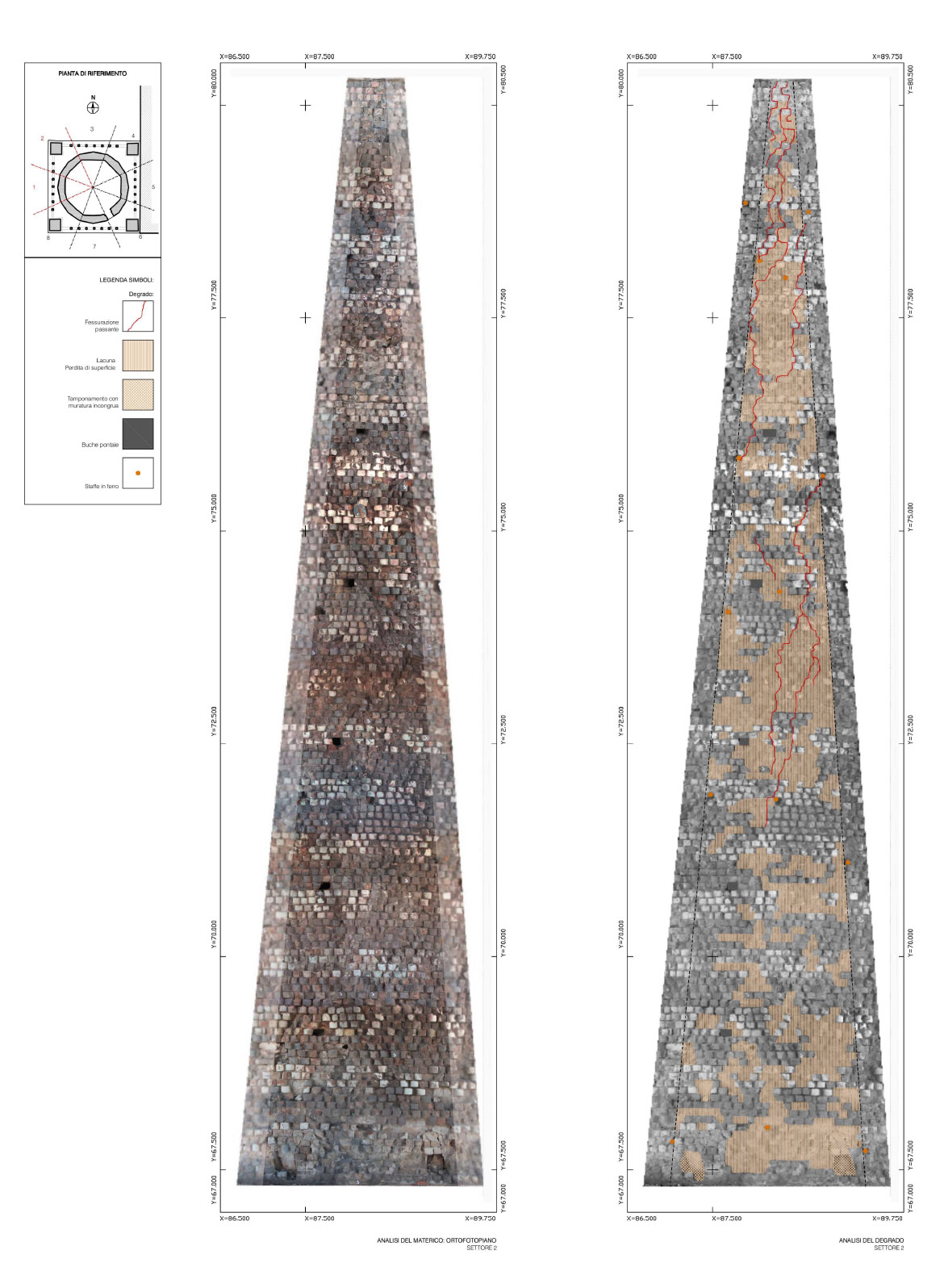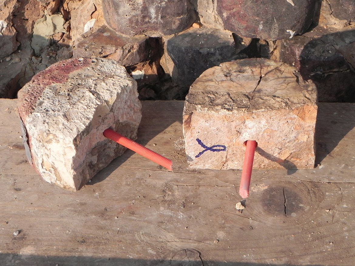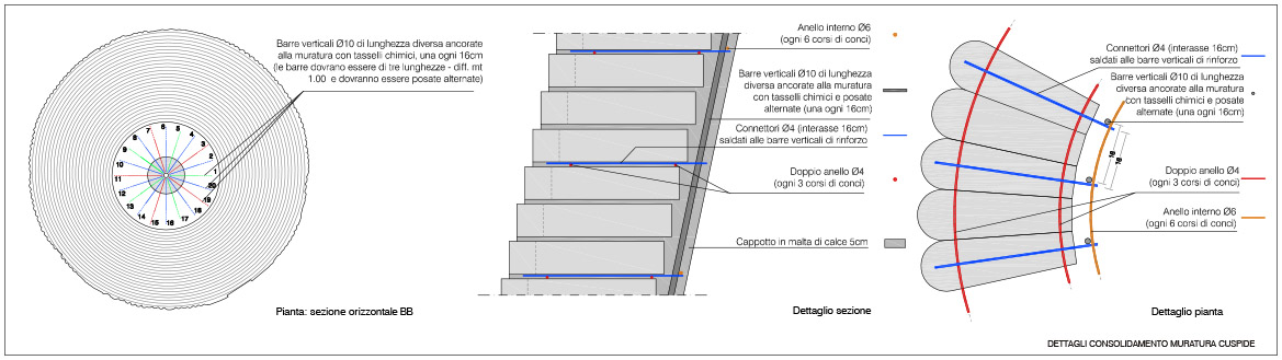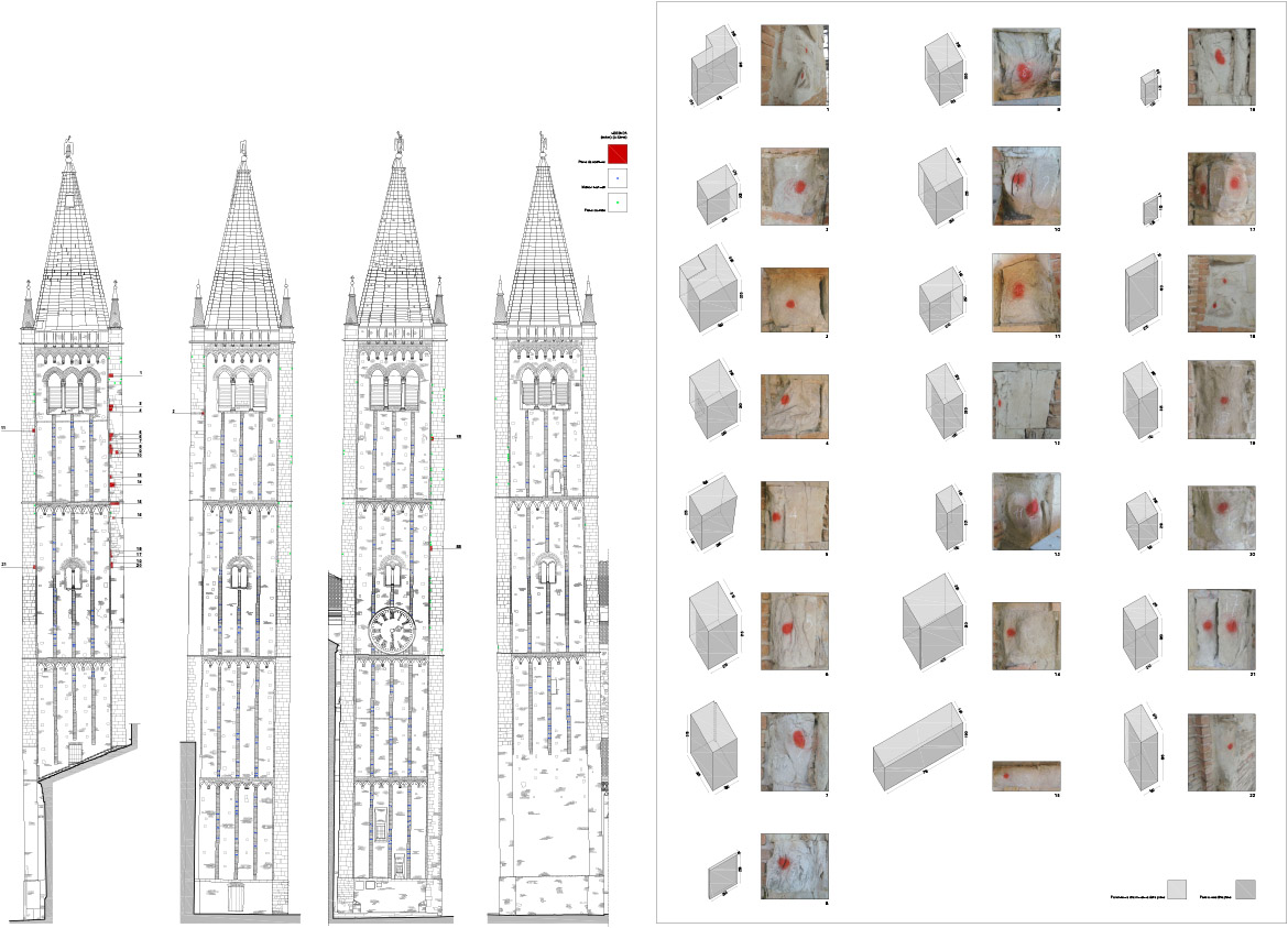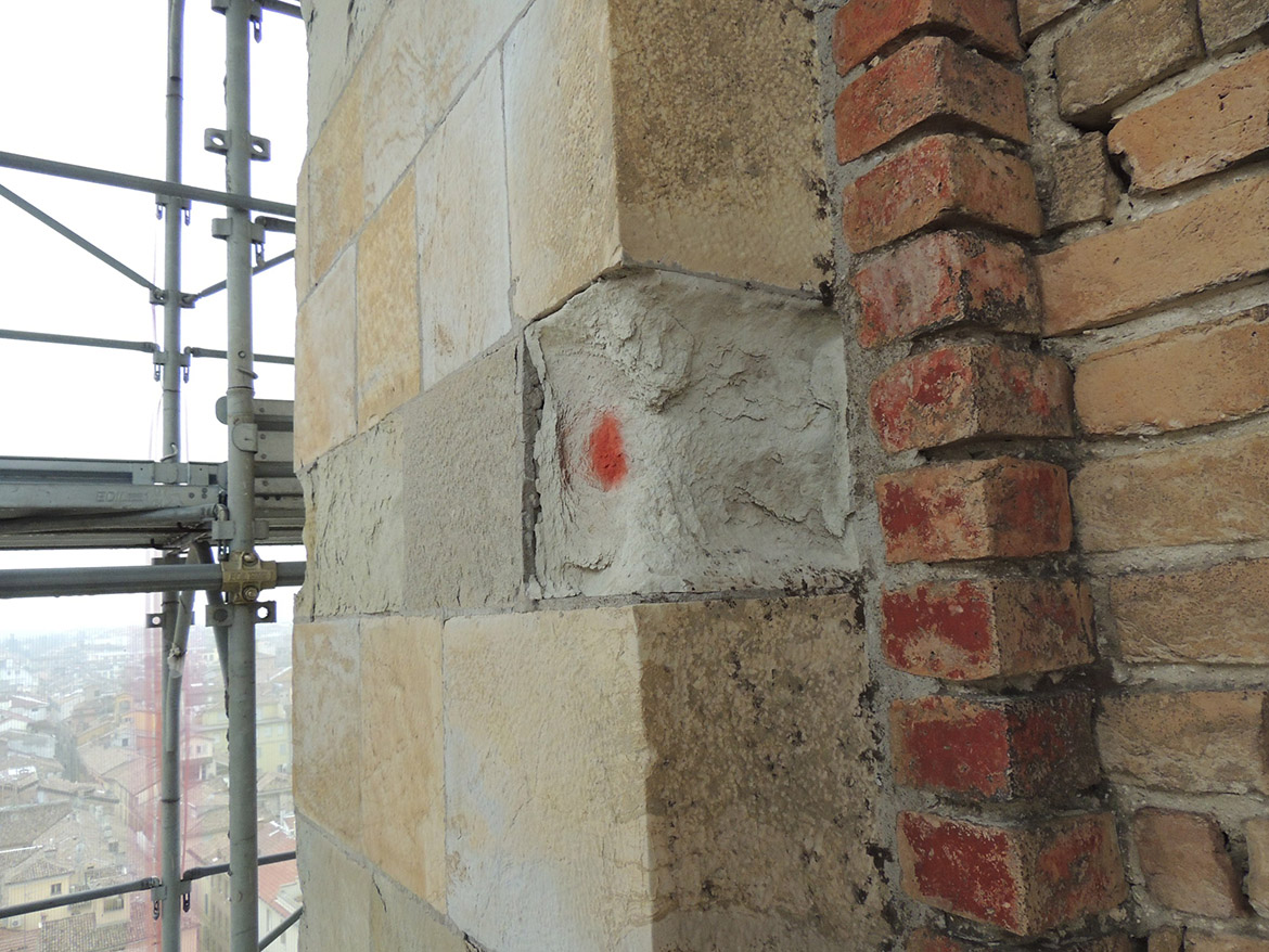 ottenere una continuità cromatica con gli elementi in pietra. Nei conci angolari, maggiormente soggetti allo schiacciamento causato dall’oscillamento del campanile, con la formazione di fessurazioni verticali seguenti la stratigrafia dei masselli in arenaria, si è realizzato il taglio della linea di contatto fra i conci con disco diamantato per aumentarne la sezione, creando un giunto di dilatazione adeguato. In alcuni spigoli fessurati i masselli in arenaria sono stati consolidati mediante microimperniature con trefoli in acciaio ancorati con resina epossidica. Un numero limitato di pezzi in arenaria, totalmente fessurati e con grosse lacune, sono stati rimossi e sostituiti, previa opportuna mappatura. Le lavorazioni sono state particolarmente complesse, dovendo rimuovere attraverso carotaggi le parti compromesse, per non danneggiare con le vibrazioni il paramento conservato. Una volta estratte le porzioni degradate, sono stati inseriti negli alloggiamenti dei conci rimossi i masselli di nuova realizzazione, in pietra di Manciano, con dimensioni adeguate e funzionali a garantire la stabilità della muratura, legati con malta di allettamento in calce idraulica naturale e riempiendo i vuoti interni alla muratura con malte fluide fino a ricomporre la struttura muraria. Il trattamento superficiale dei lati a vista dei masselli sono stati lasciati al neutro, eseguendo una finitura differente rispetto ai conci storici, per consentire la riconoscibilità.