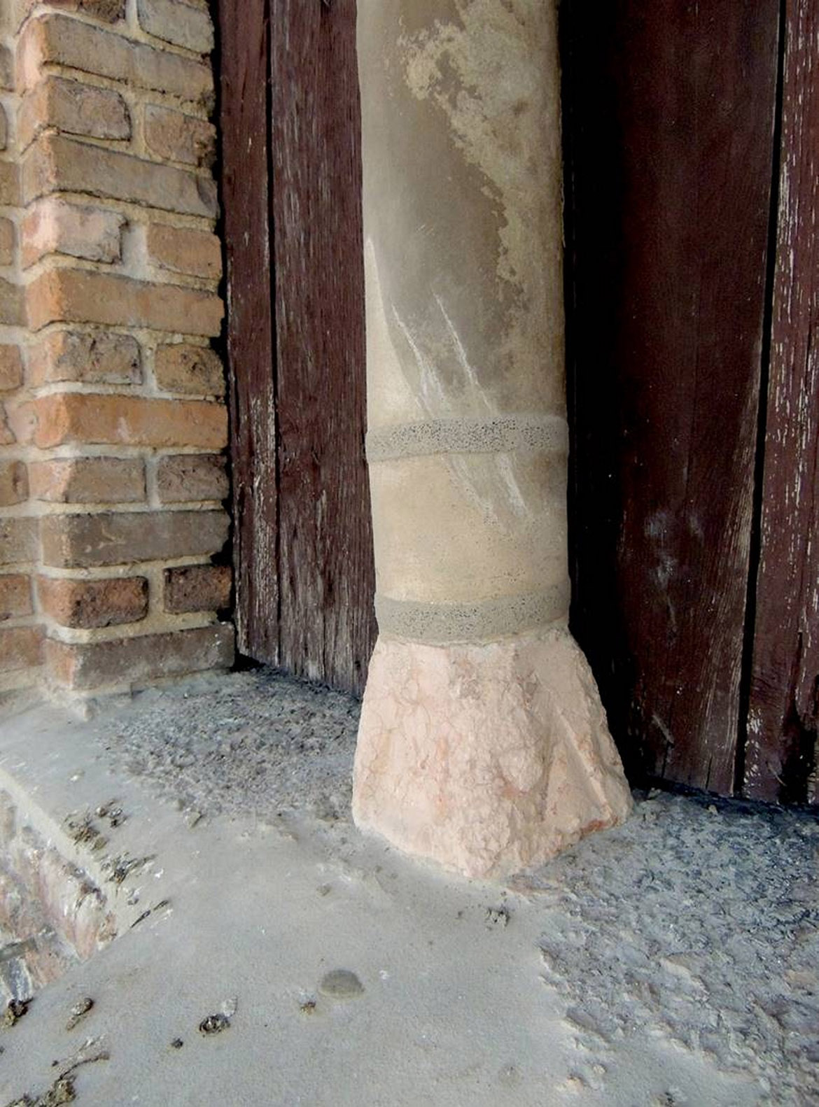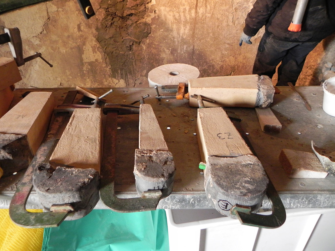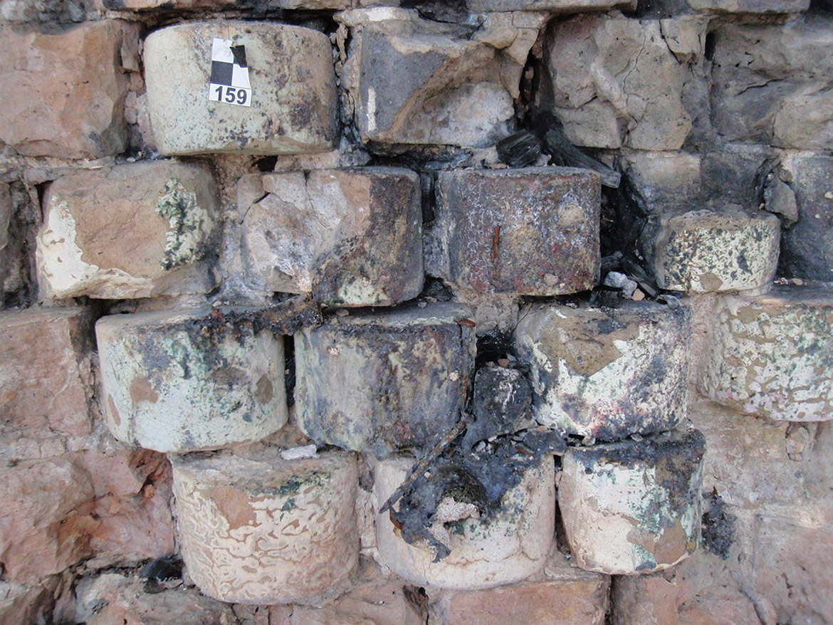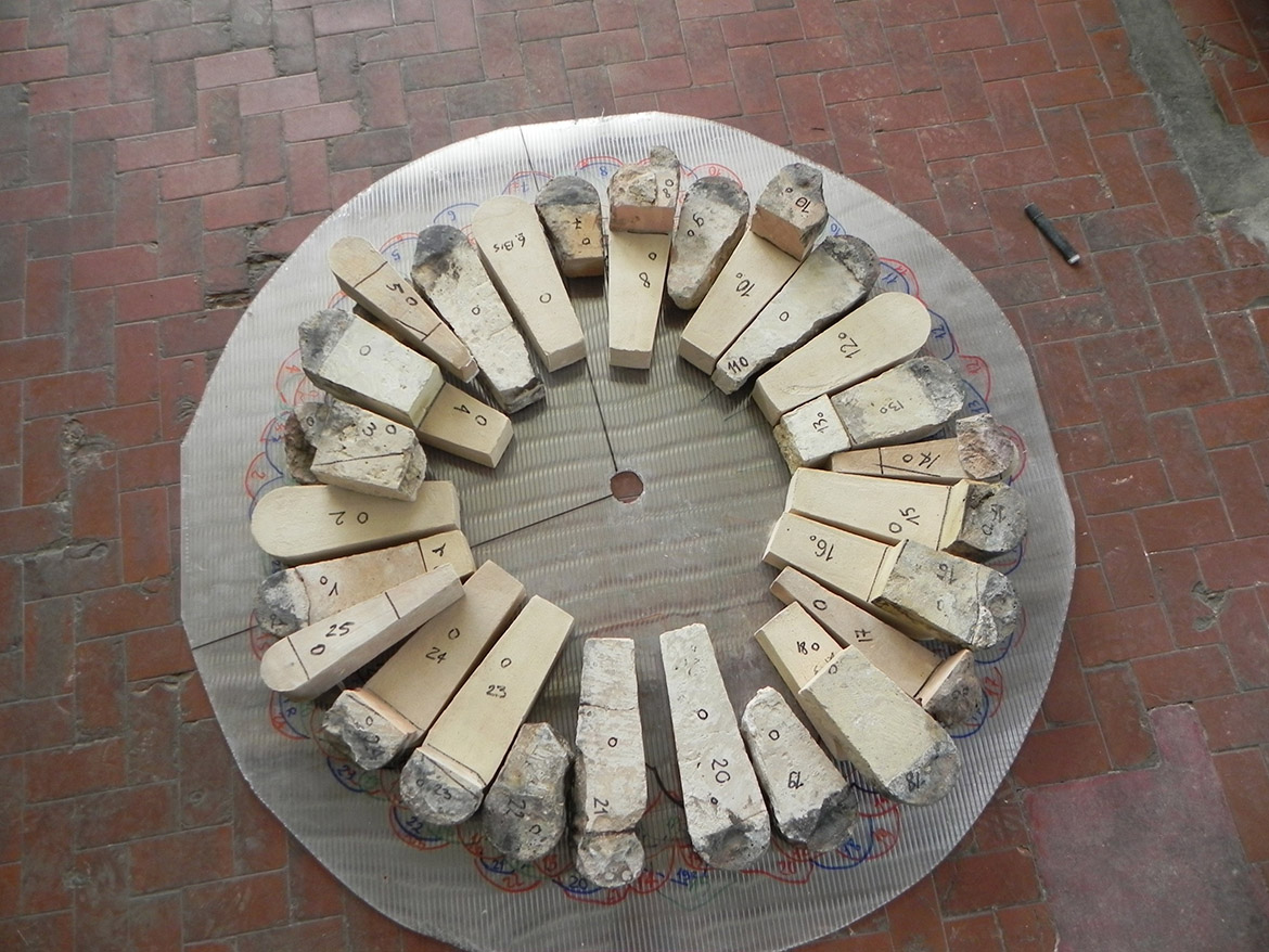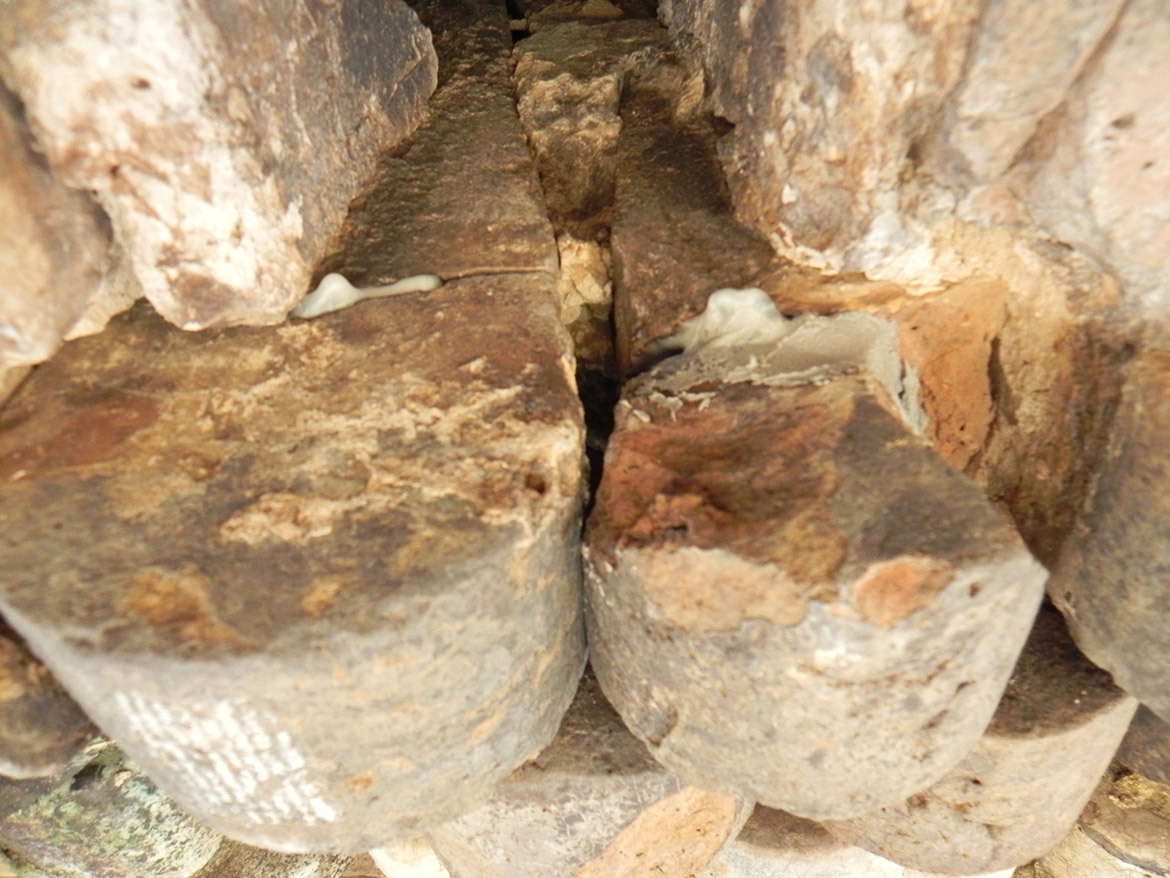 ottenere una continuità cromatica con gli elementi in pietra. Nei conci angolari, maggiormente soggetti allo schiacciamento causato dall’oscillamento del campanile, con la formazione di fessurazioni verticali seguenti la stratigrafia dei masselli in arenaria, si è realizzato il taglio della linea di contatto fra i conci con disco diamantato per aumentarne la sezione, creando un giunto di dilatazione adeguato. In alcuni spigoli fessurati i masselli in arenaria sono stati consolidati mediante microimperniature con trefoli in acciaio ancorati con resina epossidica. Un numero limitato di pezzi in arenaria, totalmente fessurati e con grosse lacune, sono stati rimossi e sostituiti, previa opportuna mappatura. Le lavorazioni sono state particolarmente complesse, dovendo rimuovere attraverso carotaggi le parti compromesse, per non danneggiare con le vibrazioni il paramento conservato. Una volta estratte le porzioni degradate, sono stati inseriti negli alloggiamenti dei conci rimossi i masselli di nuova realizzazione, in pietra di Manciano, con dimensioni adeguate e funzionali a garantire la stabilità della muratura, legati con malta di allettamento in calce idraulica naturale e riempiendo i vuoti interni alla muratura con malte fluide fino a ricomporre la struttura muraria. Il trattamento superficiale dei lati a vista dei masselli sono stati lasciati al neutro, eseguendo una finitura differente rispetto ai conci storici, per consentire la riconoscibilità.