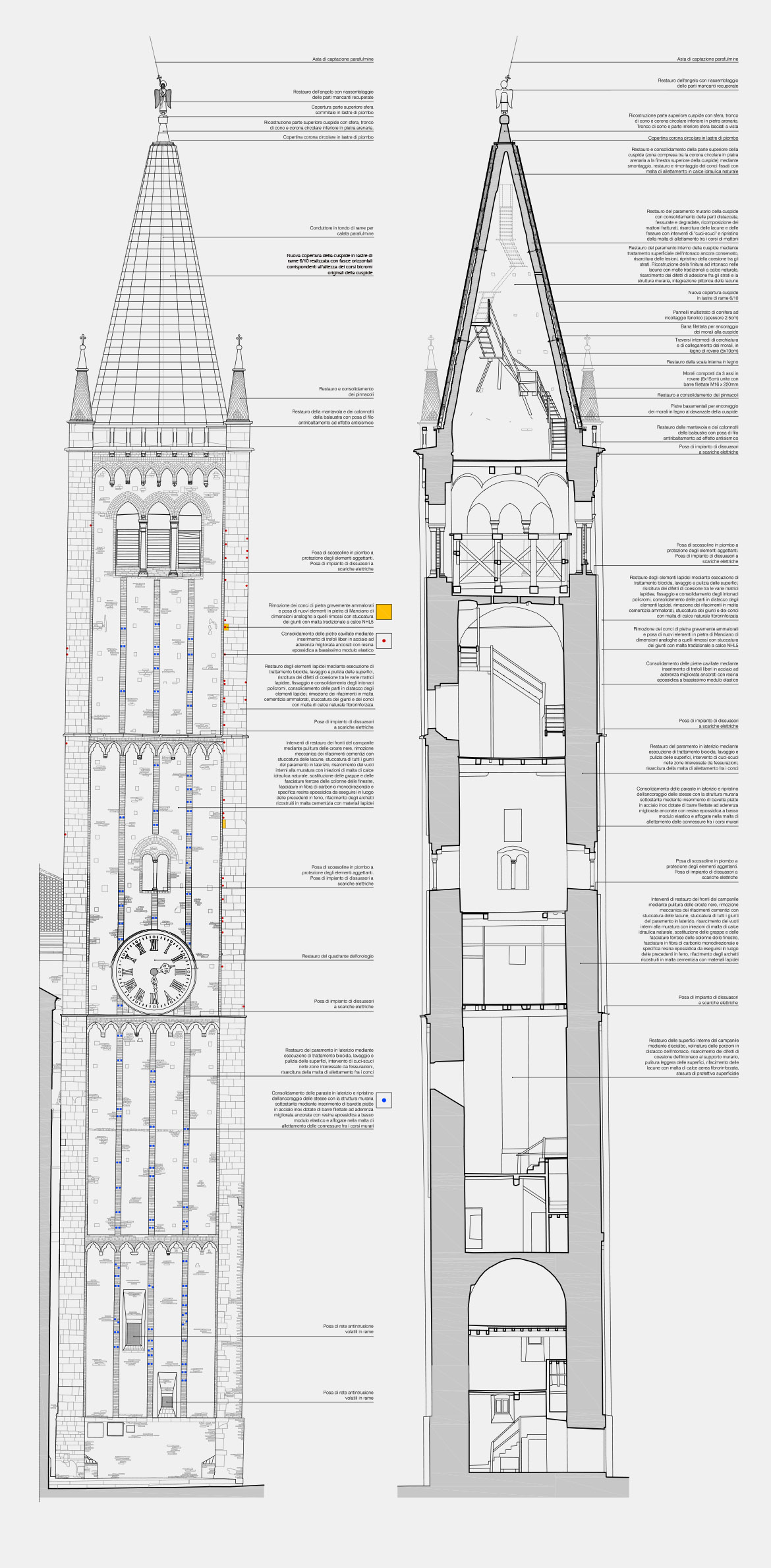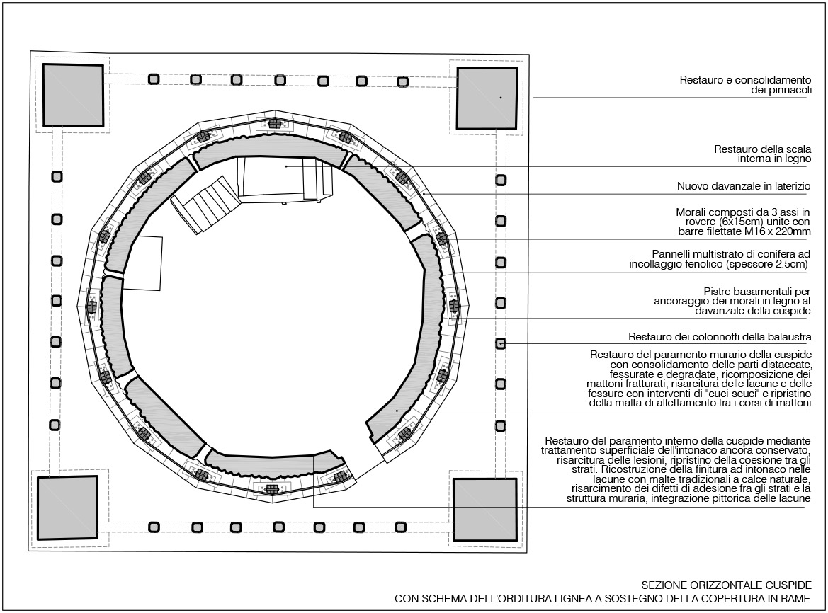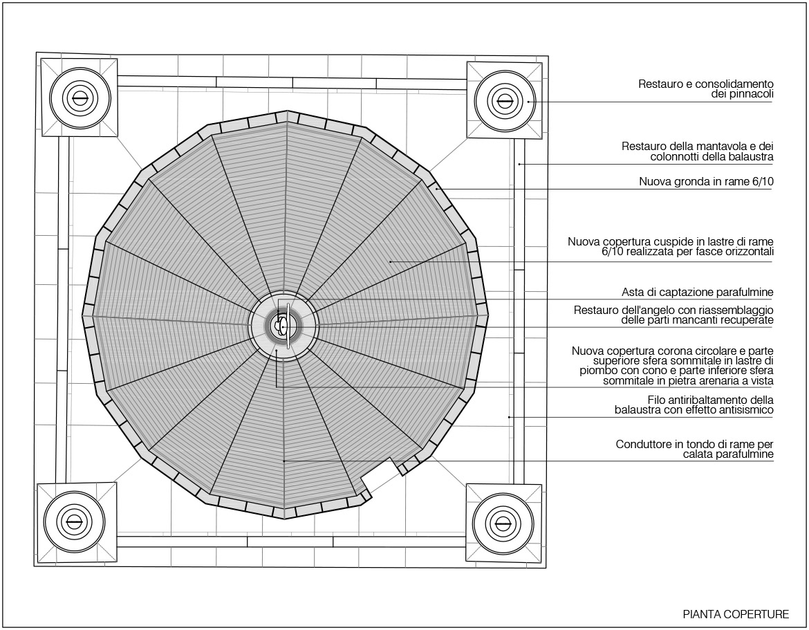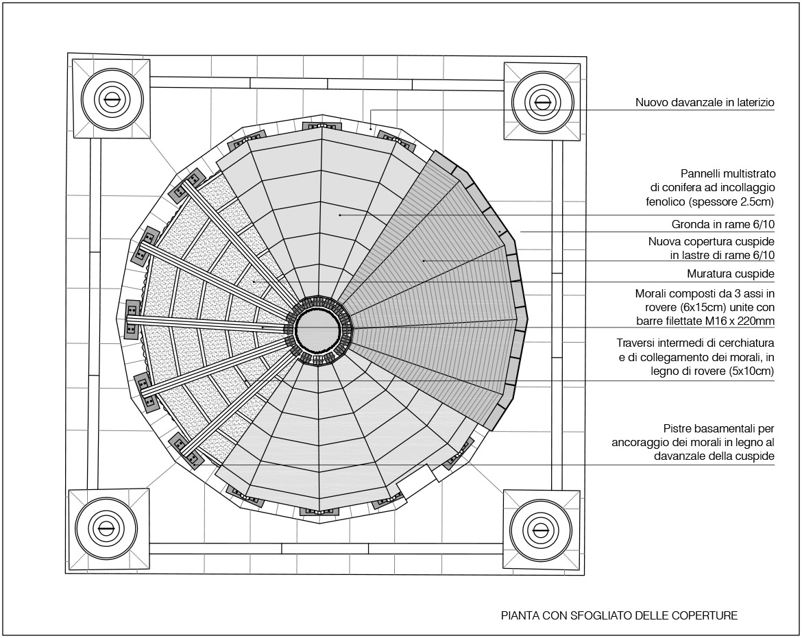 intervenuti sul pinnacolo terminale (ricostruendolo in anastilosi con pietra arenaria di Manciano) e sul nuovo sistema di captazione delle scariche elettriche, inserendo all’interno cavo della statua un complesso sistema di trasmissione che potesse permettere all’angelo di ruotare liberamente col vento e contemporaneamente collegare il parafulmine (posto in continuità con la croce dell’angelo con le calate in rame). Se per il rivestimento in rame c’erano documentazioni fotografiche che ne attestavano forma e dimensioni, per il castello ligneo di supporto, posto a ridosso della cuspide in muratura, non esistevano elementi che ne certificassero le dimensioni e la tipologia considerando anche che l’incendio ne aveva cancellato completamente la struttura. Se la struttura lignea portante in precedenza era strettamente vincolata a quella muraria tramite chiodature in ferro, aumentandone però con il tempo il degrado con fratture e lesioni, quella nuova è stata pensata come una struttura autoportante che poggia sui davanzali in cotto posti alla base del cono in muratura. In questo modo le travi composte lignee, legate da grandi pannelli in multistrato marino, rimangono separate dal muro in modo da non interferire con la struttura restaurata, limitando solo a pochissimi punti la presenza di elementi distanziatori elastici rivestiti da grandi spessori in feltro. L’ultimo intervento sulla cuspide ha interessato la posa della copertura in lastre di rame. La disposizione dei tagli orizzontali ha ripreso la sequenza degli strati cromatici della cuspide maiolicata, mentre i giunti verticali, rivoltati alternativamente a destra e sinistra degli spigoli delle lastre tendono ad attenuare la linea netta di separazione tra esse, recuperando idealmente la dimensione continua della superficie conica originaria della cuspide medievale.