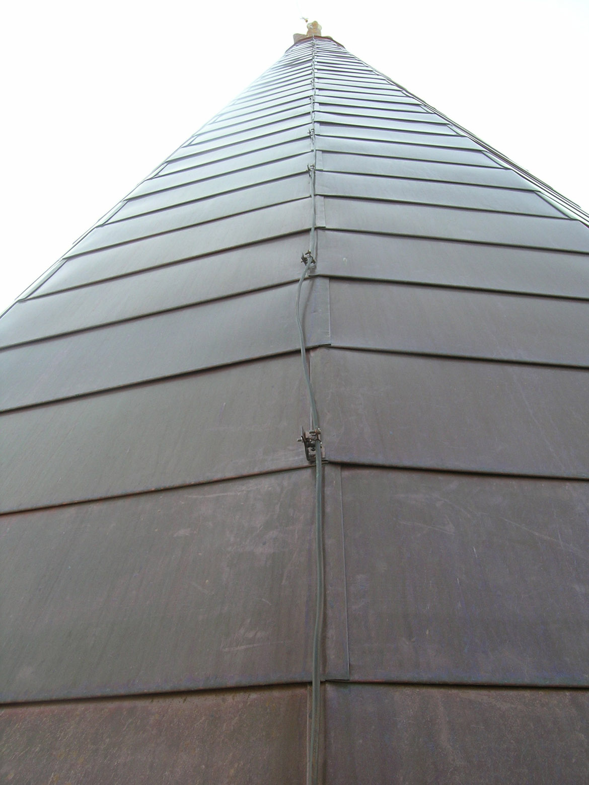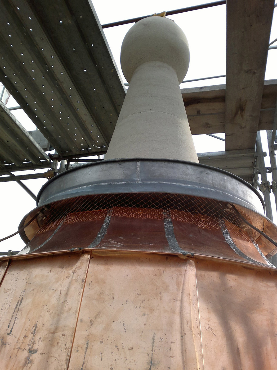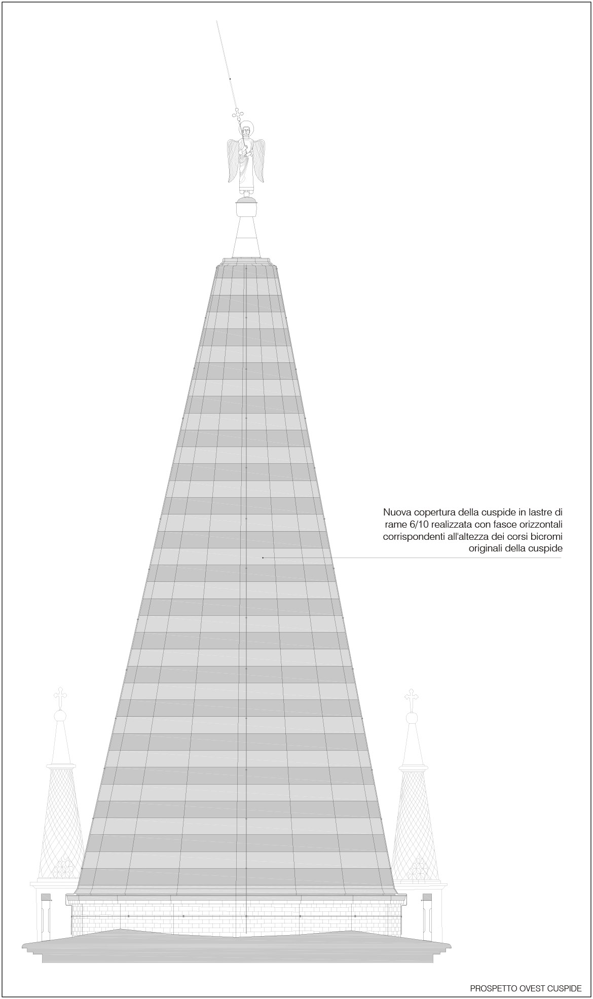 intervenuti sul pinnacolo terminale (ricostruendolo in anastilosi con pietra arenaria di Manciano) e sul nuovo sistema di captazione delle scariche elettriche, inserendo all’interno cavo della statua un complesso sistema di trasmissione che potesse permettere all’angelo di ruotare liberamente col vento e contemporaneamente collegare il parafulmine (posto in continuità con la croce dell’angelo con le calate in rame). Se per il rivestimento in rame c’erano documentazioni fotografiche che ne attestavano forma e dimensioni, per il castello ligneo di supporto, posto a ridosso della cuspide in muratura, non esistevano elementi che ne certificassero le dimensioni e la tipologia considerando anche che l’incendio ne aveva cancellato completamente la struttura. Se la struttura lignea portante in precedenza era strettamente vincolata a quella muraria tramite chiodature in ferro, aumentandone però con il tempo il degrado con fratture e lesioni, quella nuova è stata pensata come una struttura autoportante che poggia sui davanzali in cotto posti alla base del cono in muratura. In questo modo le travi composte lignee, legate da grandi pannelli in multistrato marino, rimangono separate dal muro in modo da non interferire con la struttura restaurata, limitando solo a pochissimi punti la presenza di elementi distanziatori elastici rivestiti da grandi spessori in feltro. L’ultimo intervento sulla cuspide ha interessato la posa della copertura in lastre di rame. La disposizione dei tagli orizzontali ha ripreso la sequenza degli strati cromatici della cuspide maiolicata, mentre i giunti verticali, rivoltati alternativamente a destra e sinistra degli spigoli delle lastre tendono ad attenuare la linea netta di separazione tra esse, recuperando idealmente la dimensione continua della superficie conica originaria della cuspide medievale.