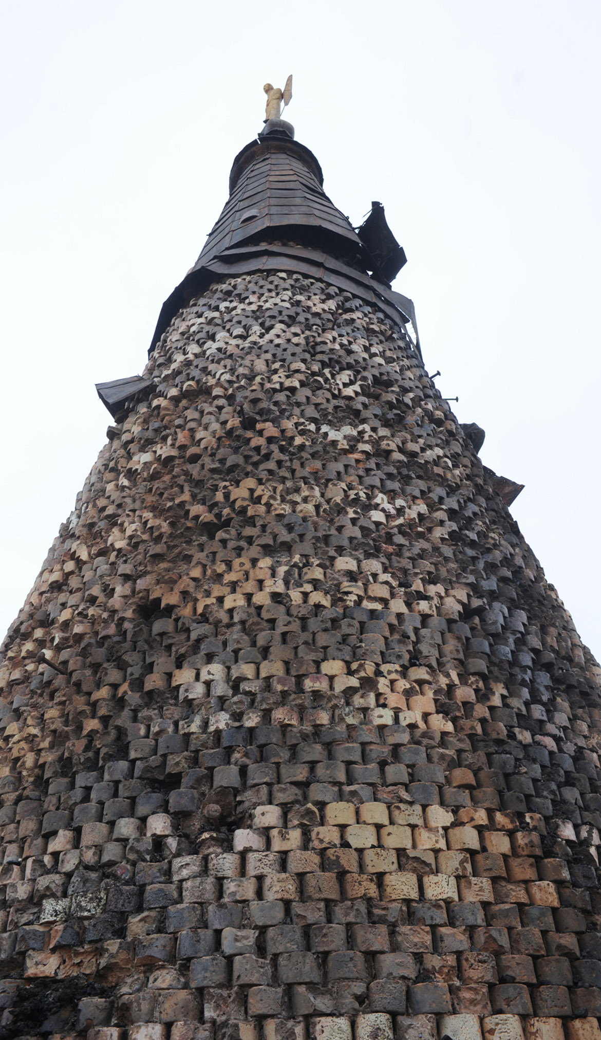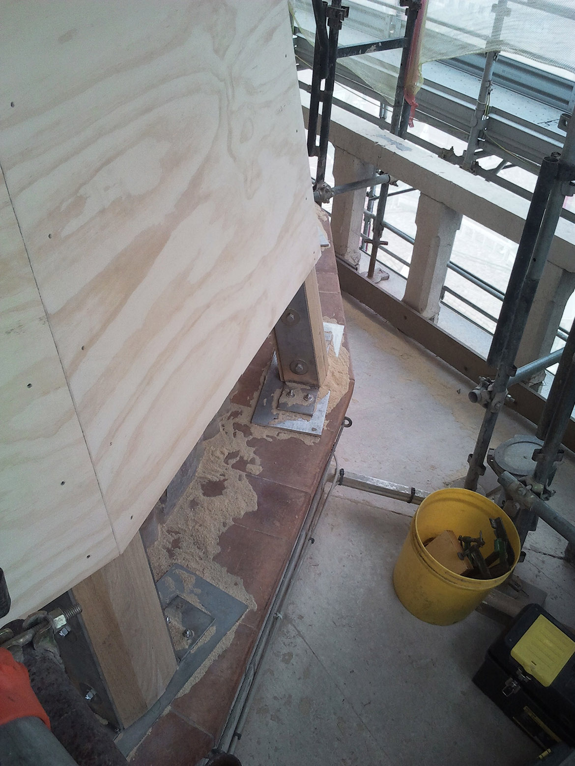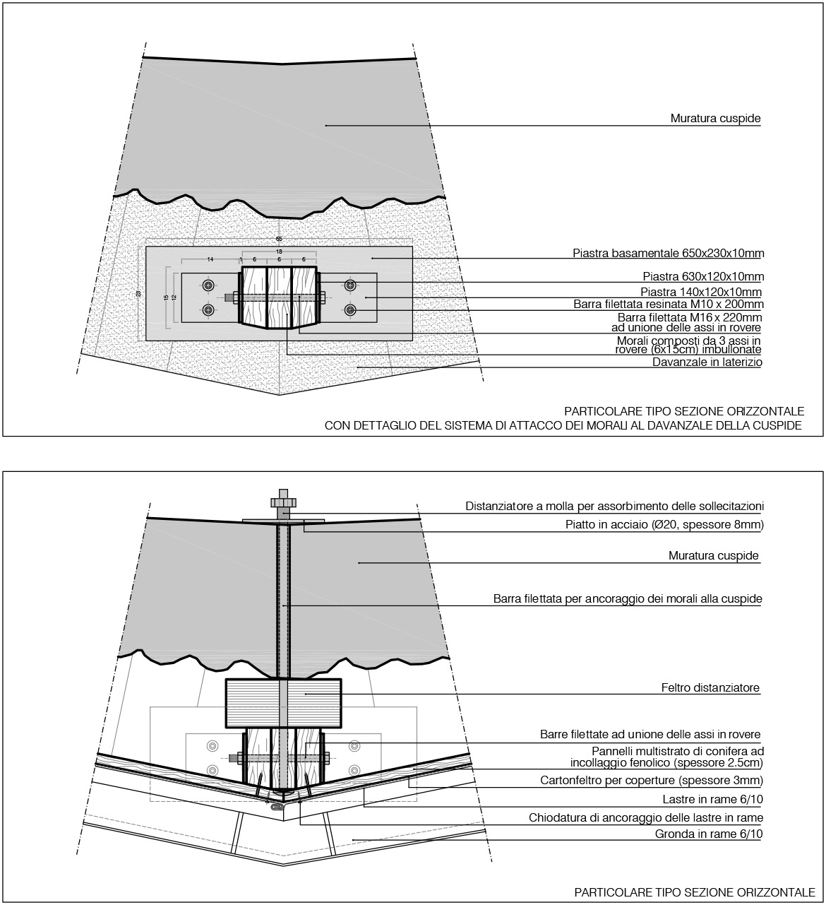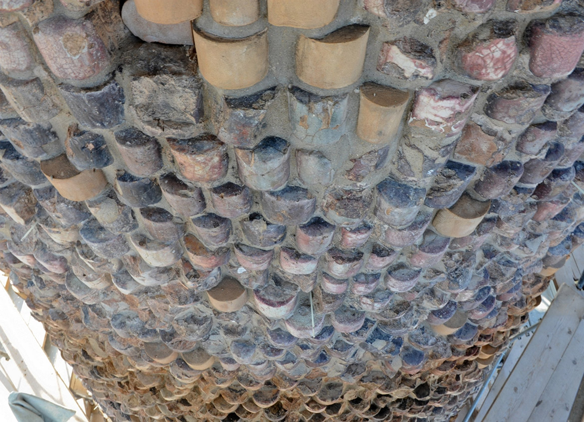 intervenuti sul pinnacolo terminale (ricostruendolo in anastilosi con pietra arenaria di Manciano) e sul nuovo sistema di captazione delle scariche elettriche, inserendo all’interno cavo della statua un complesso sistema di trasmissione che potesse permettere all’angelo di ruotare liberamente col vento e contemporaneamente collegare il parafulmine (posto in continuità con la croce dell’angelo con le calate in rame). Se per il rivestimento in rame c’erano documentazioni fotografiche che ne attestavano forma e dimensioni, per il castello ligneo di supporto, posto a ridosso della cuspide in muratura, non esistevano elementi che ne certificassero le dimensioni e la tipologia considerando anche che l’incendio ne aveva cancellato completamente la struttura. Se la struttura lignea portante in precedenza era strettamente vincolata a quella muraria tramite chiodature in ferro, aumentandone però con il tempo il degrado con fratture e lesioni, quella nuova è stata pensata come una struttura autoportante che poggia sui davanzali in cotto posti alla base del cono in muratura. In questo modo le travi composte lignee, legate da grandi pannelli in multistrato marino, rimangono separate dal muro in modo da non interferire con la struttura restaurata, limitando solo a pochissimi punti la presenza di elementi distanziatori elastici rivestiti da grandi spessori in feltro. L’ultimo intervento sulla cuspide ha interessato la posa della copertura in lastre di rame. La disposizione dei tagli orizzontali ha ripreso la sequenza degli strati cromatici della cuspide maiolicata, mentre i giunti verticali, rivoltati alternativamente a destra e sinistra degli spigoli delle lastre tendono ad attenuare la linea netta di separazione tra esse, recuperando idealmente la dimensione continua della superficie conica originaria della cuspide medievale.