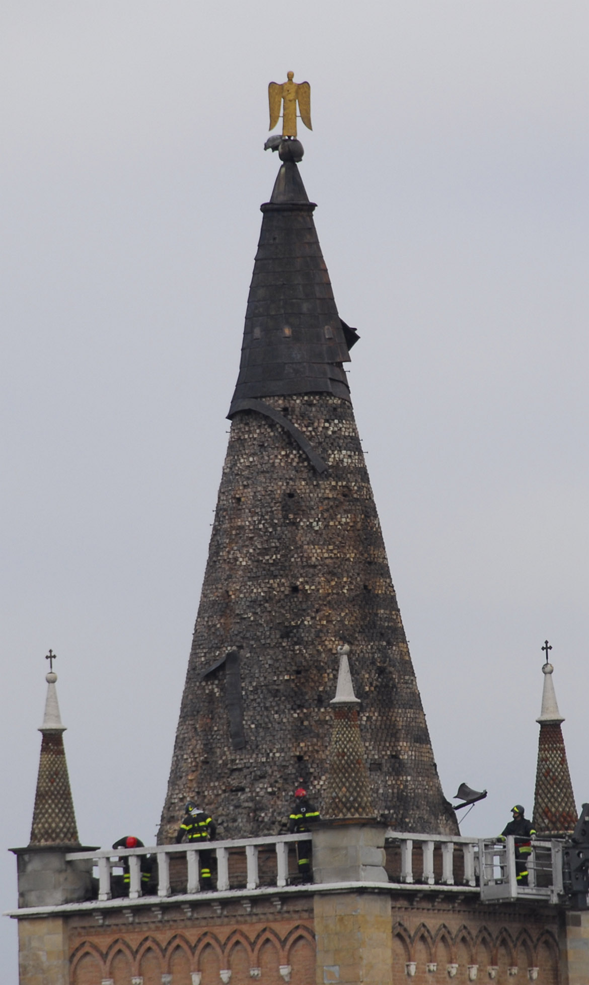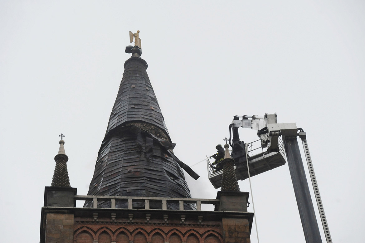L’ intervento dei Vigili del Fuoco, si concentra sul tentativo di spegnere l’incendio rimuovendo il rivestimento esterno in rame per poter estinguere l’incendio del castello ligneo di supporto esterno alla struttura conica in mattoni maiolicati.