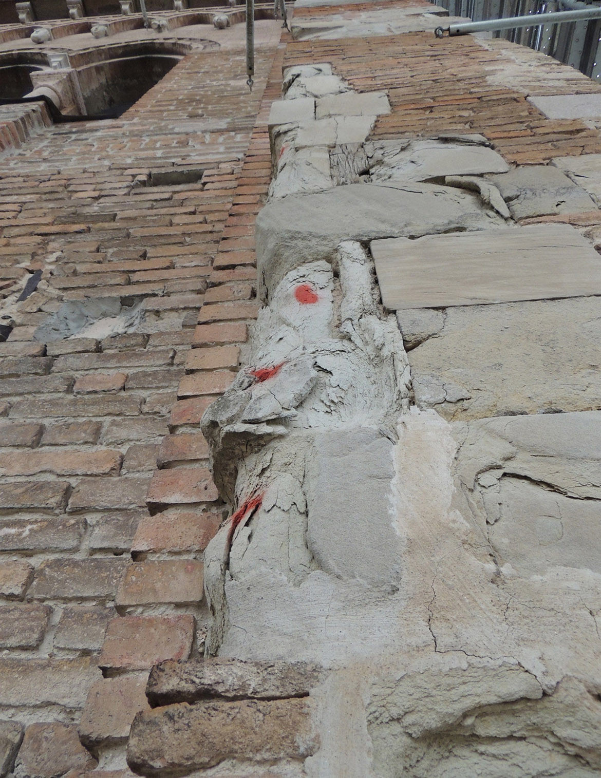 Il ritrovamento della struttura medievale originale della cuspide, eretta agli inizi del XIV secolo a completamento e a copertura del fusto del campanile tardo duecentesco, ancora leggibile nelle sue caratteristiche tipologiche, costruttive e materiche, con la peculiare invetriatura a fasce bicrome alternate dei conci in laterizio, rappresentava l’elemento di maggiore rilevanza critica da salvaguardare. La successione delle manutenzioni documentate dalla fine del XVI secolo mostrava come l’ obiettivo primario sia sempre stato quello di preservare la struttura medievale da ulteriori danneggiamenti, mediante la realizzazione di una copertura protettiva. Questo atteggiamento conservativo ante litteram ha permesso alla struttura antica di conservarsi sostanzialmente inalterata fino ad oggi, priva dei rimaneggiamenti propri dei restauri storici che hanno invece modificato per gran parte di molte altre cuspidi di area padana, tipologicamente simili a quella del campanile della Cattedrale di Parma.