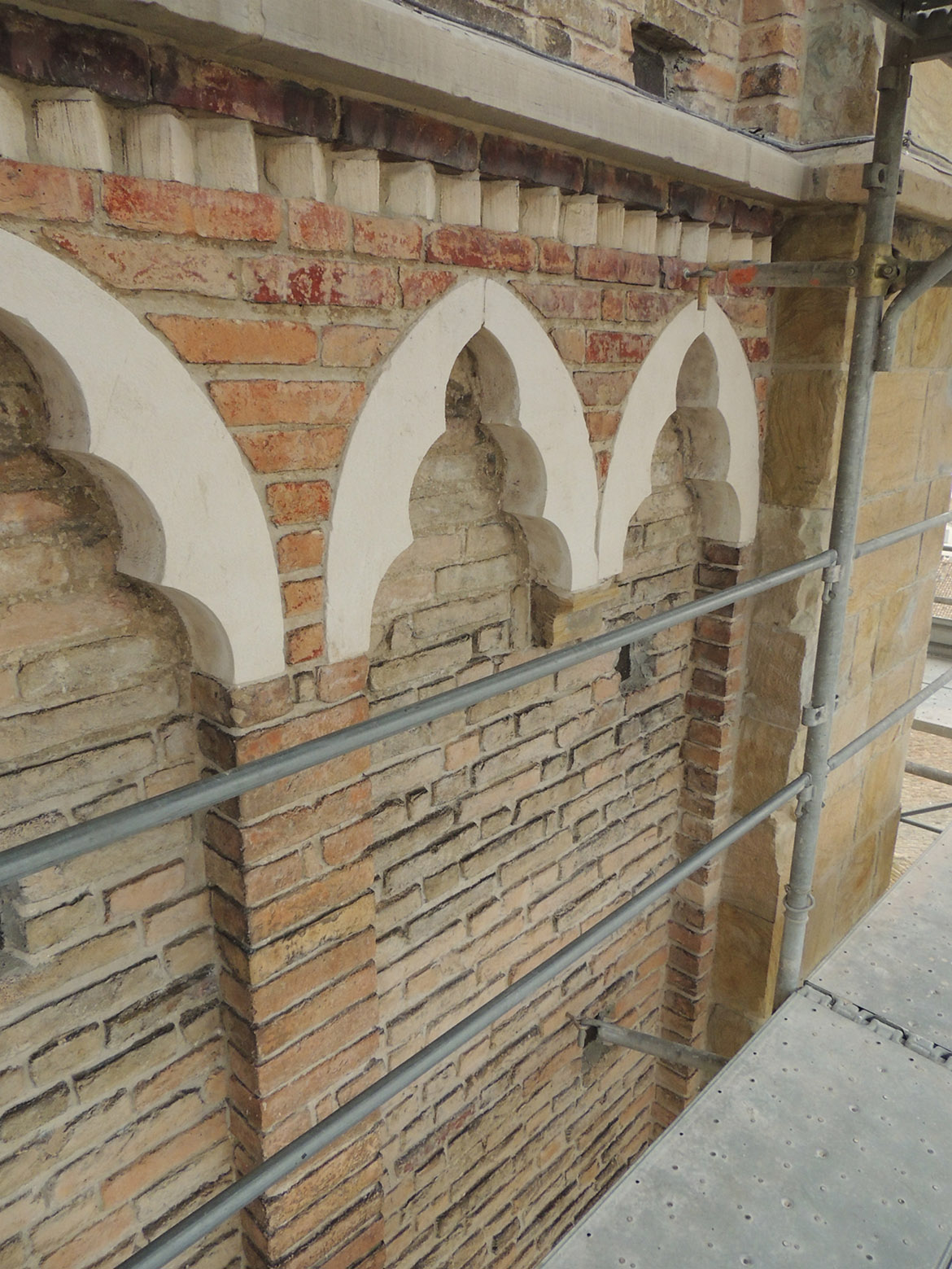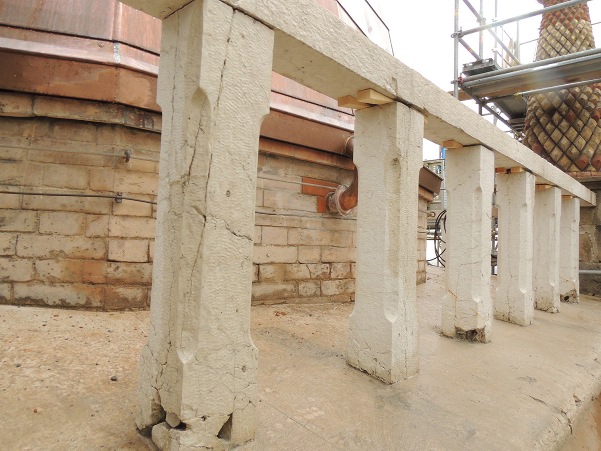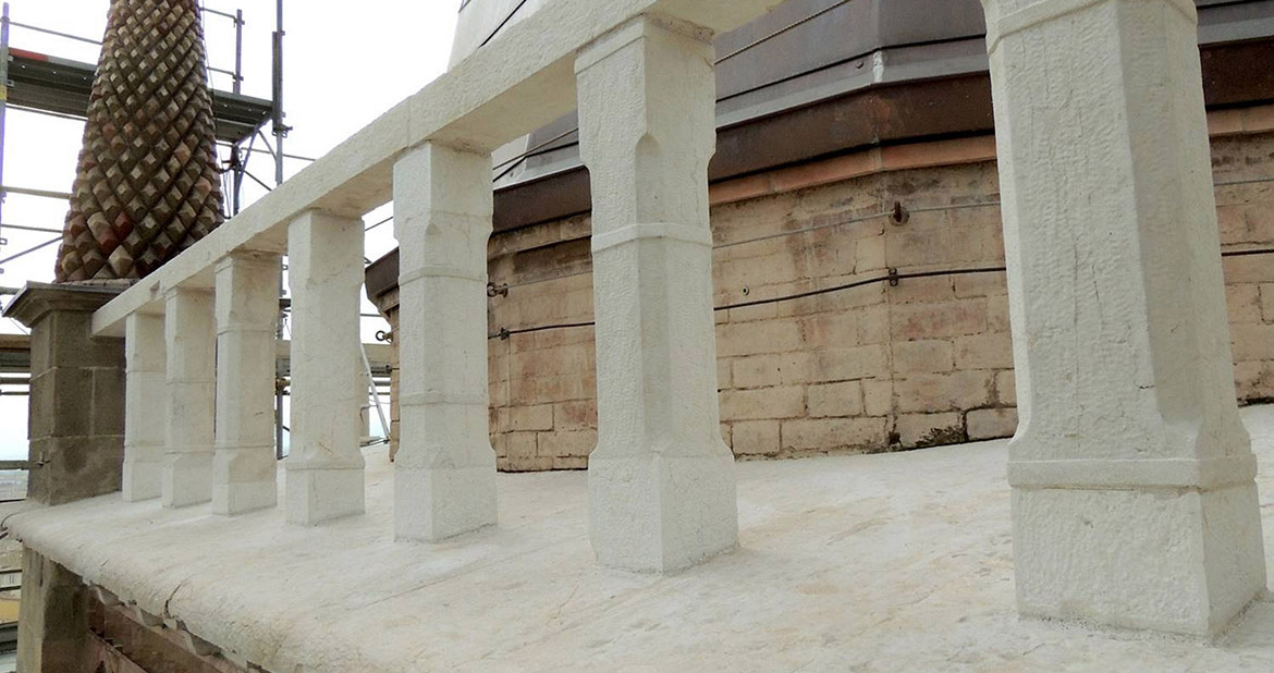 Il sistema della balaustra sommitale è stato oggetto di un intervento articolato, con lo smontaggio completo degli elementi, interessati da un grave processo di degrado. Il rigonfiamento causato dalla ruggine superficiale delle grappe in ferro di fissaggio aveva provocato in più punti la frantumazione dei giunti fra gli elementi. Oltre al trattamento biocida, alla pulitura superficiale e al consolidamento dei conci in pietra con silicato di etile, si sono completate le parti basamentali dei piedritti con inserimento di masselli in biancone di Verona imperniati alla parte rimanente degli stessi plinti con perni in vetroresina e trattati superficialmente a bocciardatura finissima, per omogeneità con la finitura della parte conservata. Nel riassemblare la balaustra sommitale si è inserito un cavo in acciaio inox, ancorato ai pilastri angolari, a cui sono stati solidarizzati tutti i piedritti per evitare la caduta in caso di sisma. Altri consolidamenti puntuali sono stati eseguiti sui capitelli e le colonnine delle bifore fratturati, con rimozione della cerchiatura in ferro ed esecuzione di fasciature in fibra di vetro, ricoperte poi con malta con tono cromatico analogo al materiale lapideo per attenuarne la visibilità.