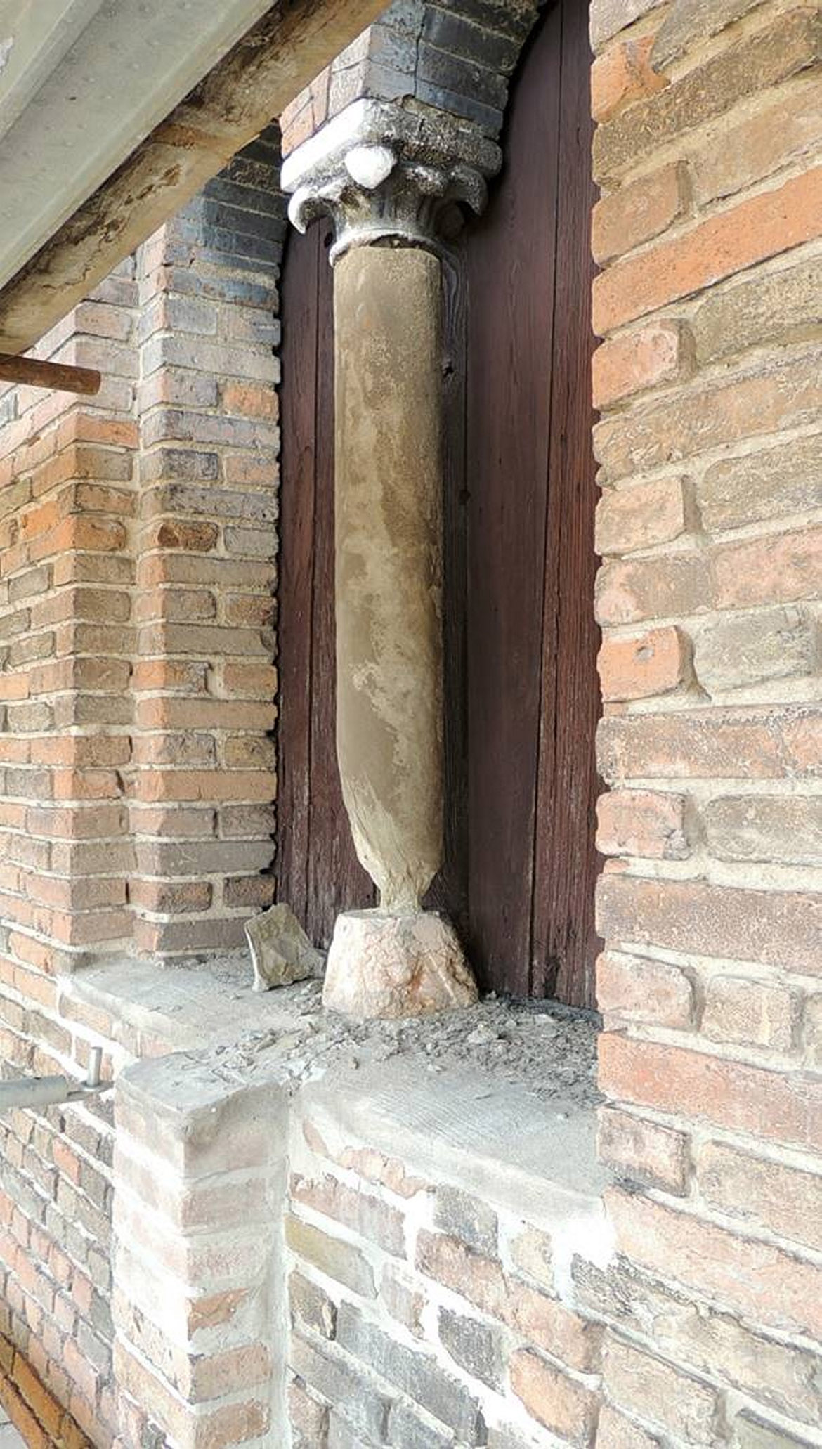 Completate le opere di restauro della parte terminale del campanile, le lavorazioni sono proseguite con il restauro dei fronti. Le opere eseguite sul paramento murario hanno compreso un trattamento biocida su tutte le superfici per eradicare in profondità la patina di muschi e licheni, eseguendone poi il lavaggio con getti di acqua nebulizzata per rimuovere tutte le patine, le polveri e lo smog, recuperando i frammenti dell’antico assetto cromatico. Sui fronti murari sono state chiuse le lesioni superficiali con un mirato intervento a cuci-scuci sul paramento e consolidate le parti lesionate in profondità, con iniezioni di malte fluide. Si sono quindi ristabiliti gli ammorsamenti delle lesene con la muratura retrostante attraverso l’inserimento di dischi piatti in acciaio inox, ancorati a resine epossidica alla struttura muraria, affogati nella malta di allettamento fra i corsi dei mattoni con distanza regolare di circa 90/100 cm. Sui paramenti in pietra, presenti esclusivamente nelle lesene angolari e nelle cornici marcapiano, oltre agli interventi comuni eseguiti anche sui fronti in laterizio, si sono ripristinate le stuccature fra i giunti con malte a calce aerea (grassello) e polveri di marmo con opportuna miscelazione per