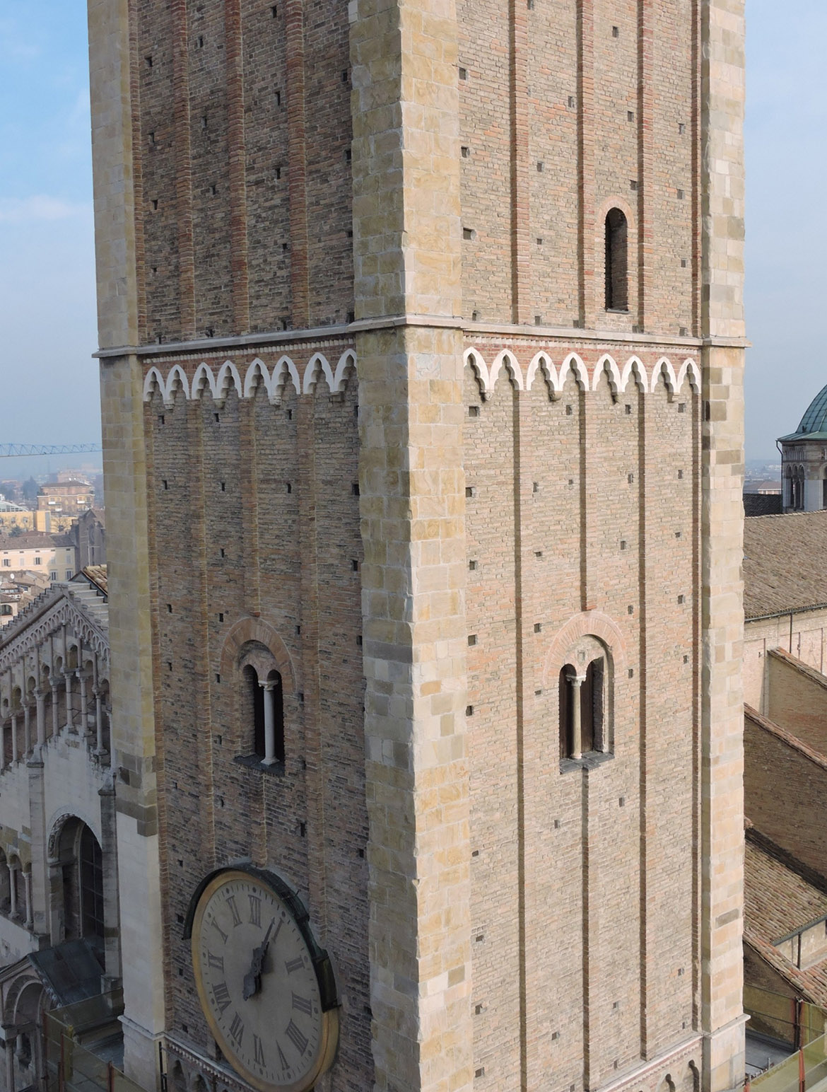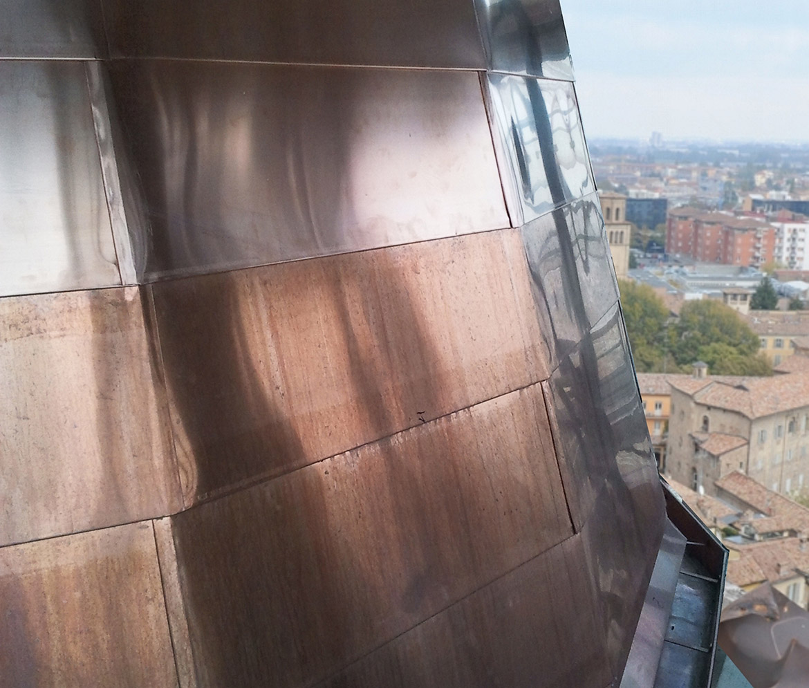 L’intervento sul campanile della Basilica Cattedrale di Parma ha affrontato due aspetti del restauro apparentemente discordanti, ma inscindibili nel progettare il recupero di un edificio di notevole rilevanza storico critica e simbolico identitaria. In particolare il valore storico artistico del manufatto, ha costretto la progettazione dell’intervento a confrontarsi con la sua dimensione materiale storicizzata, mentre l’aspetto tecnico e funzionale, proprio di un intervento di manutenzione, doveva garantirne la conservazione nel tempo delle strutture edilizie storiche, proteggendole dall’azione degli agenti atmosferici.