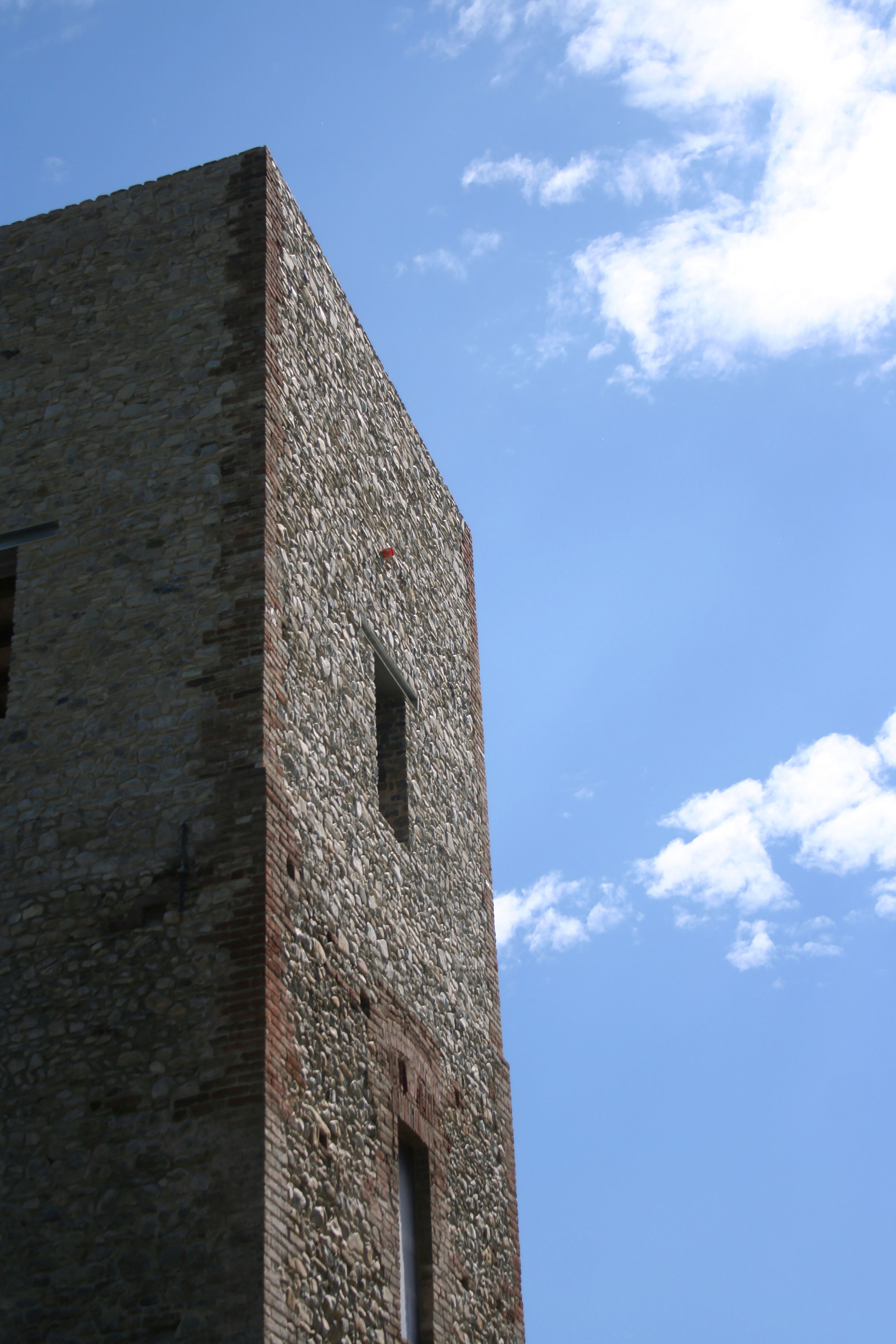1. Riconoscibilità – al volume ricostruito è stata data una connotazione architettonica distinguibile rispetto alle strutture che si sono conservate. In particolare, la colorazione e la tessitura del rivestimento in pietra sbozzata presenta delle leggere differenze, senza però determinare evidenti contrasti materici e morfologici con il vecchio palinsesto. Inoltre, l’ingombro dei lati della parte di torre ricostruita è stato dimensionato con una piccola rientranza, visibile a occhio nudo, in modo da segnalare il nuovo inserto in sottosquadro rispetto al vecchio.