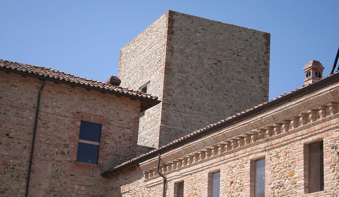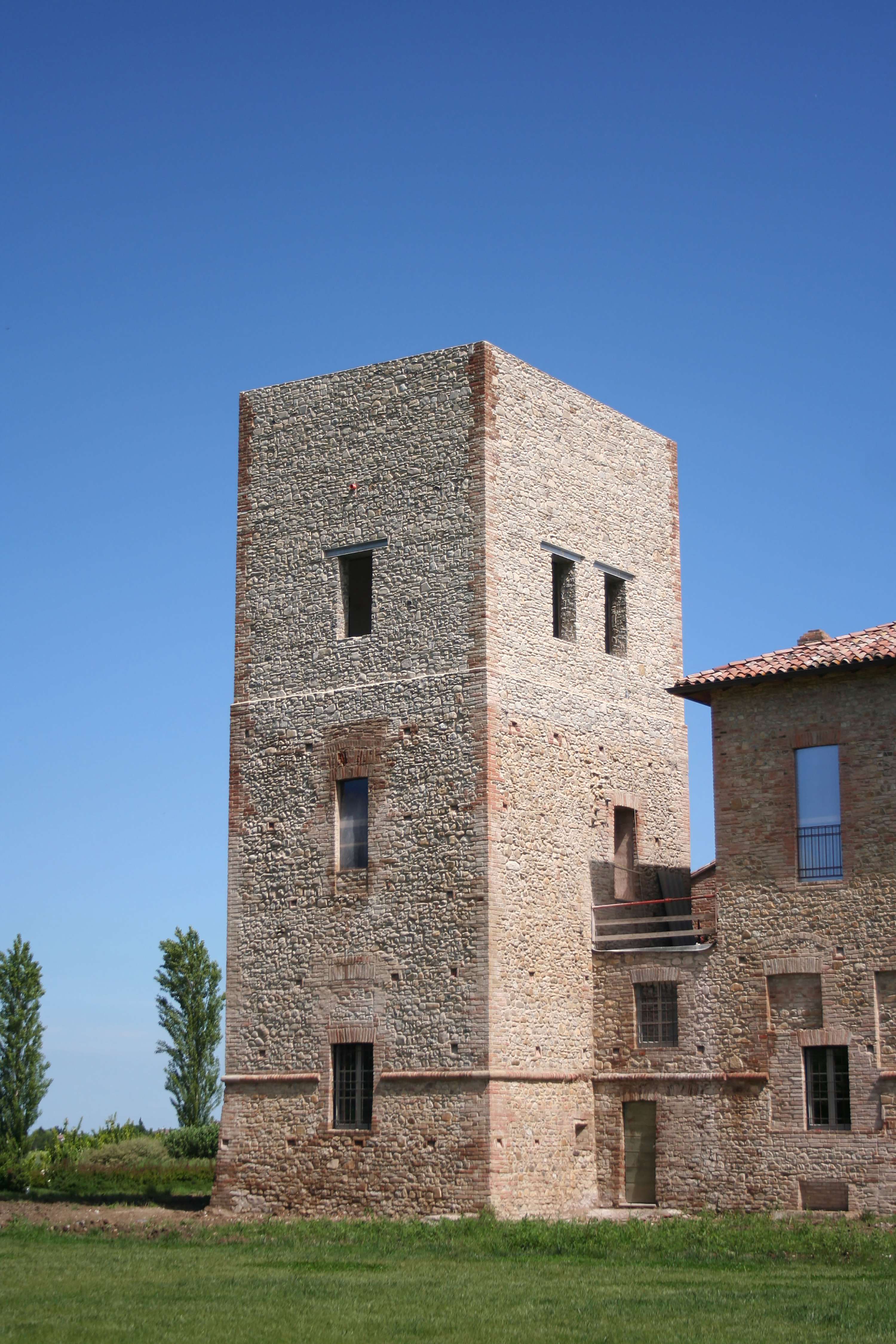 Il complesso architettonico denominato “La Confina”, di proprietà della Famiglia Botti dal 1965, è sito nella località di Frascale di Fiorenzuola d’Arda. Le prime citazioni del podere “La Confina” risalgono ai secoli XII- XIV, quando venne edificato il primo nucleo della “casa-torre”, attorno al quale nei secoli successivi si svilupparono la villa padronale e i vari fabbricati agricoli. Il nuovo progetto di restauro prevede di restituire alla casa-torre della Confina la sua configurazione volumetrica d’insieme, adottando tecniche e materiali perfettamente distinguibili dal paramento murario della compagine conservata. Tutto il paramento murario oggetto di reintegro è stato realizzato utilizzando proporzioni e forme dell’impianto originario come desunto nei rilievi.