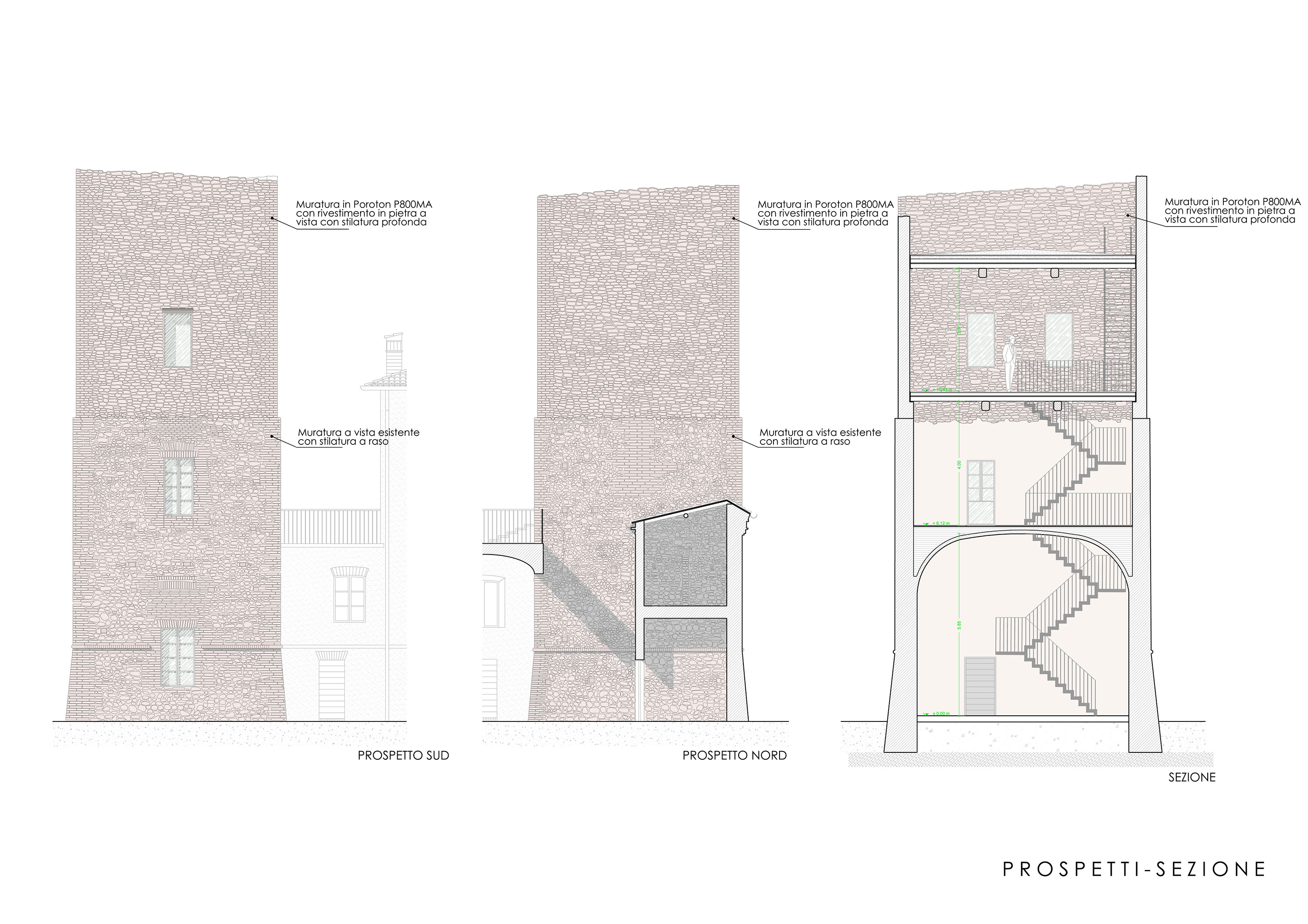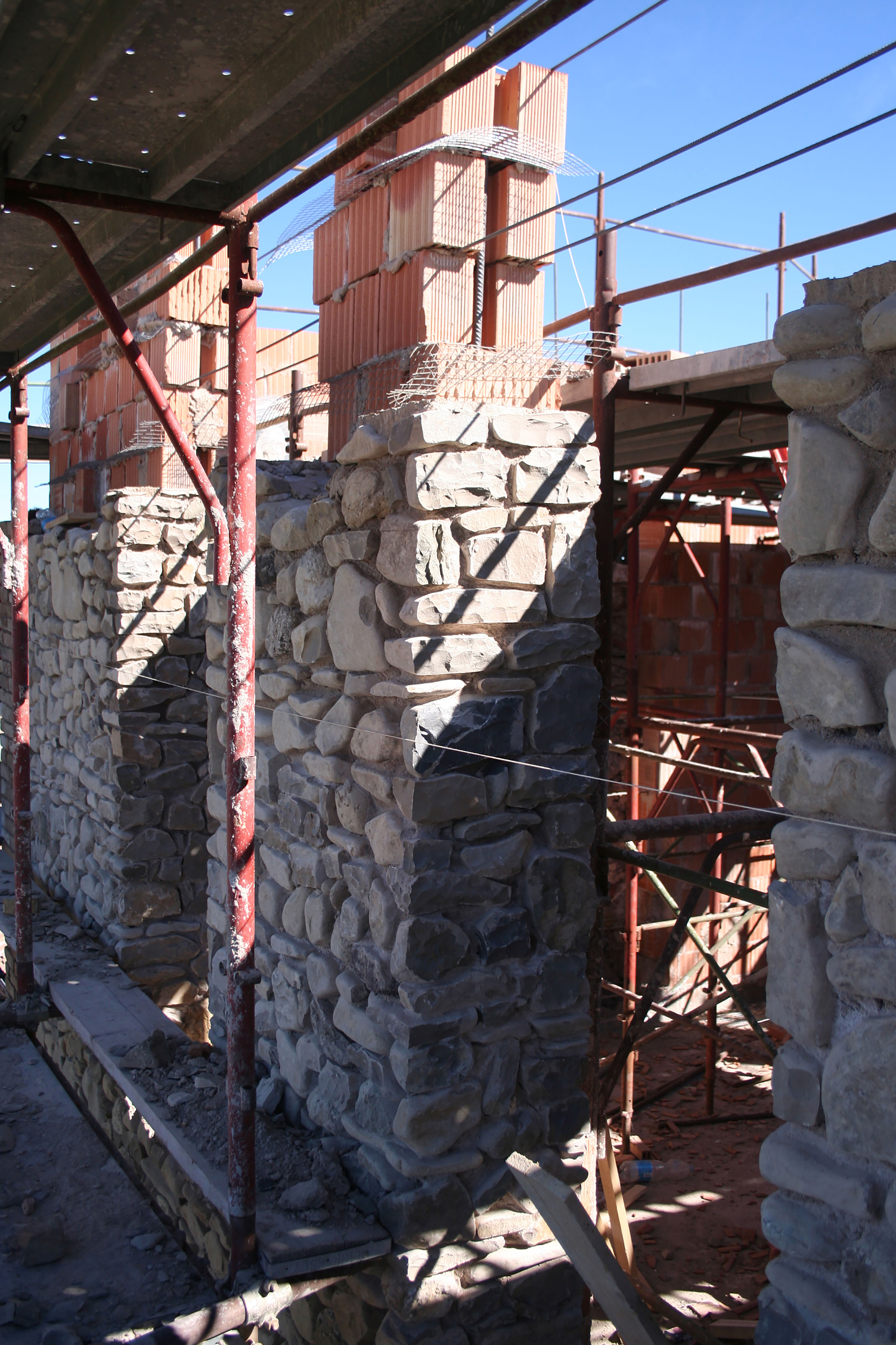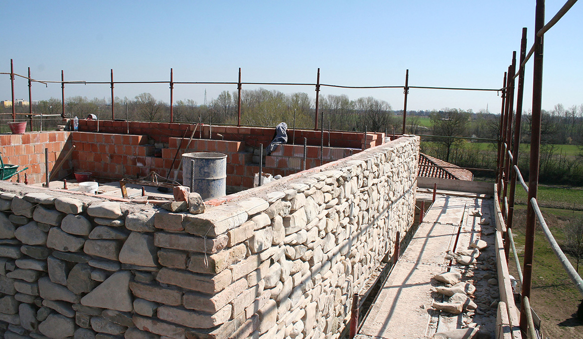 Per l’edificazione del nuovo volume sono stati utilizzati blocchi di dimensioni 30 X 19 X 21 cm come muratura portante, mentre il rivestimento murario in pietra è stato realizzato con ciottoli sbozzati di dimensioni variabili da 5 a 30 cm, allettati con malta di calce aerea e rifiniti da una stilatura profonda; i cantonali con mattoni cotti di recupero, di dimensioni pari a 28 x 12 x 7 cm, allettati con malta di calce aerea.