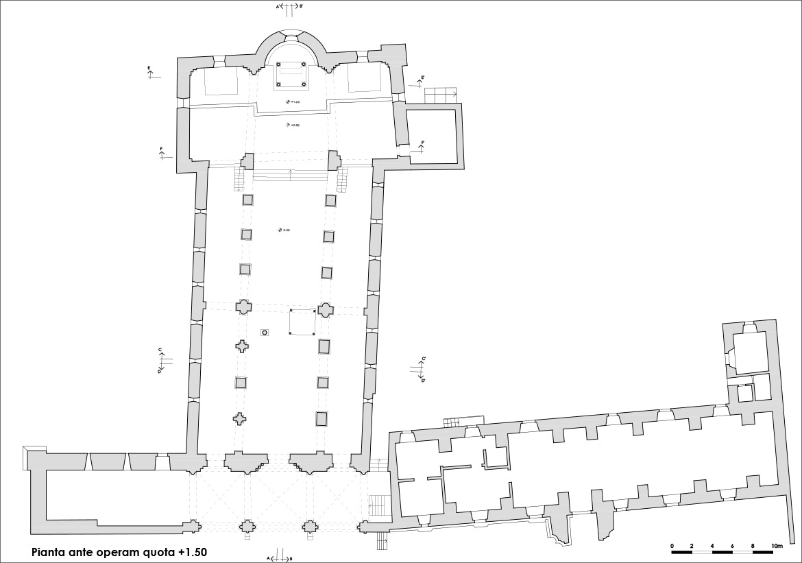 L’abbazia era stata gravemente danneggiata dal terremoto del 6 aprile 2009, che aveva causato il drammatico crollo del muro di timpano posteriore della navata centrale sui magnifici apparati scultorei del cero e dell’ambone pasquale conservati dentro la chiesa (Fig. 2). Il progetto veniva intrapreso solo poche settimane dopo il terremoto, grazie all’impegno del World Monuments Fund e della Fondazione Pescarabruzzo, che insieme prendevano la determinazione di finanziare le opere di restauro. I tempi furono molto serrati: il progetto, redatto in poche settimane, era presentato in conferenza stampa il 1 luglio 2009, la gara d’appalto vinta dalla ditta Cingoli Nicola e Figlio, i lavori cominciati il 27 gennaio 2010 e terminati l’8 aprile 2011, due anni e due giorni dopo l’evento sismico.