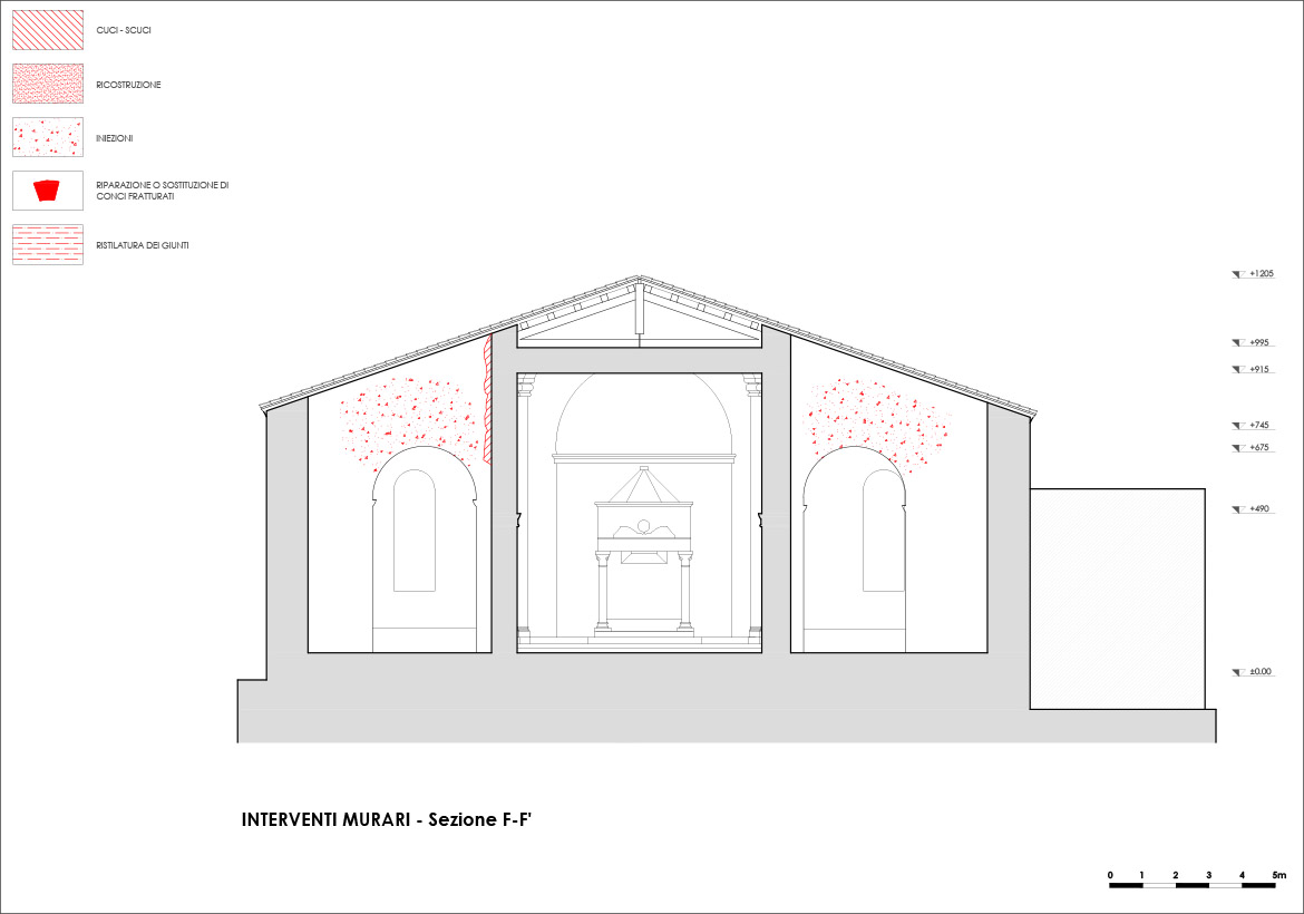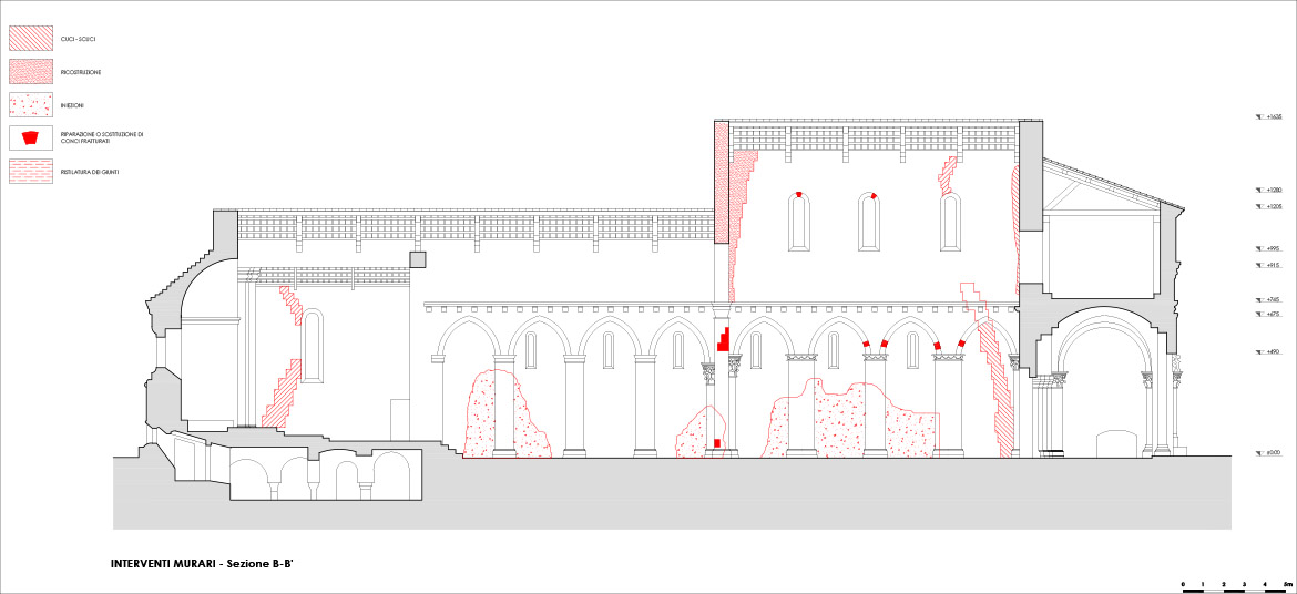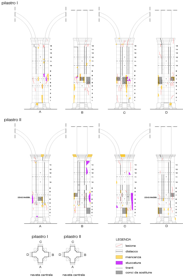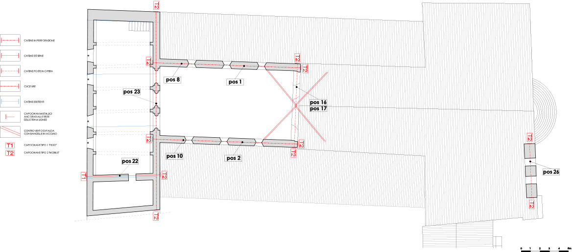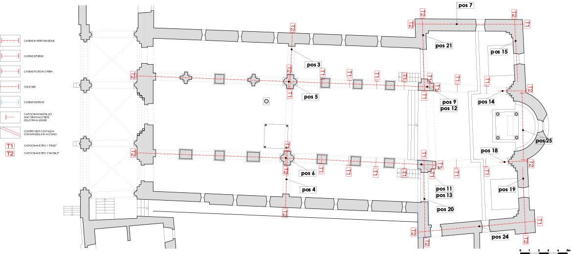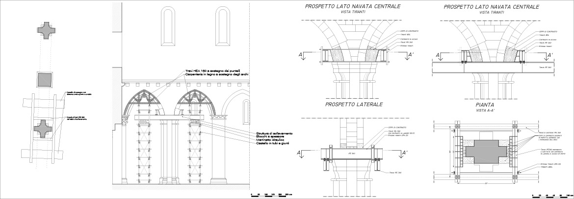 La direzione dei lavori propese nettamente per la seconda soluzione sia a fronte degli impegni assunti nei confronti degli enti finanziatori in quanto a finanziamento e tempi di realizzazione, sia, soprattutto, per il carattere molto invasivo che un intervento di isolamento sismico alla base avrebbe comportato. Molto spesso l’intervento su un bene storico-artistico deve trovare una sintesi tra due istanze egualmente nobili, quella della sicurezza e quella della conservazione e troppo spesso con una presunta necessità di garantire la sicurezza del bene sono stati irrimediabilmente compromessi la stessa natura materica e strutturale del bene.