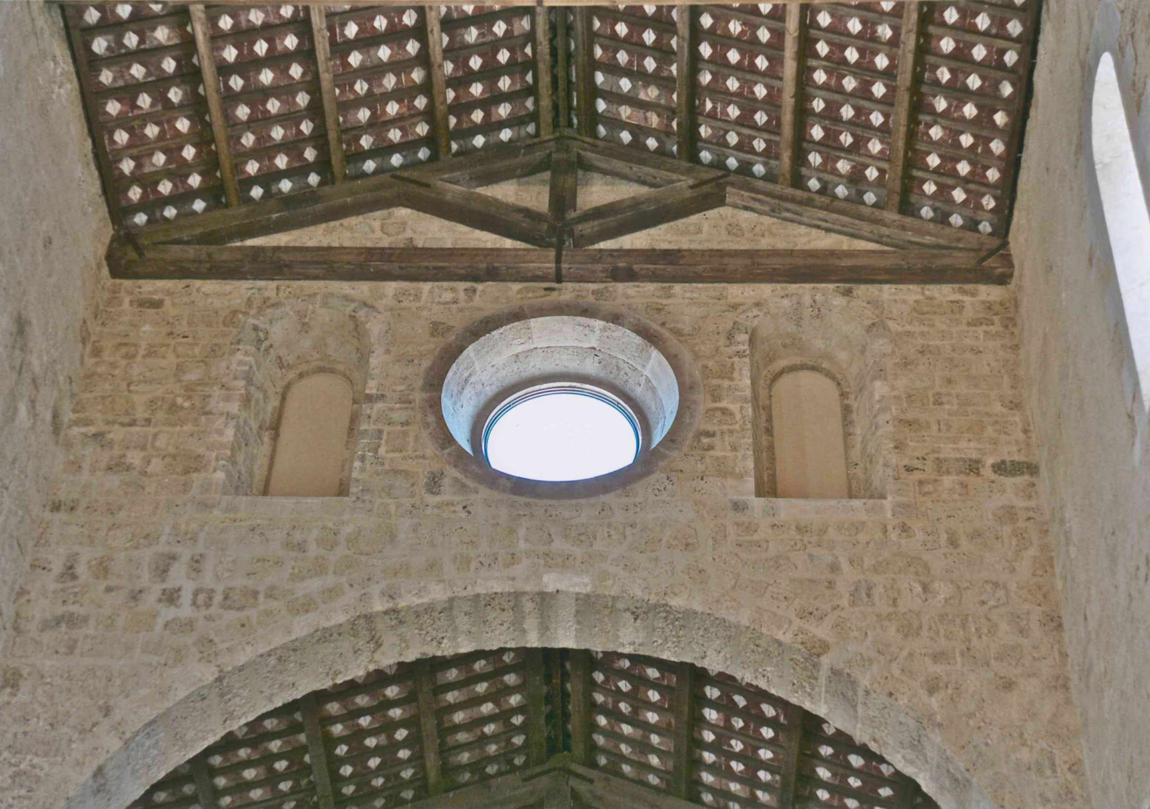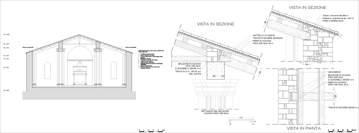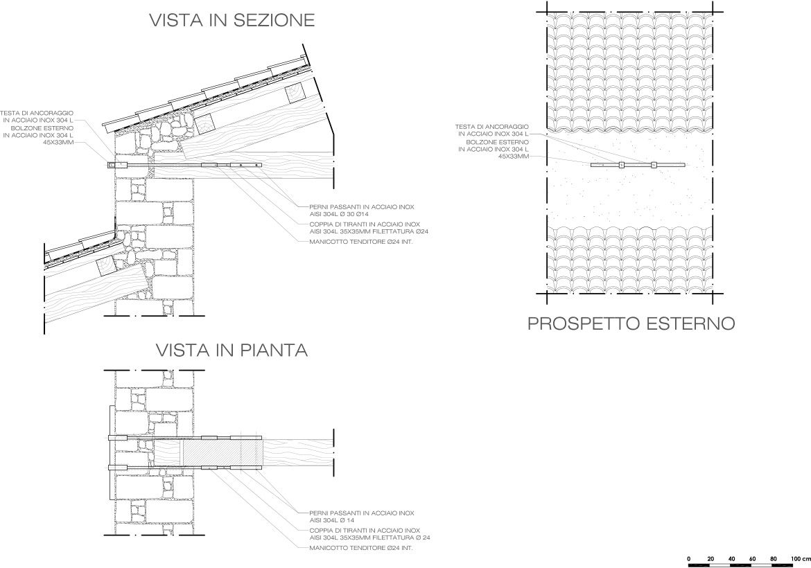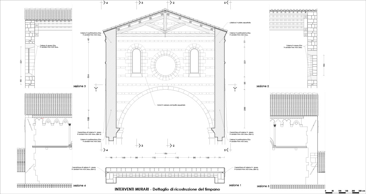 Nel caso in specie, tuttavia le estremità del radiciamento erano compromesse e le staffature metalliche completamente corrose; inoltre, la discontinuità nella struttura muraria indotta dalla presenza della trave lignea, non aveva giovato alla risposta sismica fuori dal piano e la trave incassata nella muratura aveva costituito una sorta di cerniera cilindrica intorno alla quale si era manifestato il moto di ribaltamento che aveva portato al collasso del muro di timpano. In sostituzione della trave lignea rinvenuta, alla quota di estradosso del nuovo arcone, veniva disposto il tirante costituito da una coppia di barre di acciaio inox di diametro 24 mm, incassate nella muratura e munite di bolzoni esterni; una catena analoga era prevista sulla sommità della parete, alla quota di estradosso dell’oculo.
