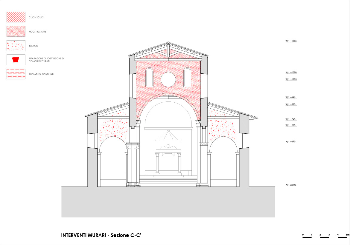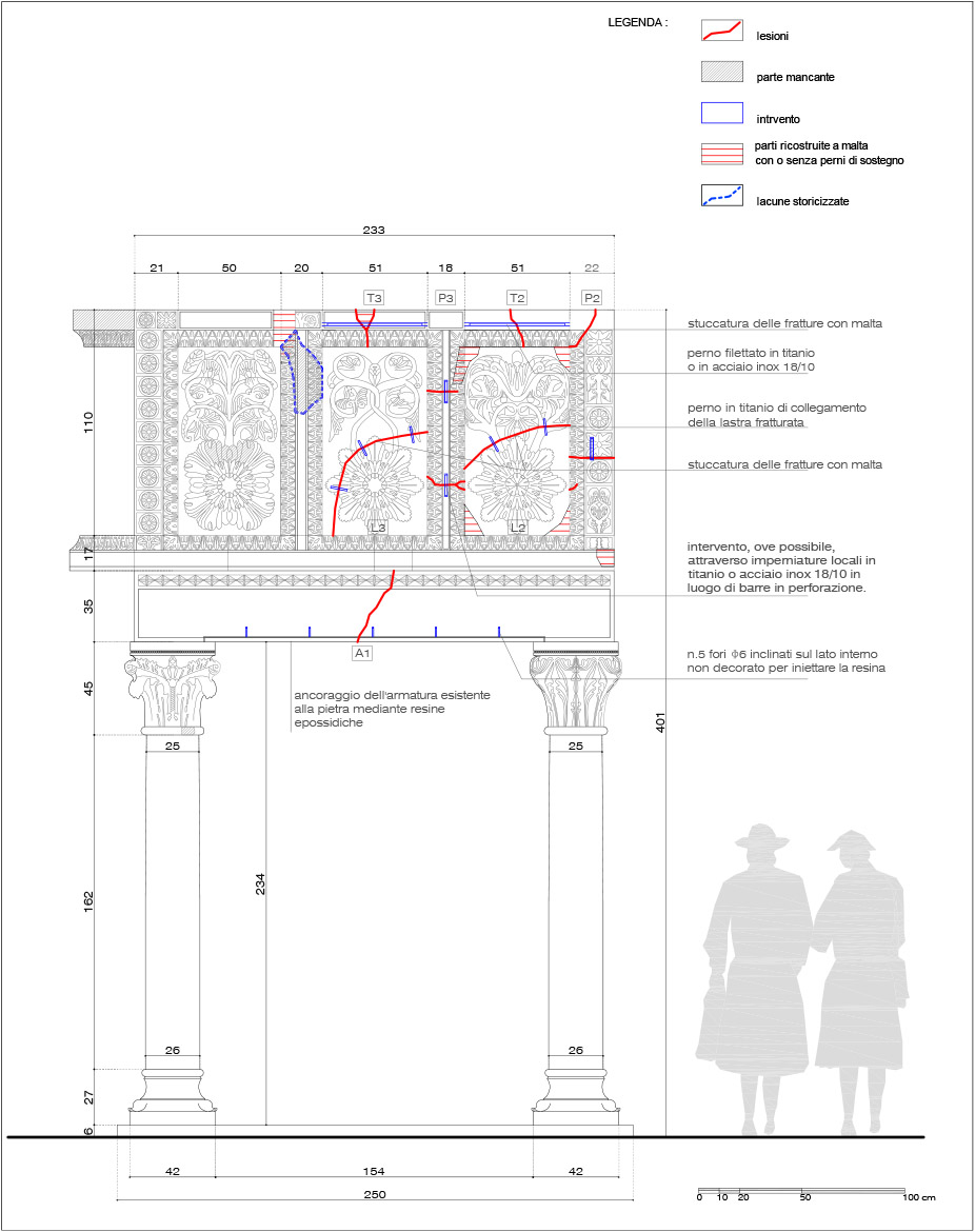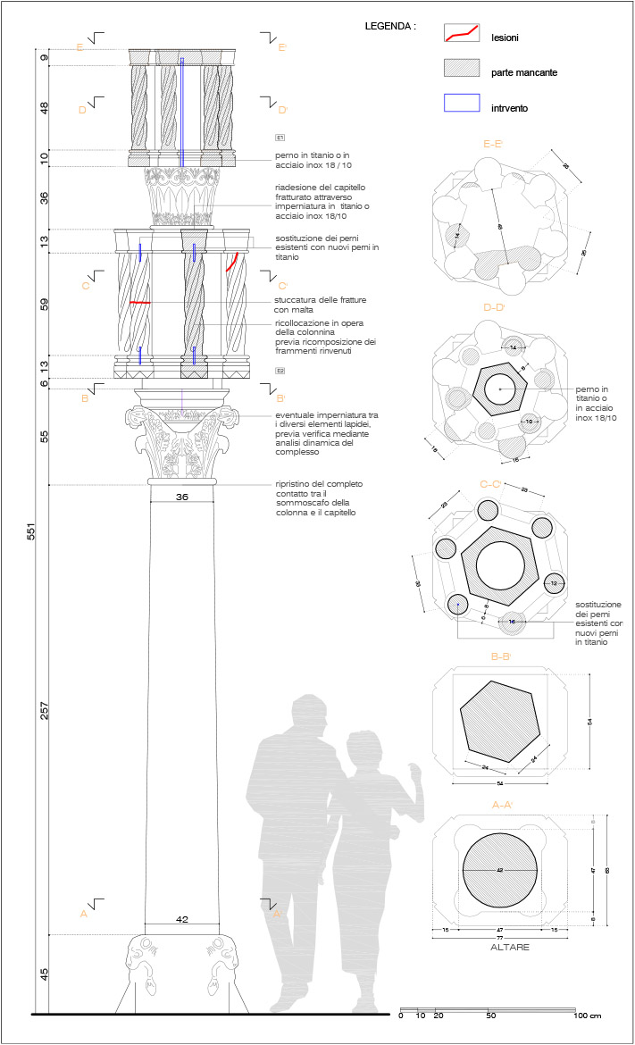 Le soluzioni che si prospettavano erano essenzialmente due: (i) lo smontaggio integrale dell’ambone, il successivo rimontaggio e ricomposizione su di una piattaforma isolata alla base per garantirne la sicurezza nei futuri eventi sismici; (ii) lo smontaggio della parte dell’ambone sopra il calpestio, il rinforzo e la messa in pristino degli architravi, la risarcitura delle lesioni delle lastre di calpestio e il rimontaggio di tutto il sistema della balaustra, una volta ricomposte le lastre fratturate dei plutei, i piedritti e i corrimano di coronamento.