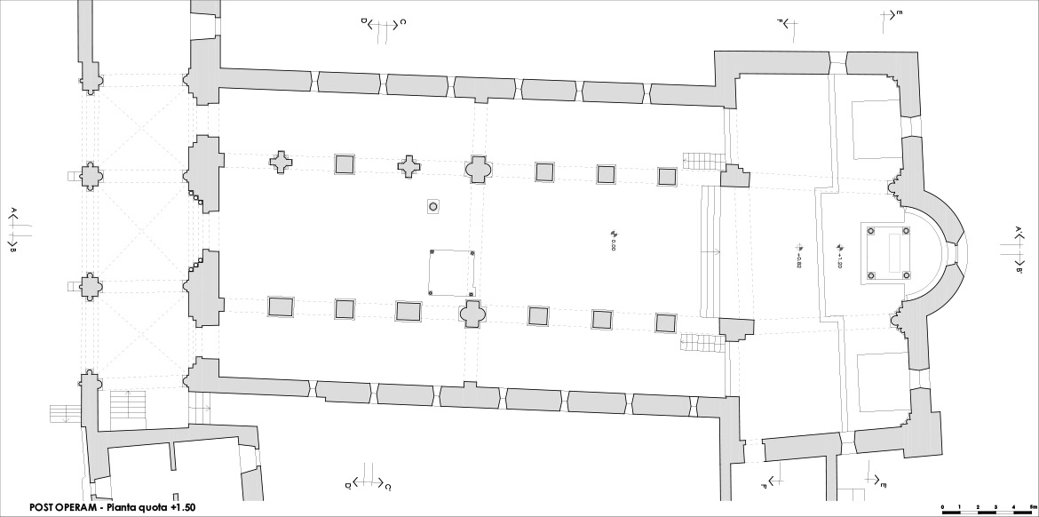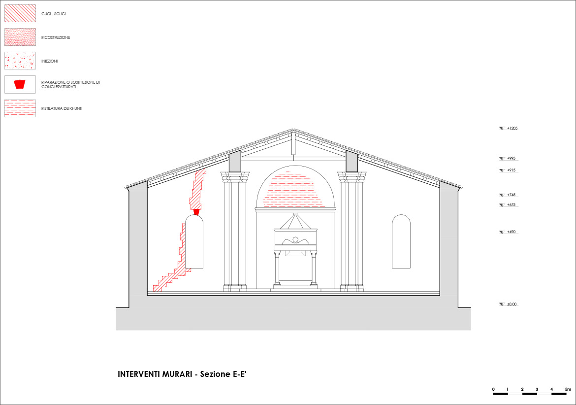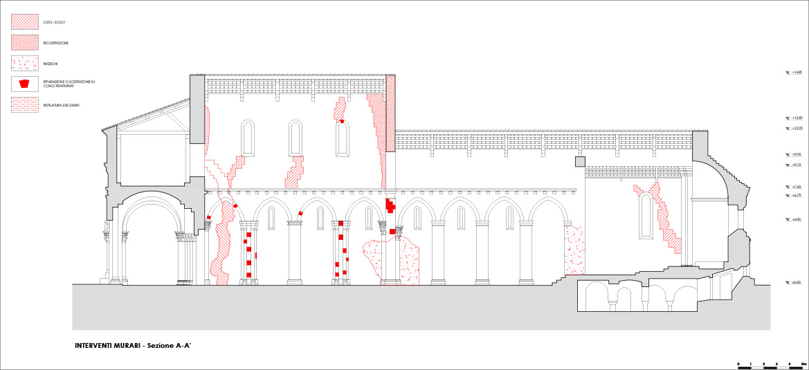 Il progetto di restauro muove dalla lettura dei gravi dissesti che la chiesa aveva manifestato nell’evento sismico del 6 aprile 2009, individuando, secondo una prassi ormai consolidata, i macro- elementi strutturali ed i meccanismi di danno e/o collasso che si erano manifestati e proponendo la ricostruzione delle parti crollate o severamente compromesse dal sisma, attraverso il medesimo linguaggio murario che è proprio della costruzione originaria, opportunamente ricondotto alla regola dell’arte e corretto nei difetti e nelle anomalie costruttive, senza però stravolgere il funzionamento strutturale d’insieme (Giuffrè, 1991). E quindi: le parti crollate ricostruite in muratura, le lesioni risarcite mediante la tecnica tradizionale del cuci-scuci, le parti interessate da lesioni diffuse o fenomeni di schiacciamento rigenerate attraverso adeguate iniezioni di miscele consolidanti di calce idraulica naturale. Inoltre, nel progetto, venivano messi a punto gli interventi strutturali necessari a garantire un livello di sicurezza adeguato rispetto ai meccanismi evidenziati dal sisma, attraverso l’inserimento di catene atte a realizzare il collegamento tra le murature ed evitare l’insorgere dei meccanismi di collasso locali, nello spirito del miglioramento sismico, secondo quanto disposto dalle linee guida per la valutazione e la riduzione del rischio sismico del patrimonio culturale.